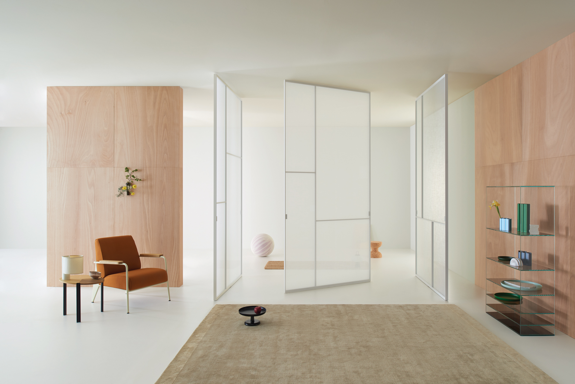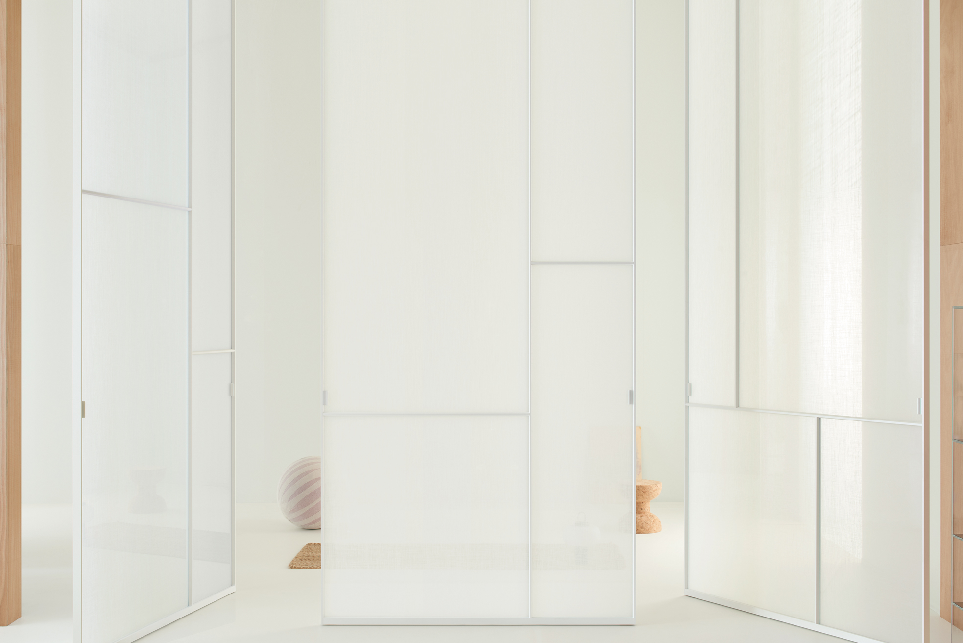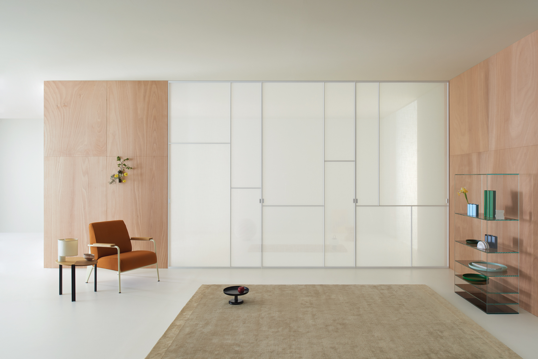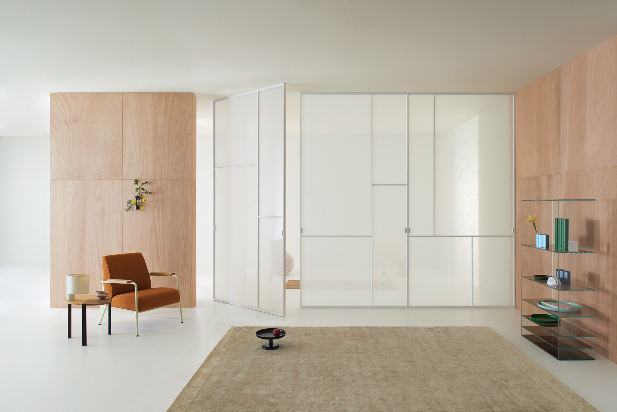 With its vertical pivoting rotary movement and adjustable pivot hinges, the Sherazade Patchwork Spin panel allows for a wide range of design possibilities. The door WITHOUT A STOP can be ordered with an offset or central pivot, and it always opens in both directions. 360 degrees of rotation are possible with the version with a central pivotSplits that are partially or fully openable can be configured by aligning two or more panels side by side. A magnetic system ensures that the panels are perfectly aligned. The door's surface is separated into four panels, each of which can hold a different kind of 6 mm tempered glass that is either stratified 3+3 mm or monolithic. With the exception of 533. Retinato, the glass is certified in compliance with ANSI Z97.1 and UNI EN12150 safety standards. It is offered in a variety of finishes. There are also wooden or ceramic panels available in various veneers and finishes. The aluminium profile that houses the upper hinge's body is meant to be painted to match the wall finish and inserted flush with the false ceiling.