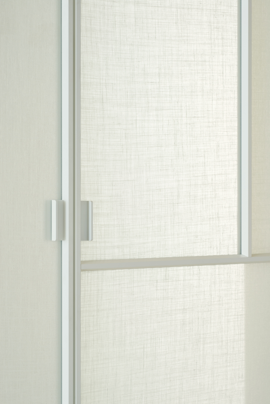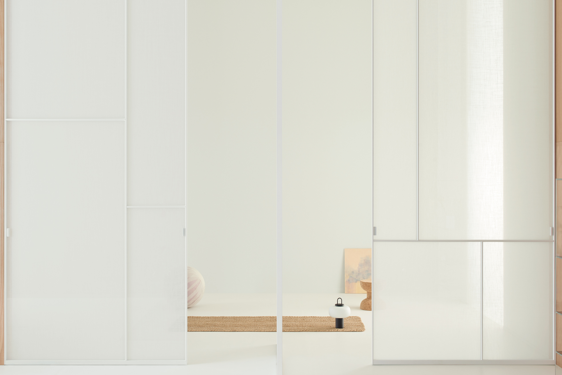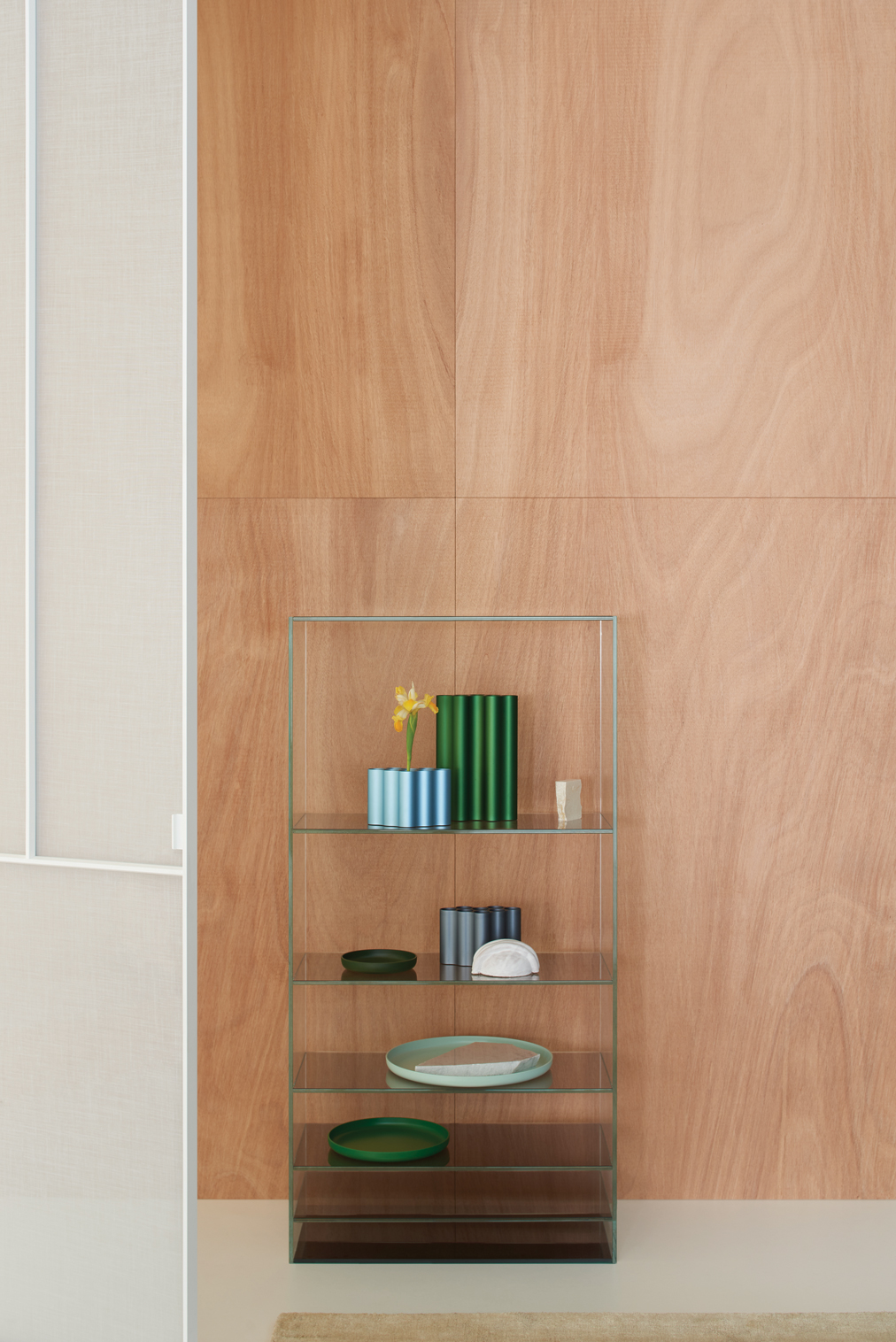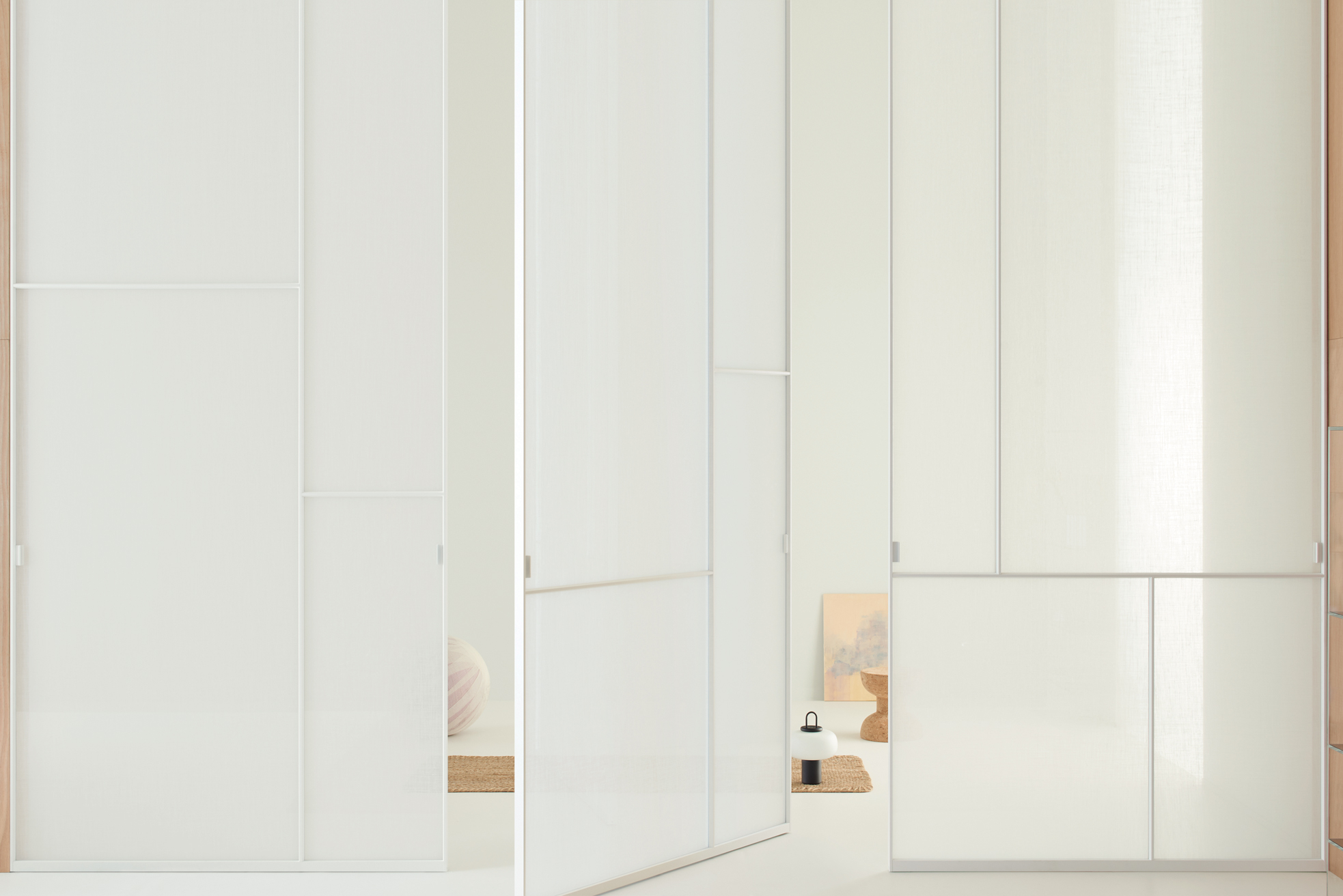 With its vertical pivoting rotary movement and adjustable pivot hinges, the Sherazade Patchwork Spin panel allows for a wide range of design possibilities. The door WITHOUT A STOP can be ordered with an offset or central pivot, and it always opens in both directions. 360 degrees of rotation are possible with the version with a central pivotSplits that are partially or fully openable can be configured by aligning two or more panels side by side. A magnetic system ensures that the panels are perfectly aligned. The door's surface is separated into four panels, each of which can hold a different kind of 6 mm tempered glass that is either stratified 3+3 mm or monolithic. With the exception of 533. Retinato, the glass is certified in compliance with ANSI Z97.1 and UNI EN12150 safety standards. It is offered in a variety of finishes. There are also wooden or ceramic panels available in various veneers and finishes. The aluminium profile that houses the upper hinge's body is meant to be painted to match the wall finish and inserted flush with the false ceiling.