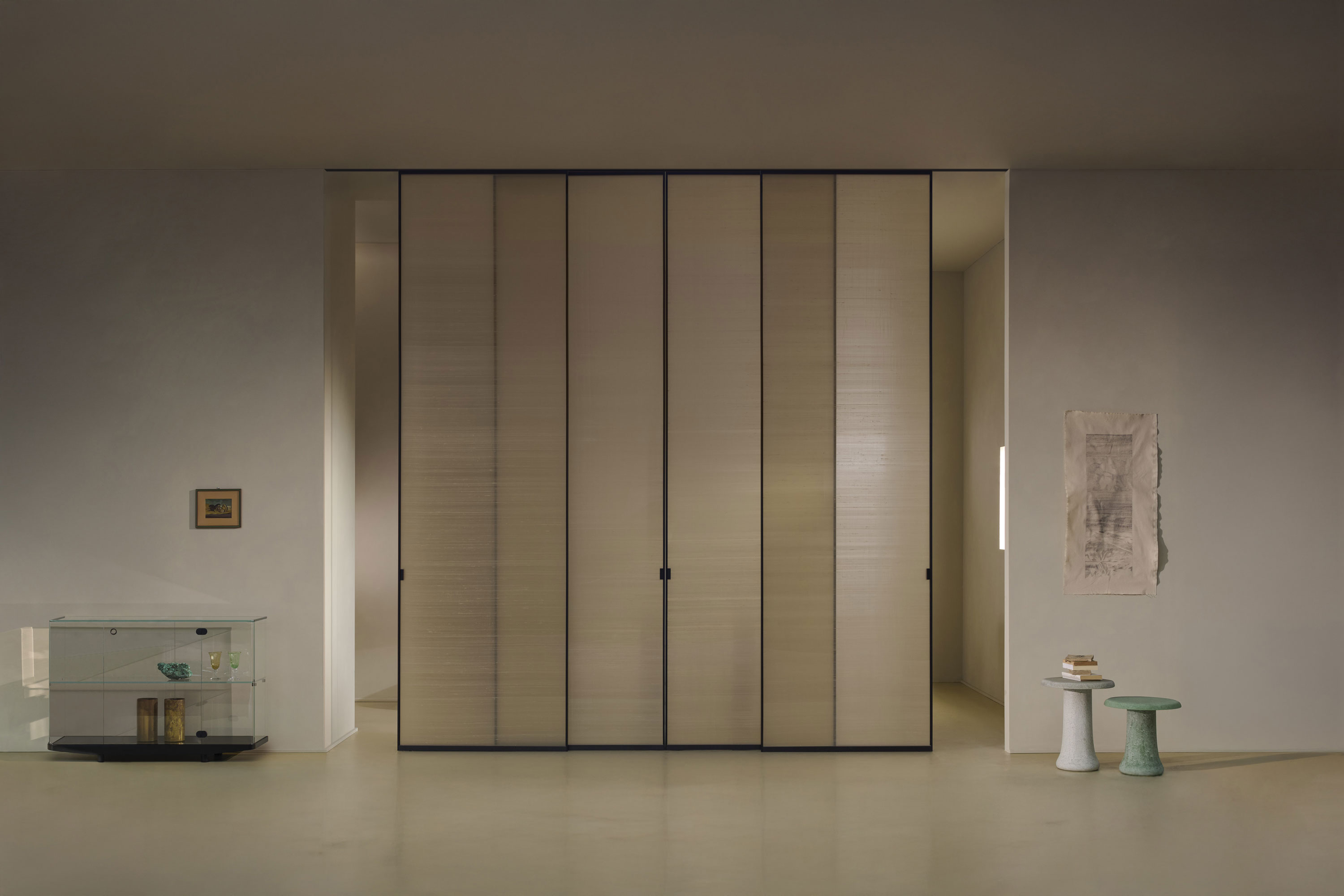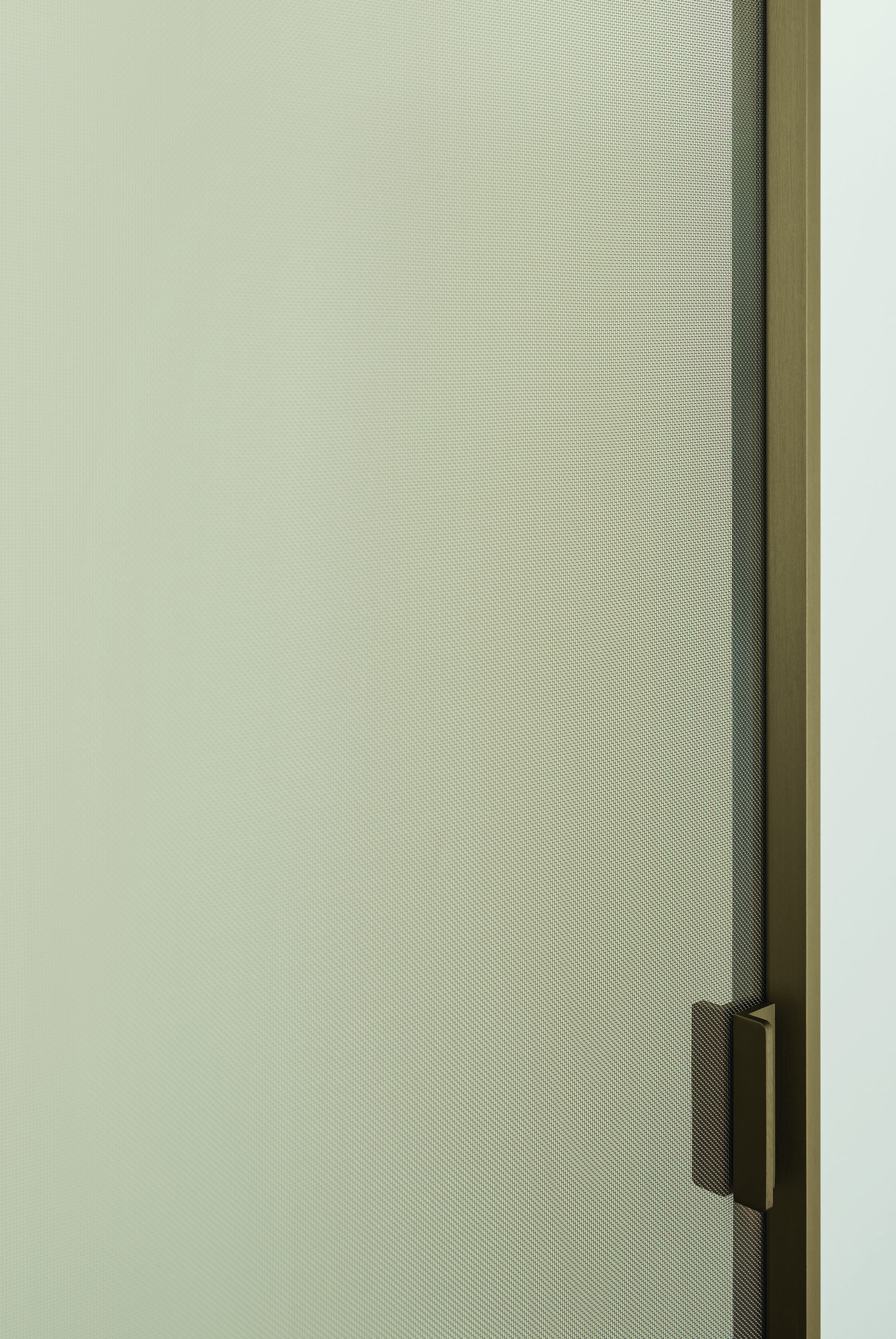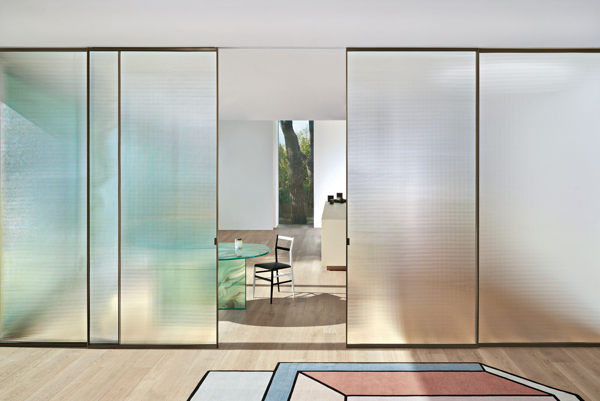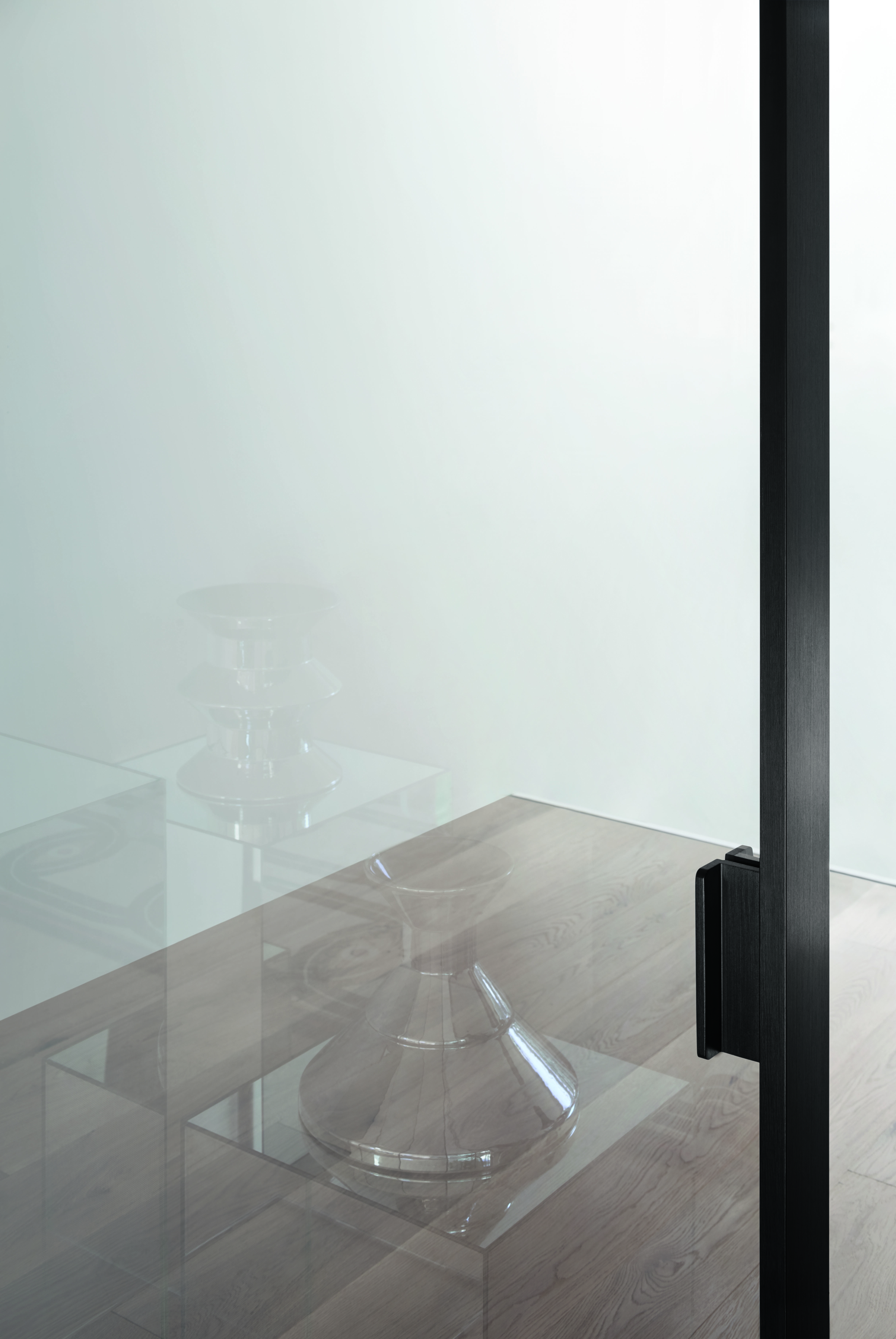 The glass panels, offered in an extensive palette of finishes, meet ANSI Z97.1 and UNI EN12150 safety standards (except 533. armato). Additional panel options in stoneware and a curated selection of wood finishes and essences allow for seamless integration into luxury interiors.
