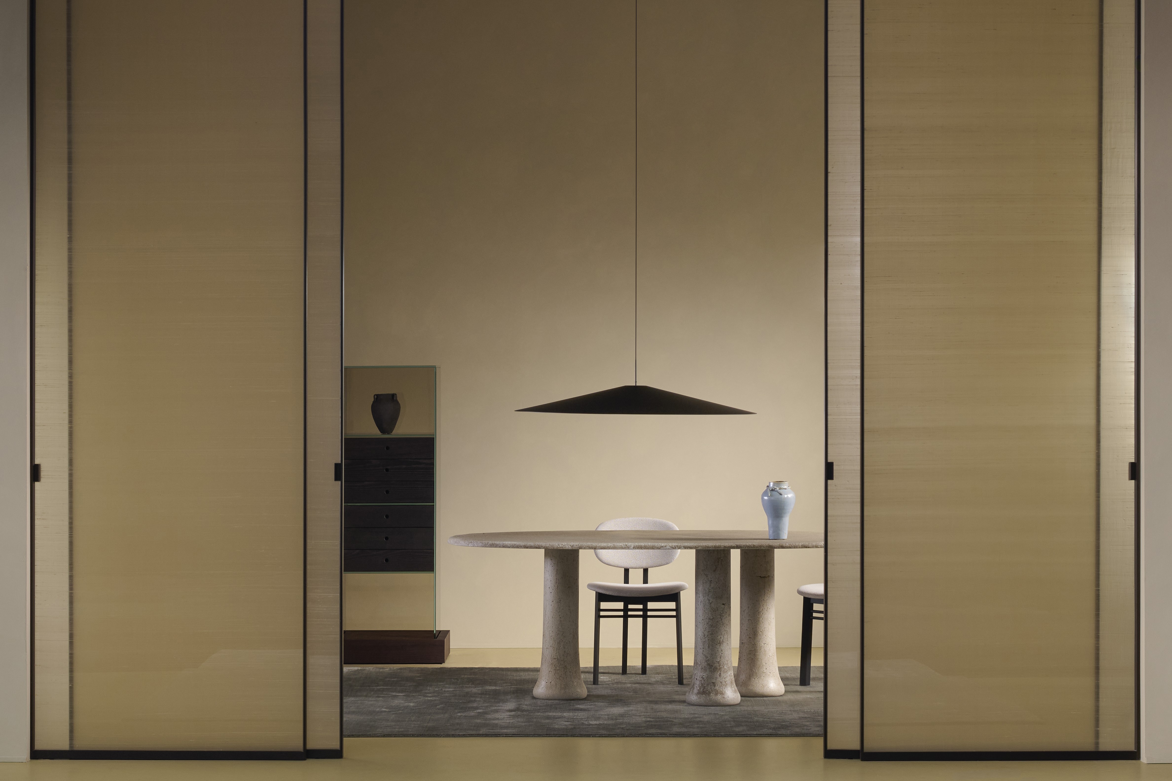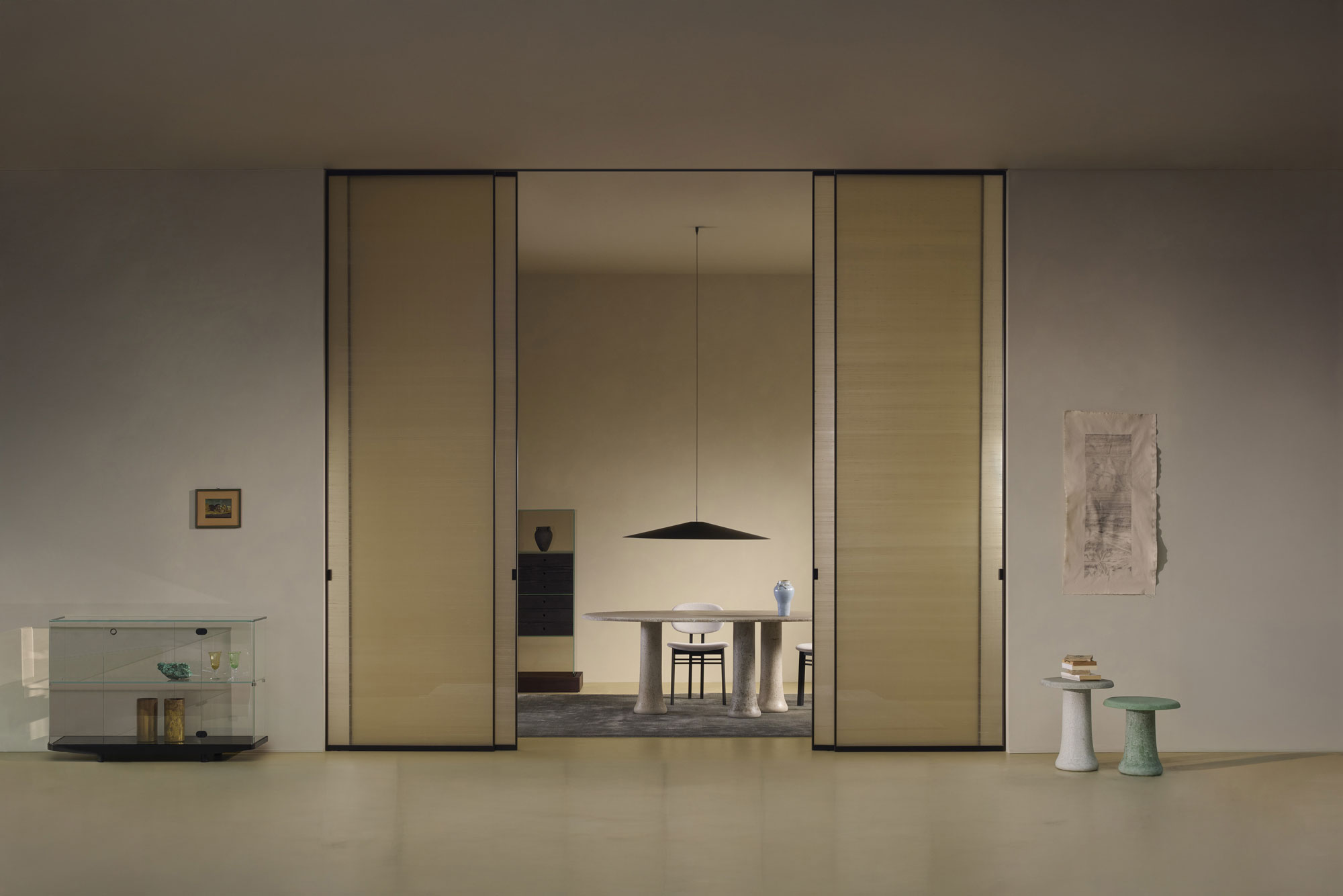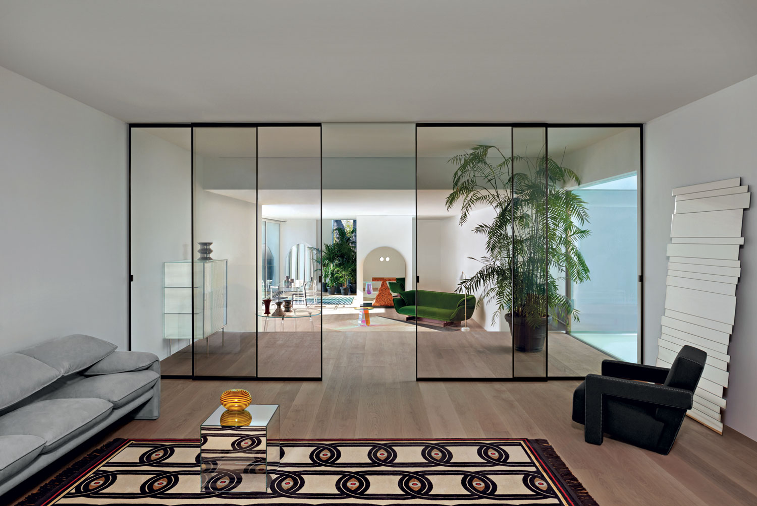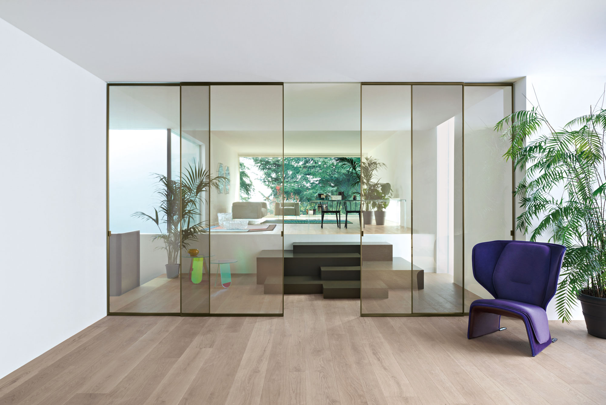 The glass panels, offered in an extensive palette of finishes, meet ANSI Z97.1 and UNI EN12150 safety standards (except 533. armato). Additional panel options in stoneware and a curated selection of wood finishes and essences allow for seamless integration into luxury interiors.