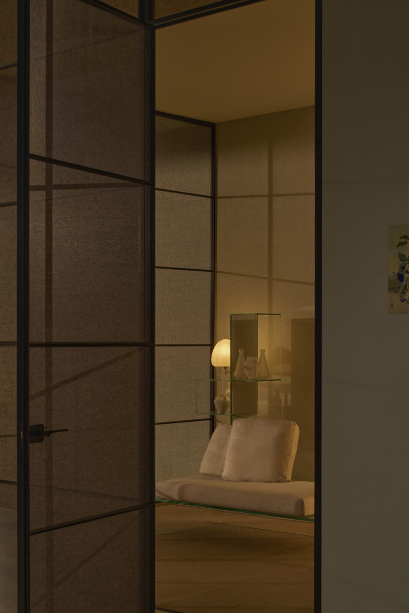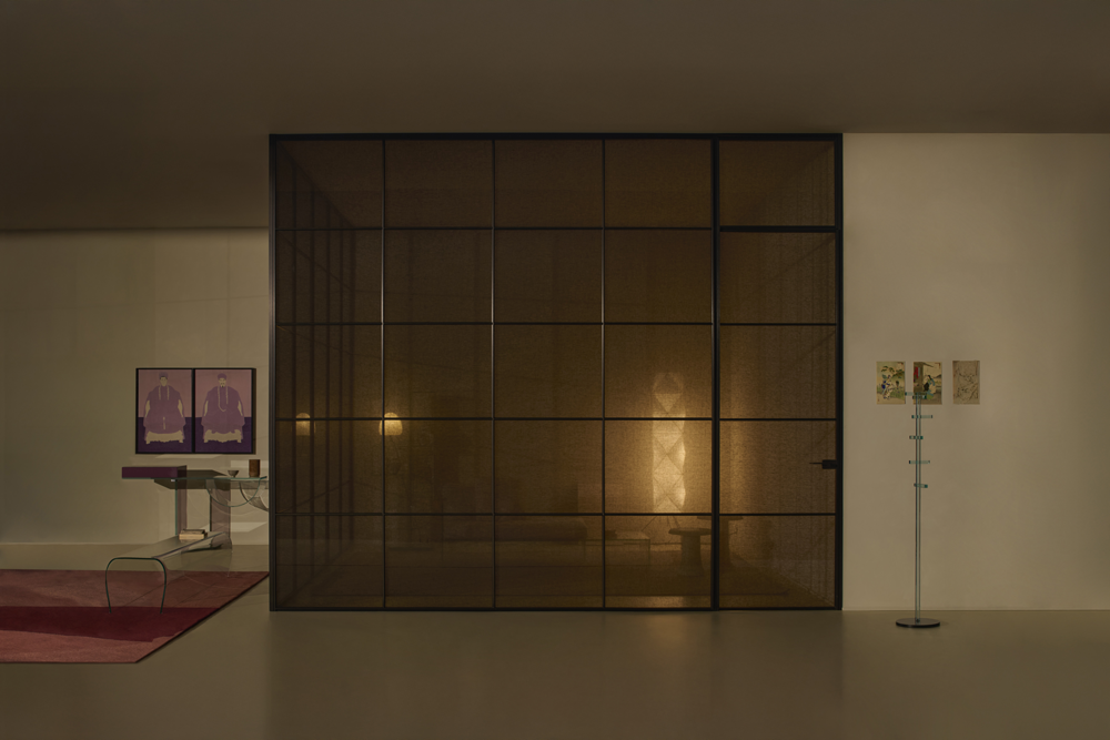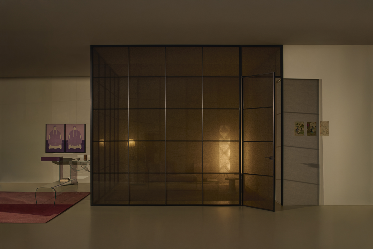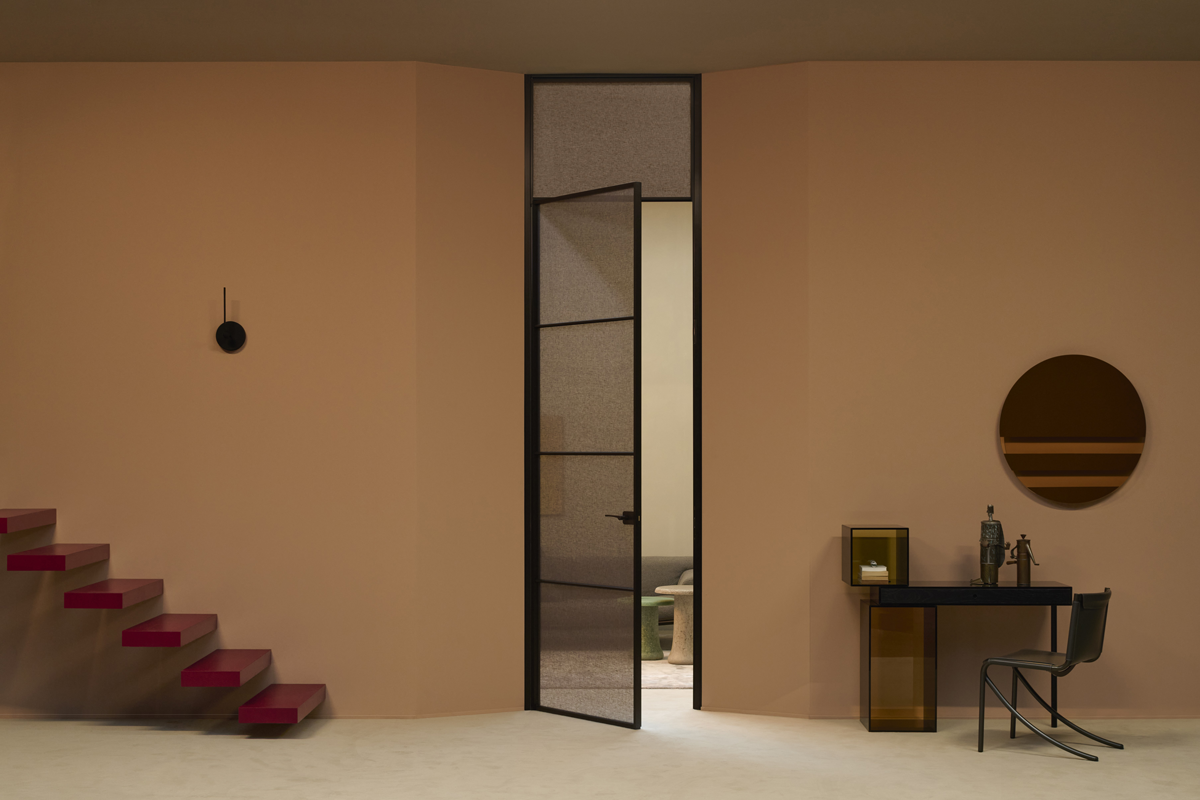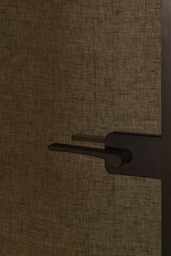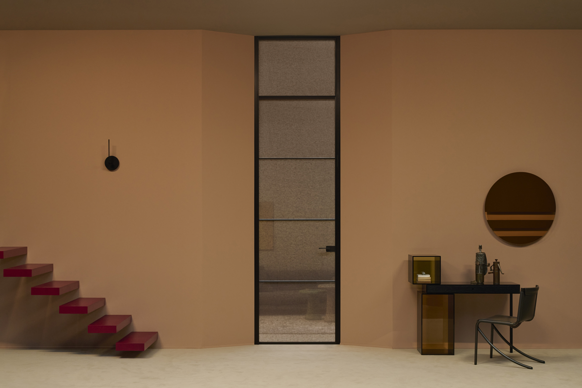 A custom single swing door with a concealed frame and flush-to-wall panel, featuring monolithic 6 mm or laminated 3+3 mm tempered glass divided into equal panes by tapered profiles. Aluminium frame and components come in five finishes. Glass options are certified, with stoneware and wood panels also available. Supports three lock types and handle or knob finishes matching the frame. Adjustable pivot hinges and a hidden, paintable subframe for cement or plasterboard walls. Handles have a sanitizing varnish for enhanced hygiene.