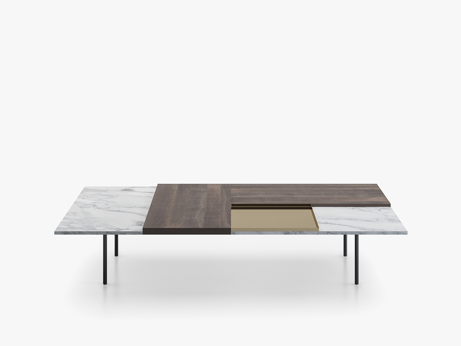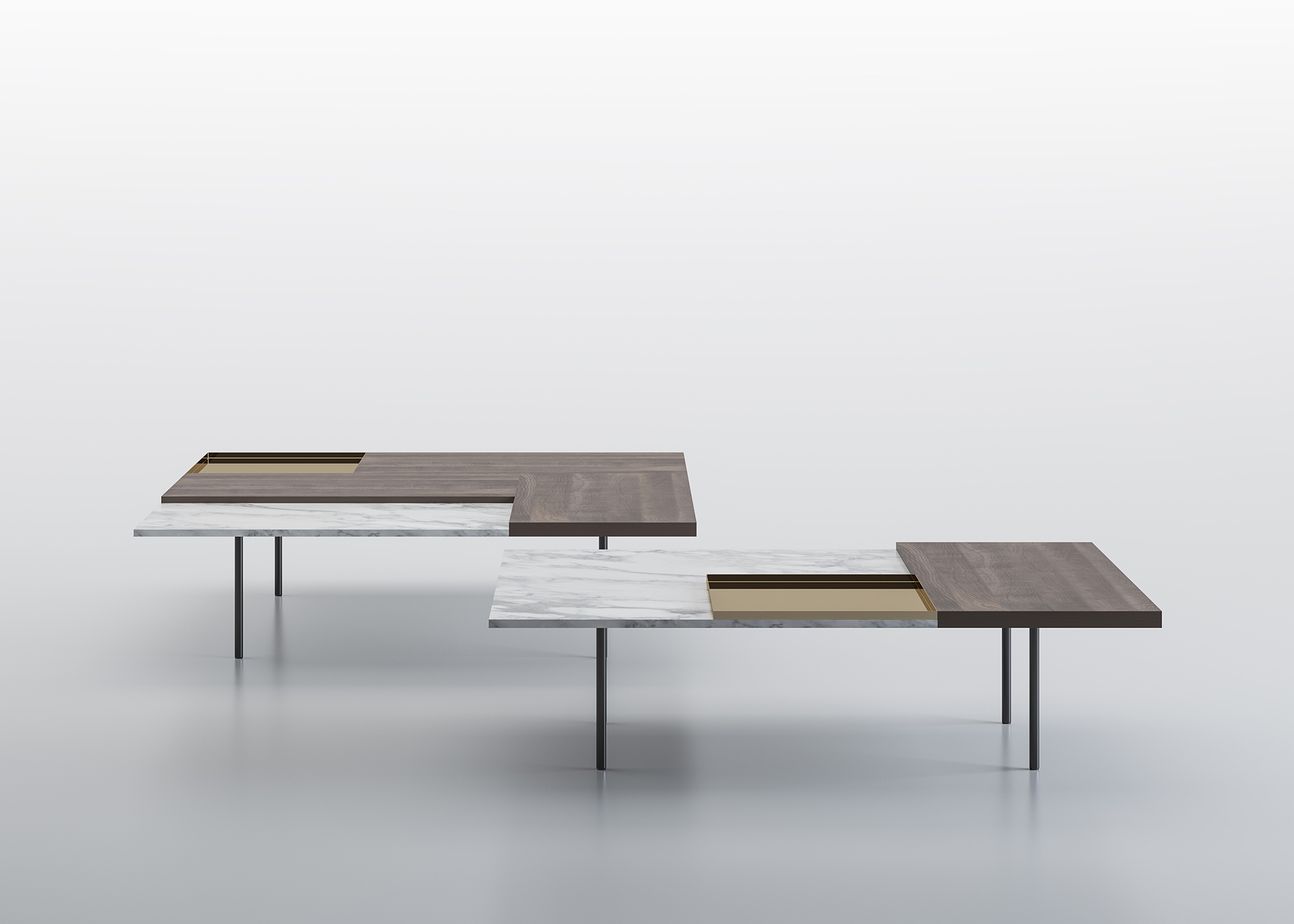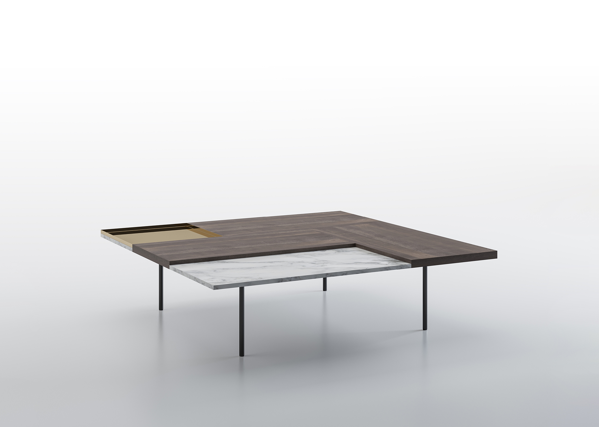 Massimo Mariani's early designs for Acerbis demonstrate his materially focused approach, which earned him the Compasso d'Oro award, resulting in an exceptional line of versatile coffee tables that blend and contrast various materials. The Moodboard collection, which also includes sideboards, includes low tables in a variety of sizes and shapes with tops made of wood, marble, polished steel, and brass. This combination creates a mosaic of materials, colours, and textures.