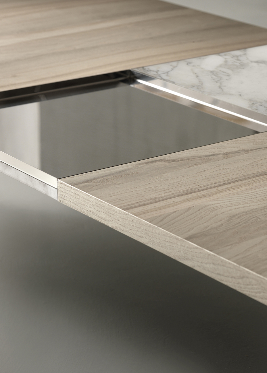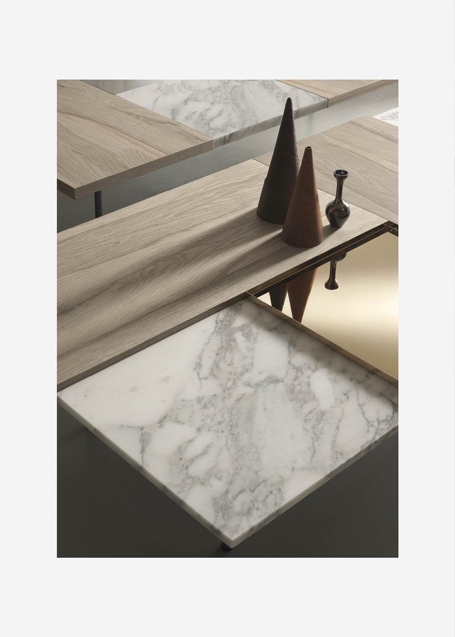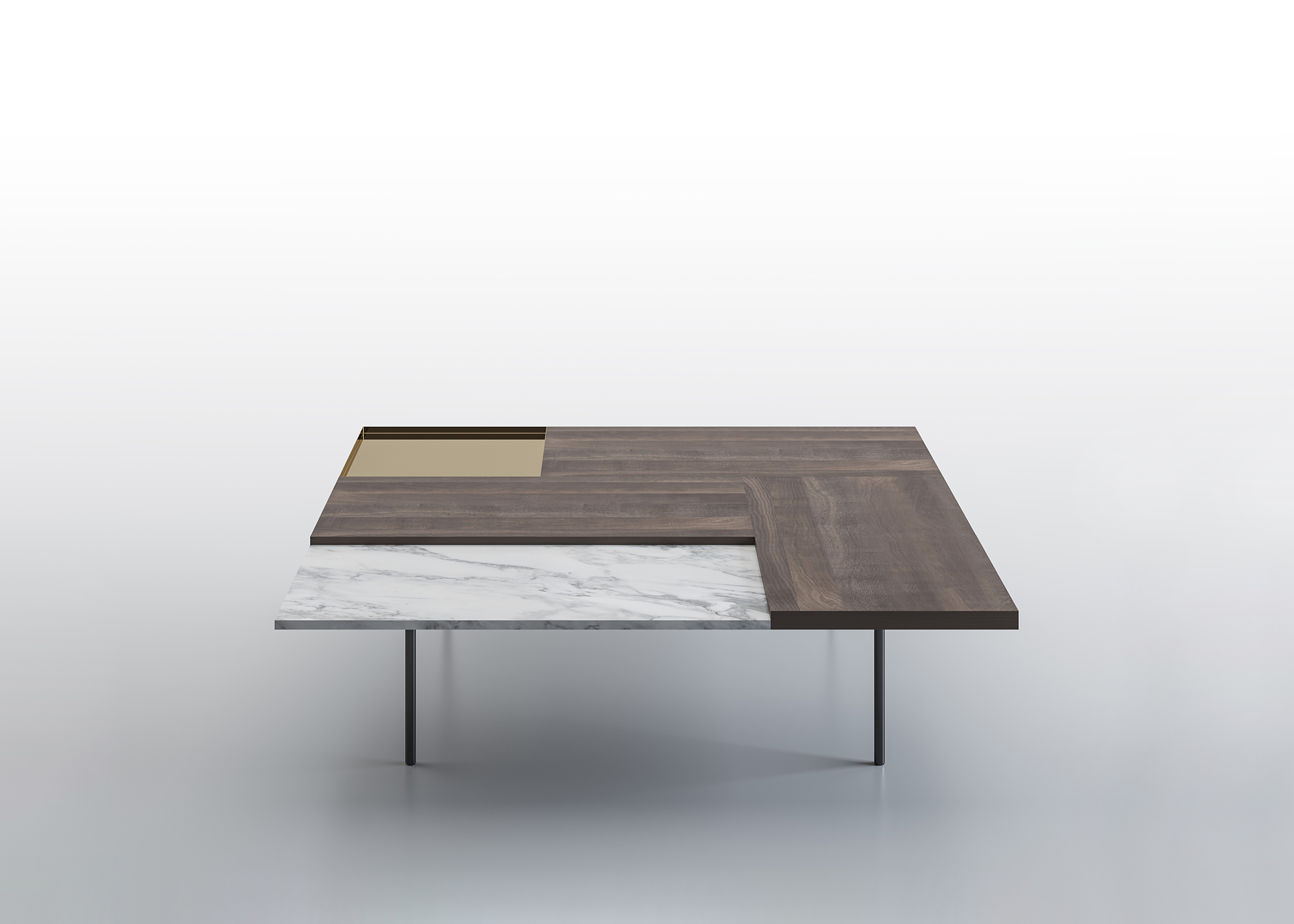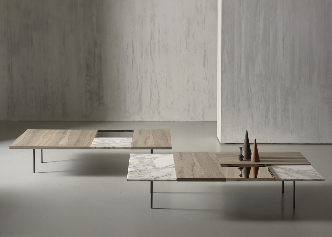 Massimo Mariani's early designs for Acerbis demonstrate his materially focused approach, which earned him the Compasso d'Oro award, resulting in an exceptional line of versatile coffee tables that blend and contrast various materials. The Moodboard collection, which also includes sideboards, includes low tables in a variety of sizes and shapes with tops made of wood, marble, polished steel, and brass. This combination creates a mosaic of materials, colours, and textures.