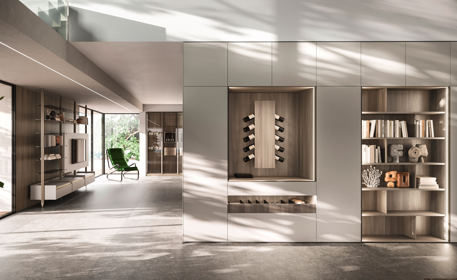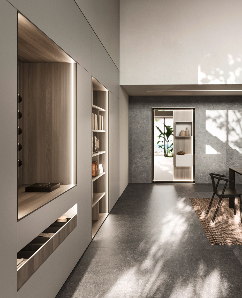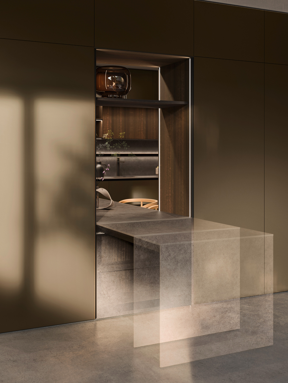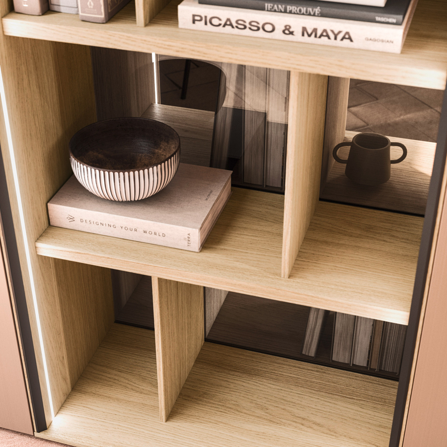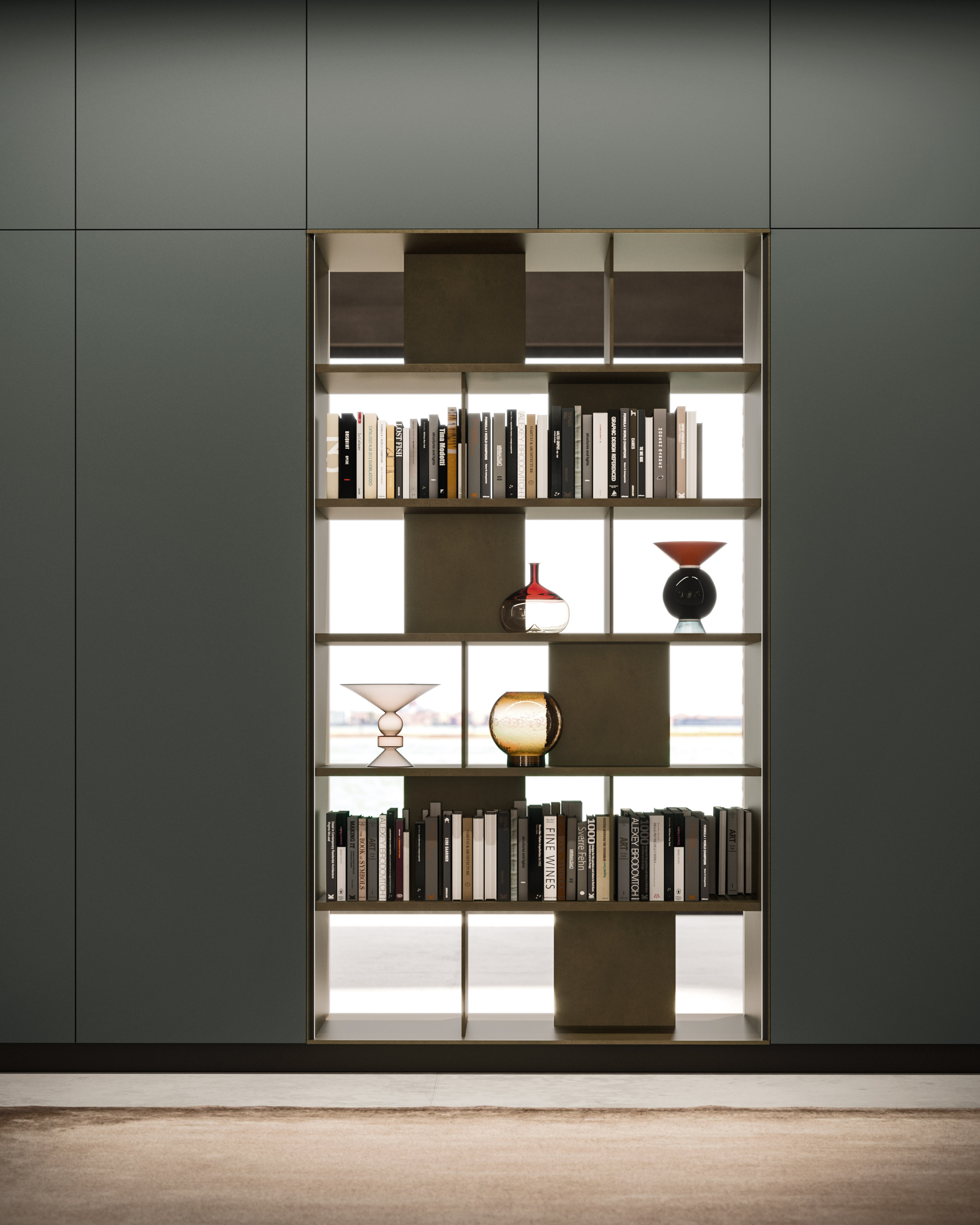 The Divider System is a modular bookshelf designed to define and link spaces with style. Each unit features integrated linear LED lighting and refined vertical profiles in ribbed Burnished aluminium, complemented by customisable tempered Bronze glass dividers. Available in multiple configurations, it adapts seamlessly to diverse design requirements.