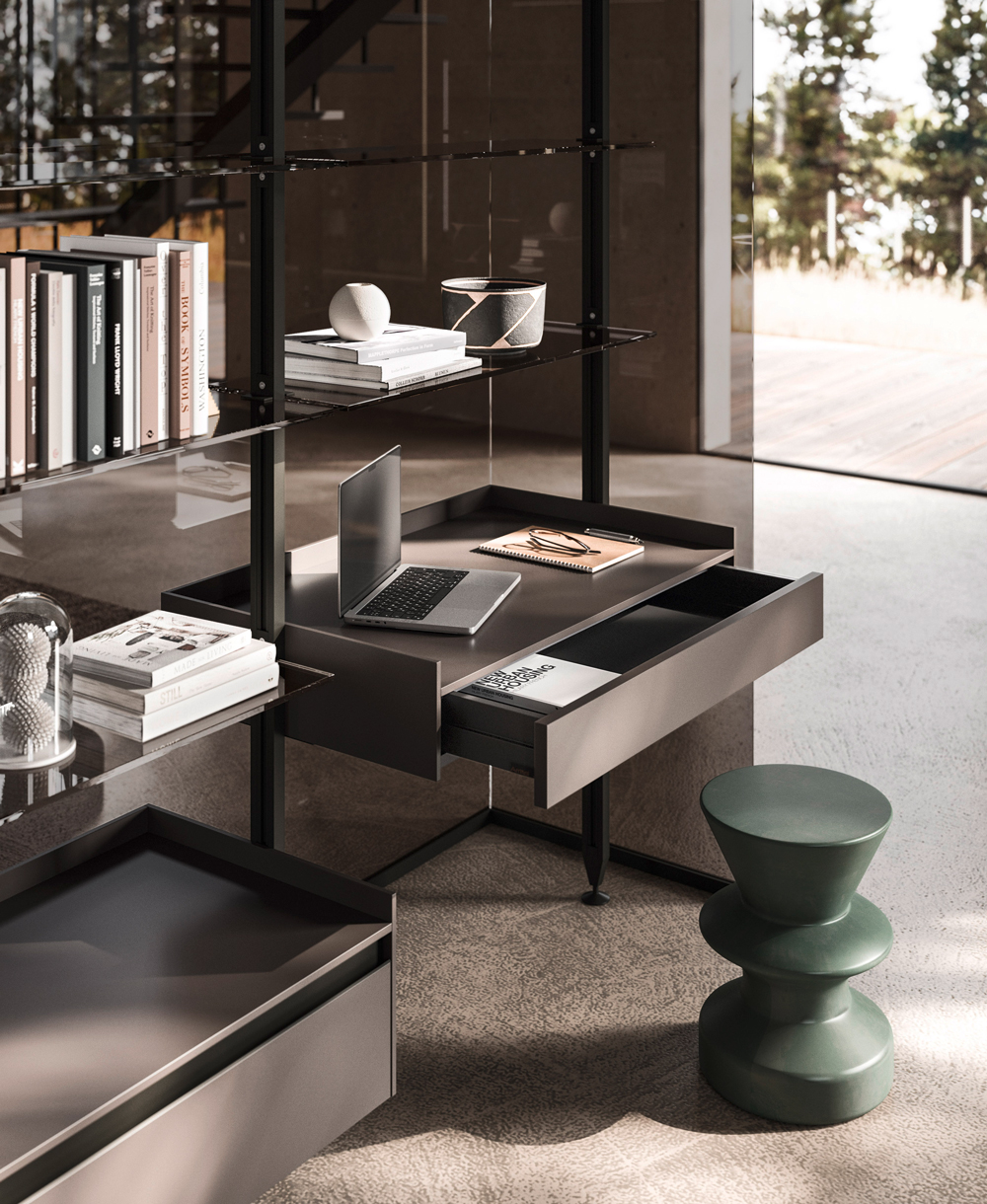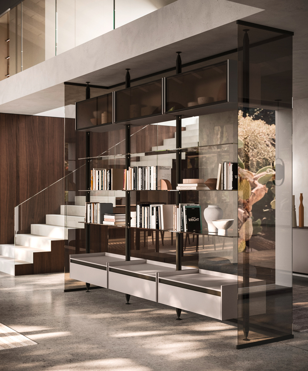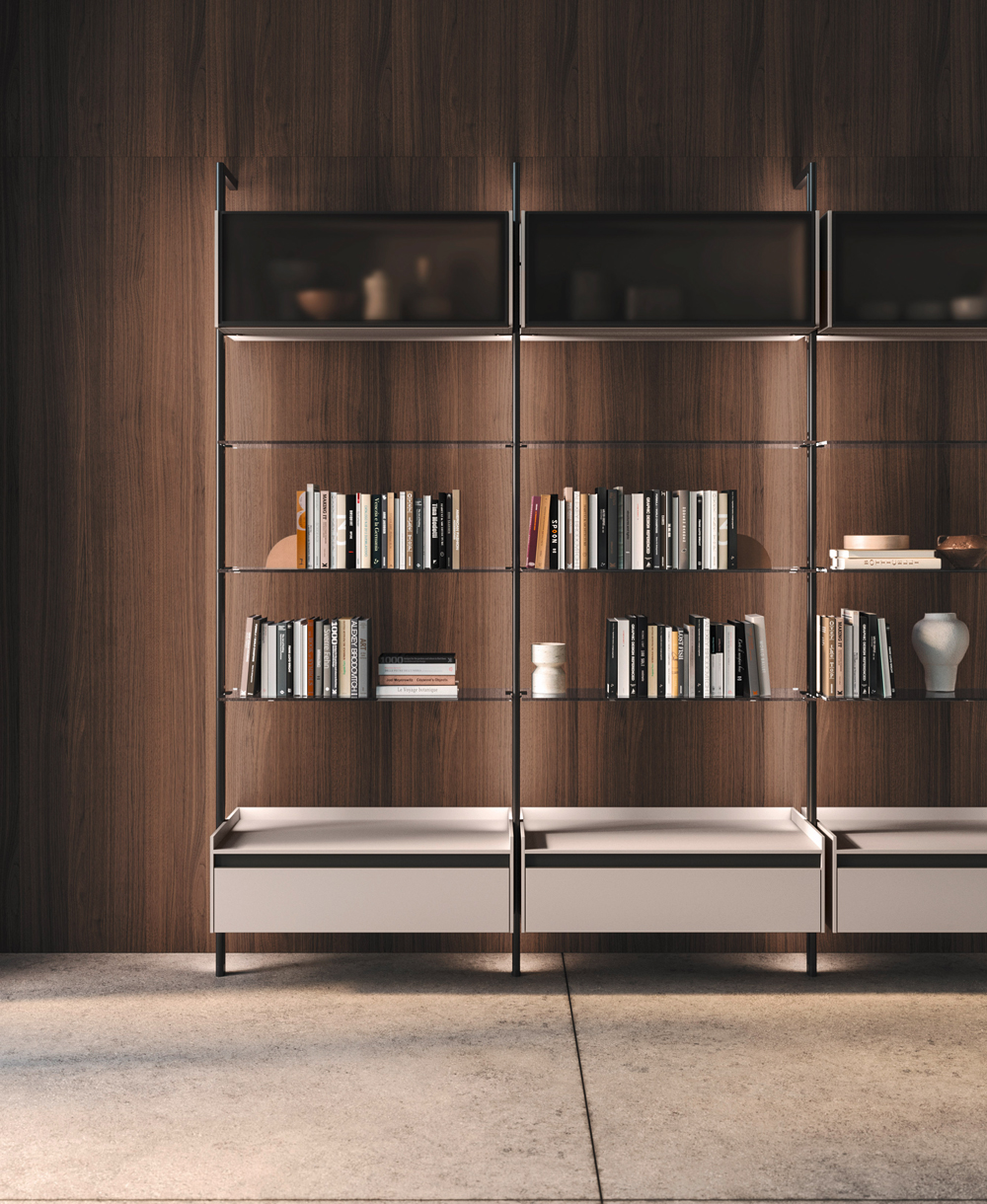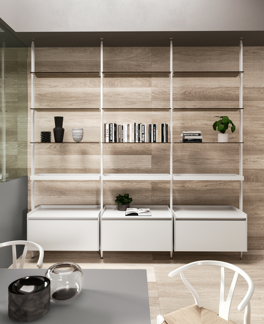 Vertical is a modular shelving system that redefines spatial division with elegance and versatility. Its minimalist aluminium frame creates fluid transitions between kitchen and living spaces, integrating open storage with architectural intent. With various sizes, finishes, and adaptable layouts—from floor-to-ceiling to floor-to-wall—Vertical offers tailored design solutions that transform partitions into stylish focal points.