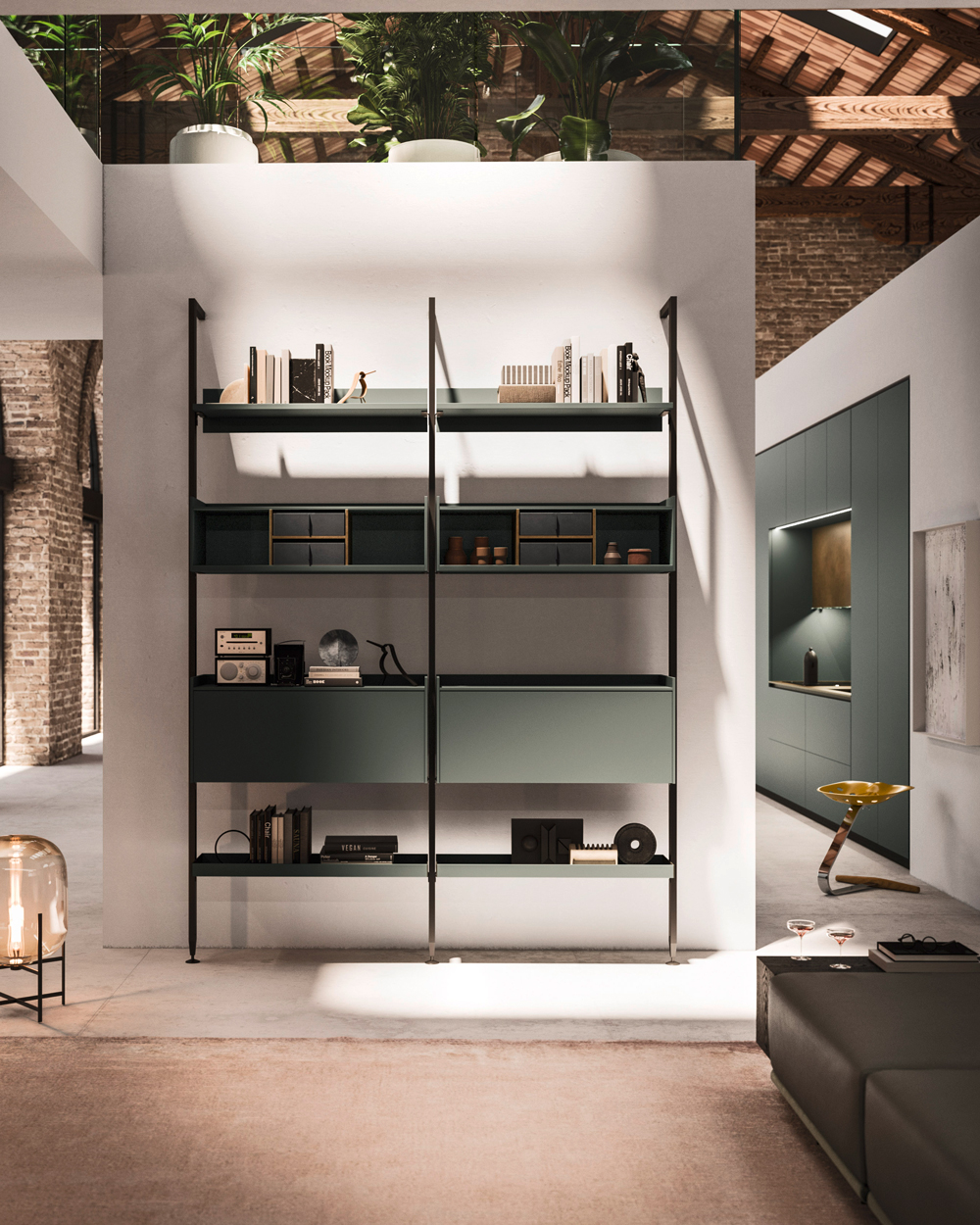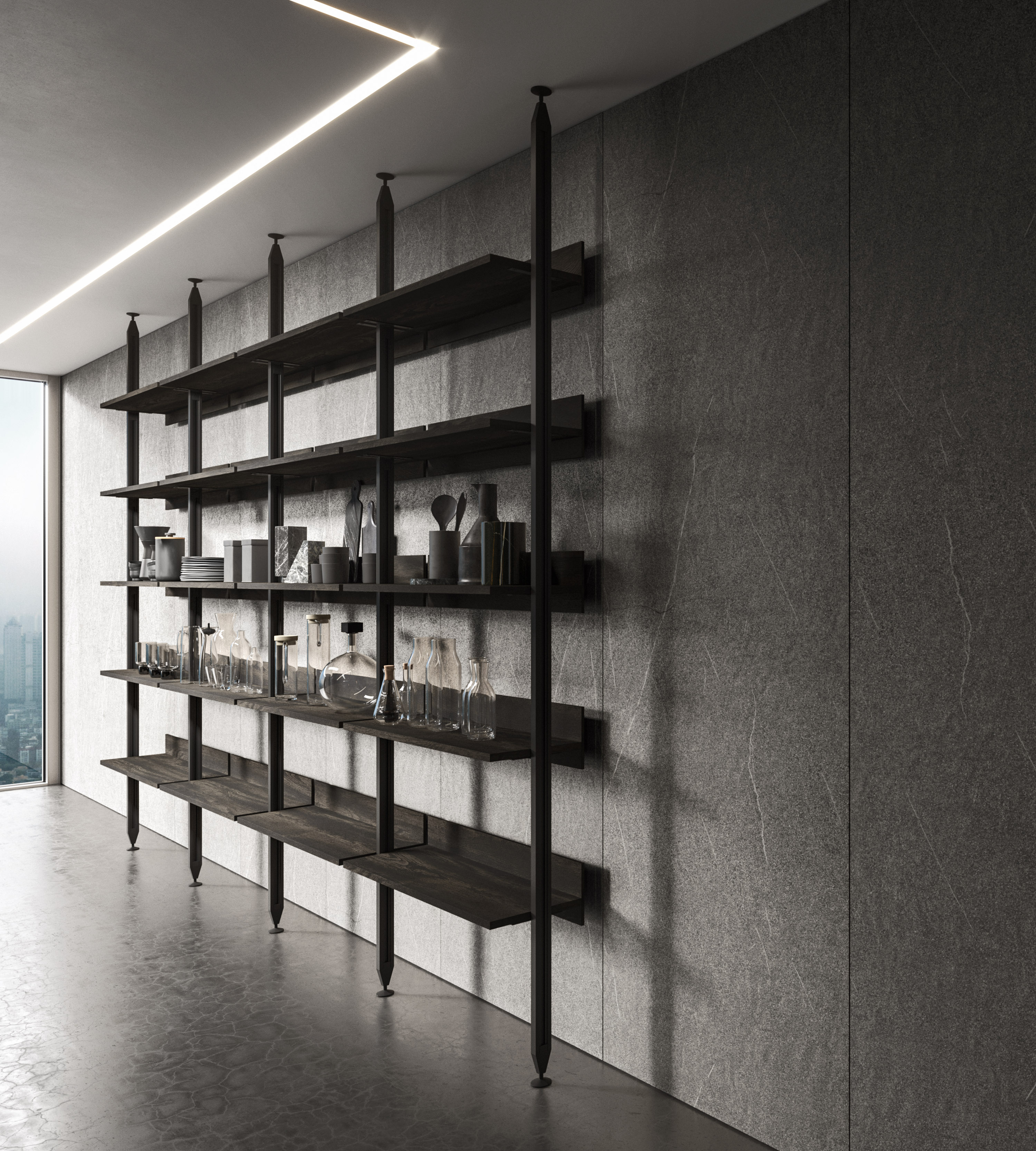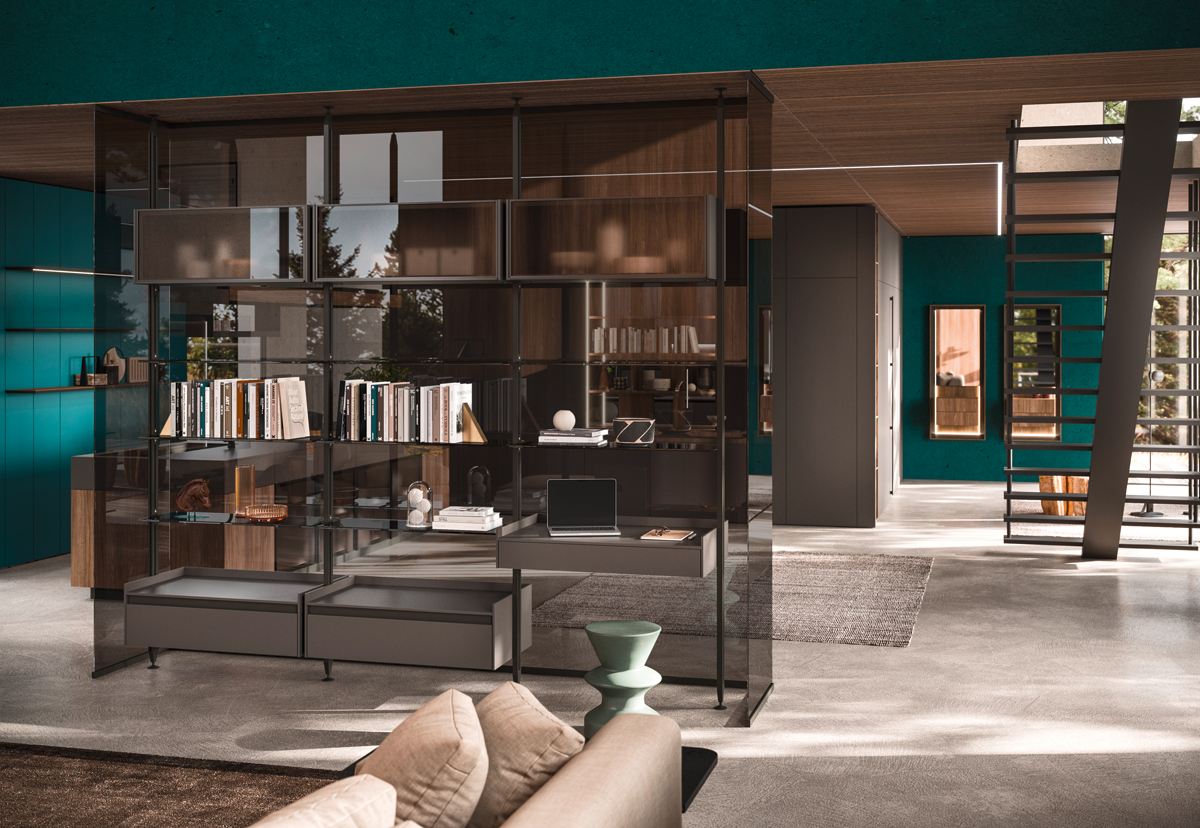 Vertical is a modular shelving system that redefines spatial division with elegance and versatility. Its minimalist aluminium frame creates fluid transitions between kitchen and living spaces, integrating open storage with architectural intent. With various sizes, finishes, and adaptable layouts—from floor-to-ceiling to floor-to-wall—Vertical offers tailored design solutions that transform partitions into stylish focal points.