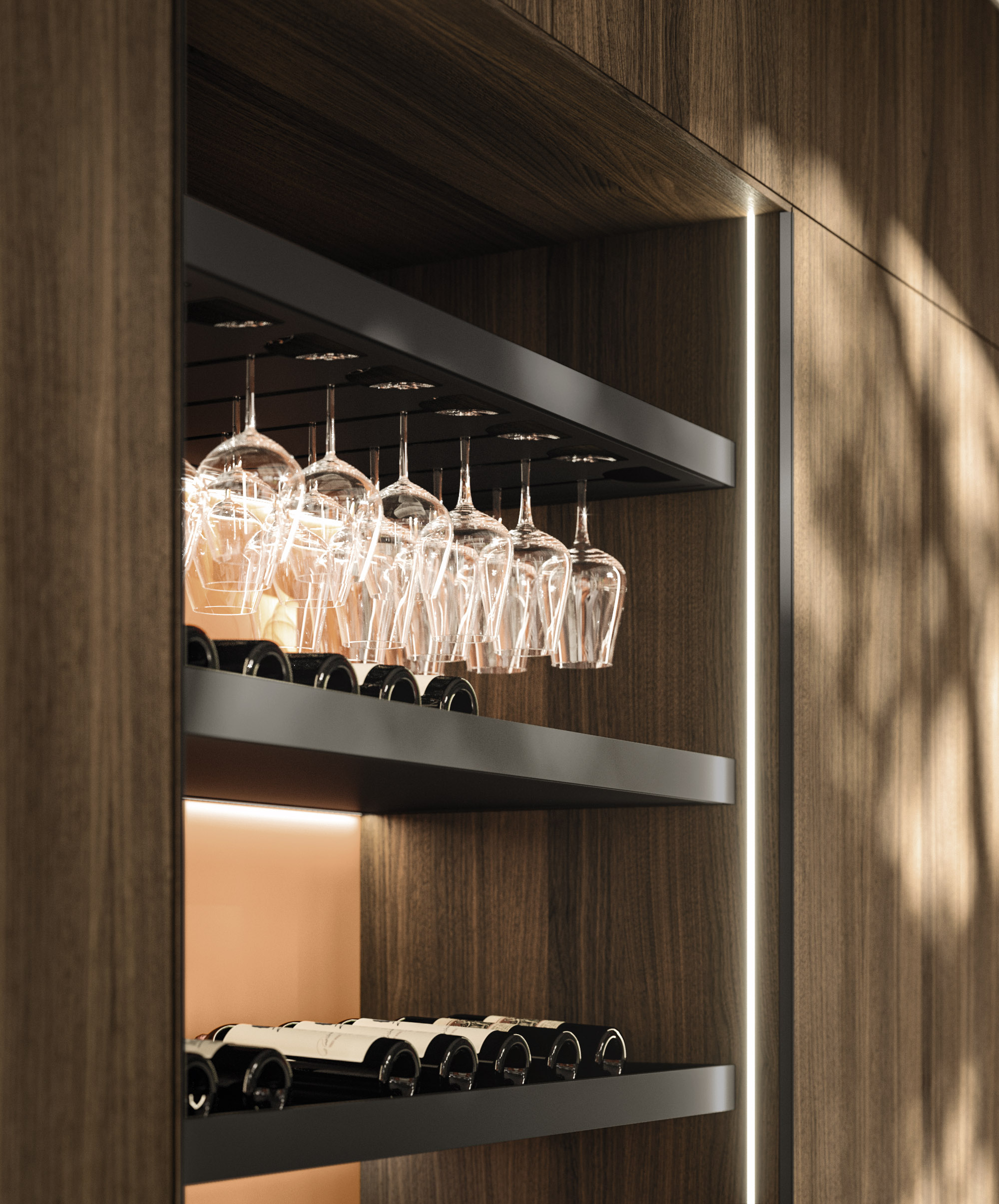 Arrital has a number of wine and wine glass holder display elements including the Vertical System, the AK_Winery , elements in the GEM glass unit collection and the Refrigerated drawer.
