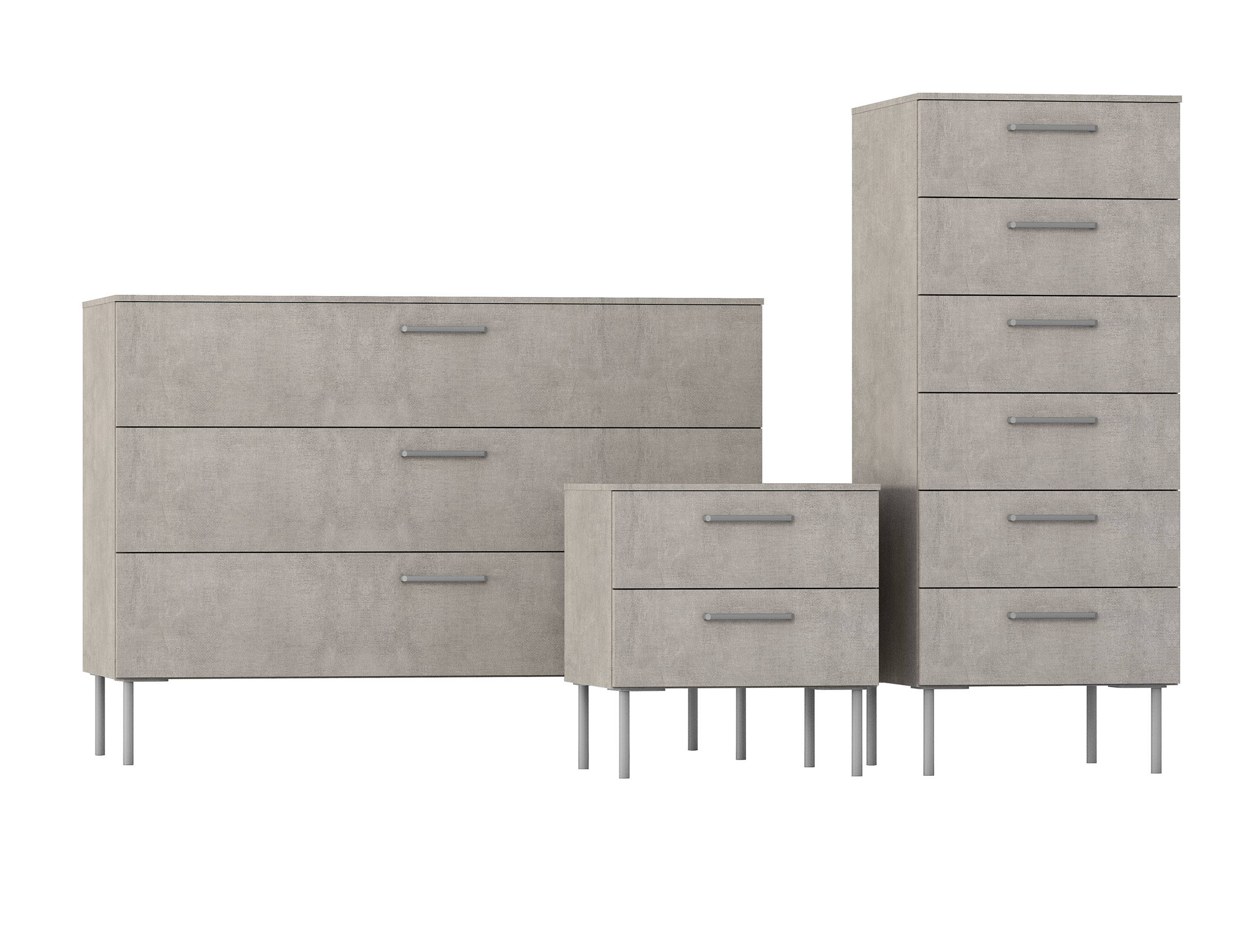The Praga bedroom units feature a contemporary and functional design that is highlighted by their standout metal legs that support the structure. Personalize the drawers by selecting from the catalog's various handle models.