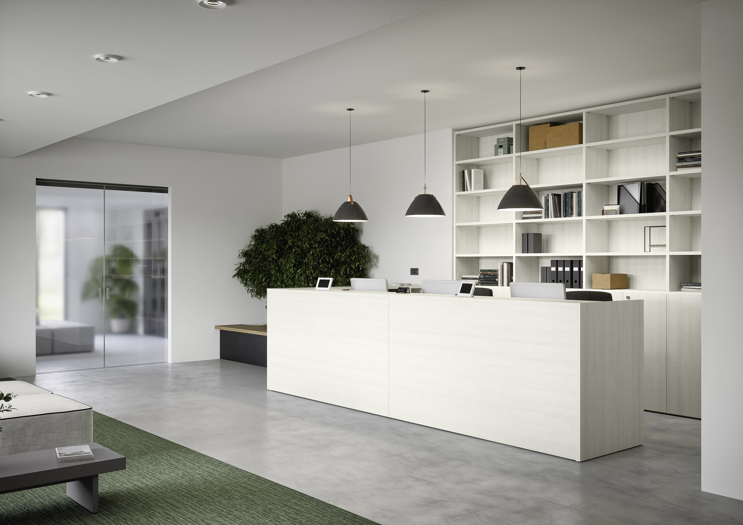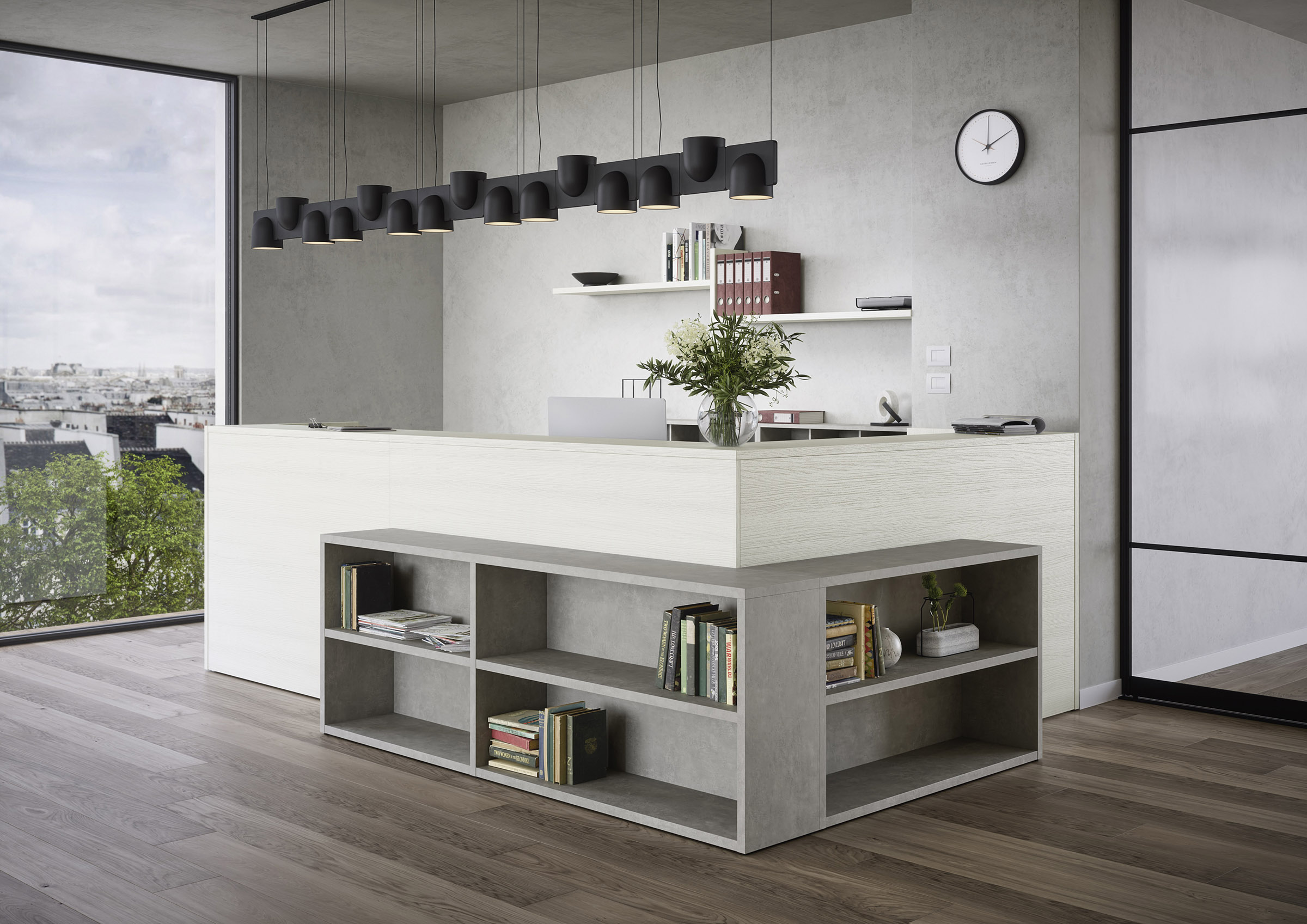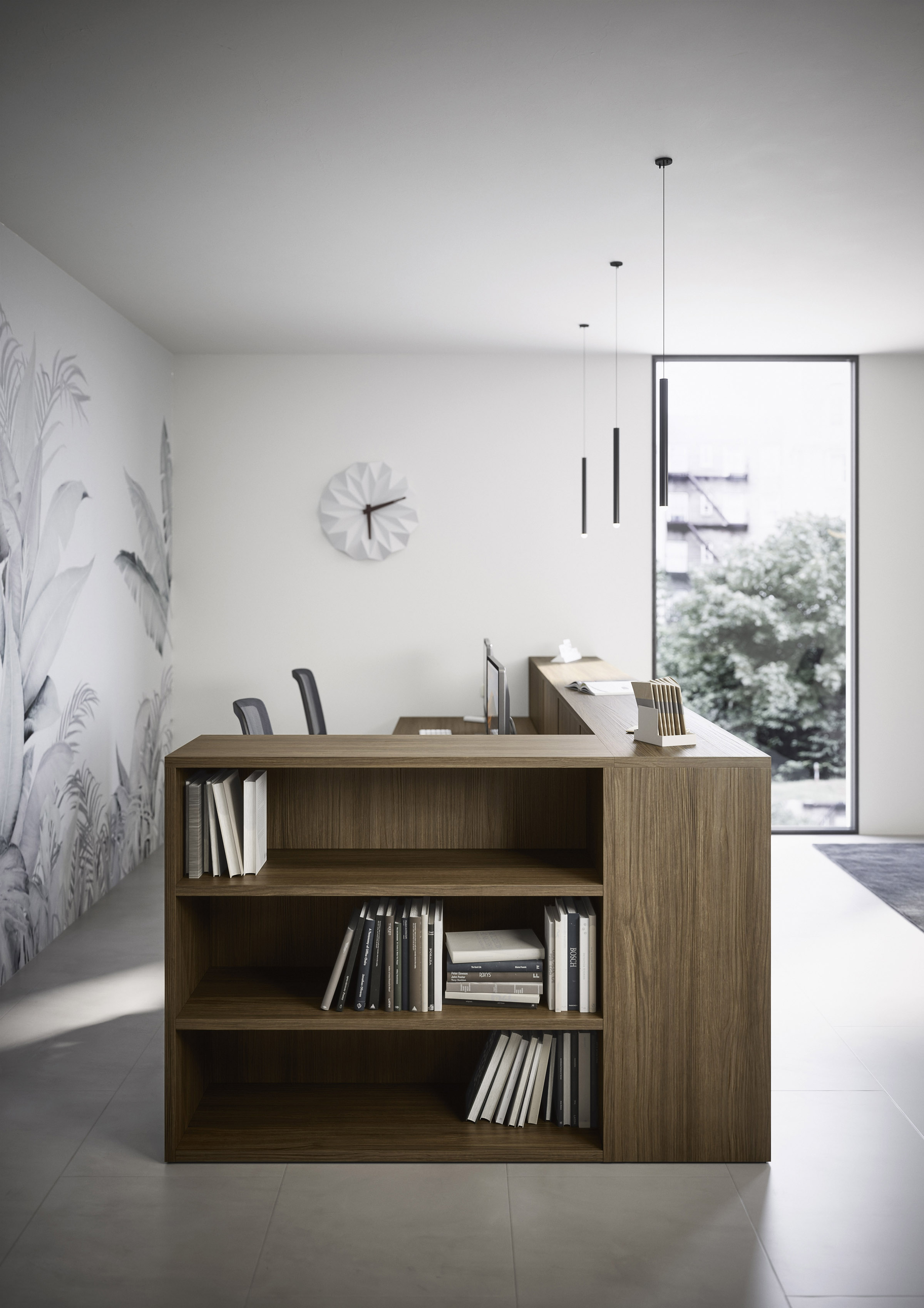 Reception desks, including corner models, are essential pieces of furniture for waiting rooms and reception areas, offering effective fit outs customized to your requirements. Customize the reception desk with a variety of available elements to match the size of the room and your interior design.Select from a variety of finishes in the catalogue to create reception areas that meet a range of needs in a seamless way. ideal for commercial spaces, contract markets, and the hospitality sector.
