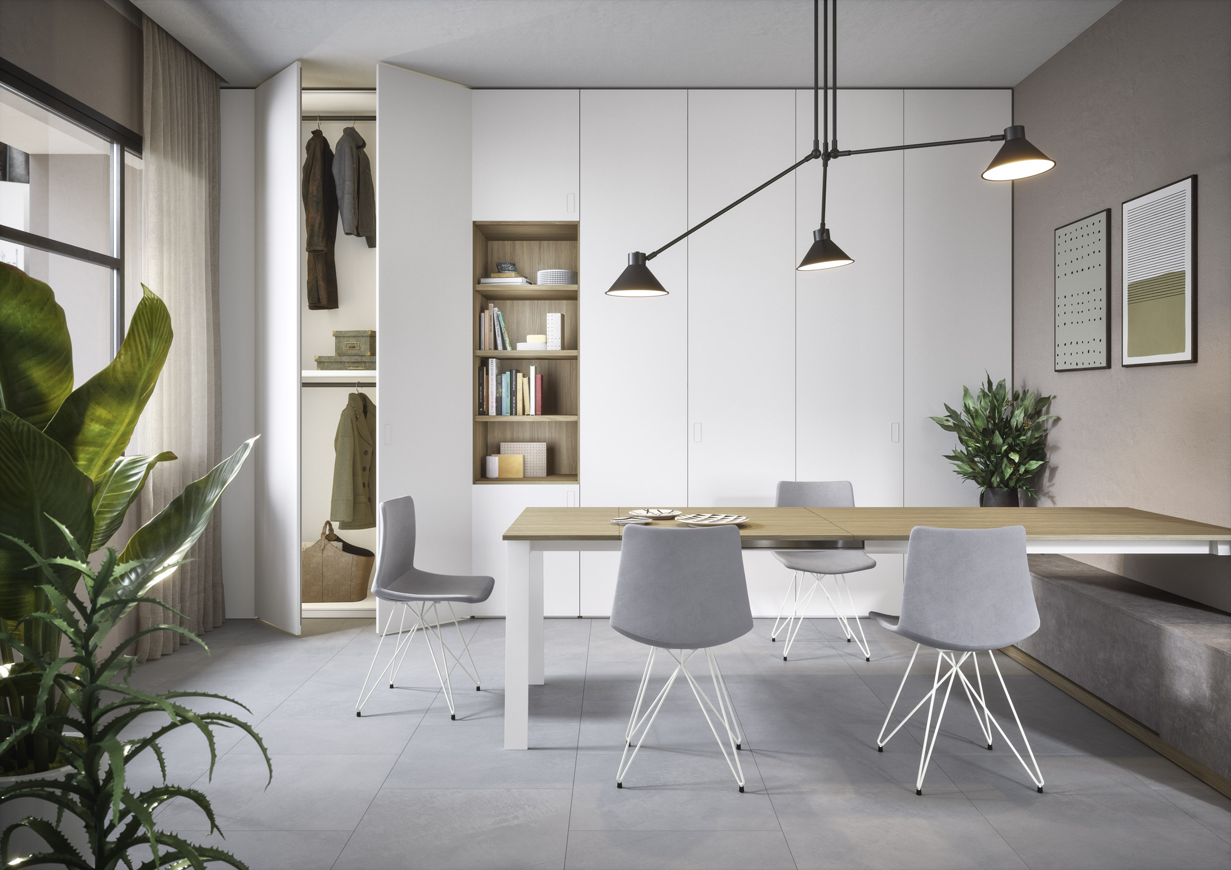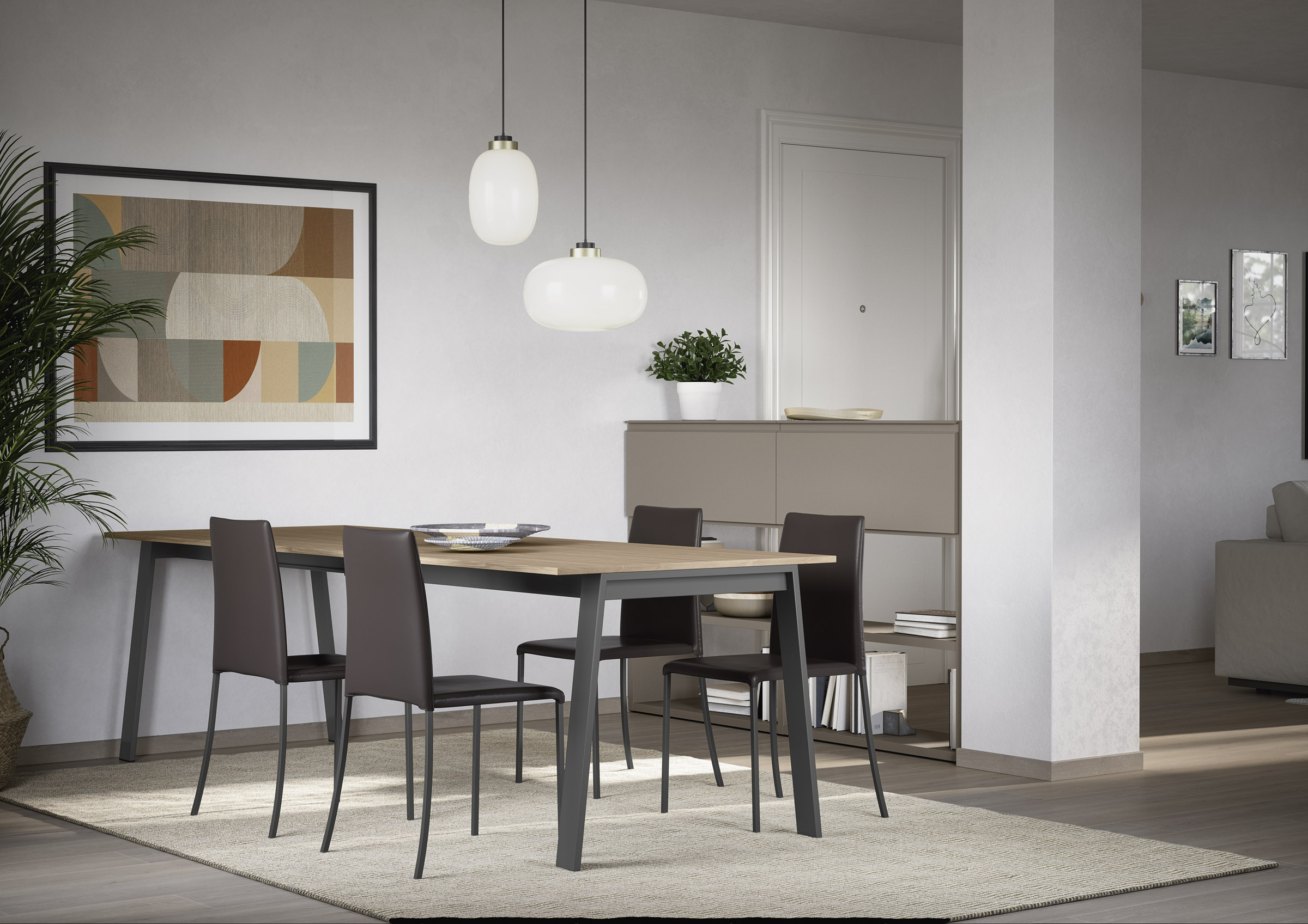 Discover the distinct charm of the extending Corby table, which comes in a peninsula version and is characterized by its sleek geometries. This table is the perfect addition to your everyday life because it skilfully blends style and functionality. The Corby table's top, which can be finished in any colour from the catalogue and is held up by strong metal legs, gives personality to your decor. With the Corby table, create a cozy and well-utilized area that incorporates eye-catching modular solutions for a chic and useful space.
