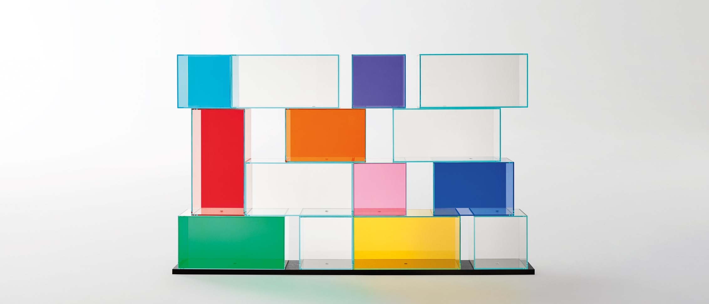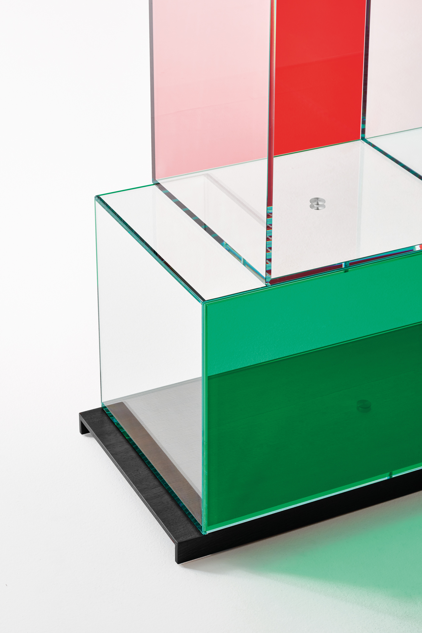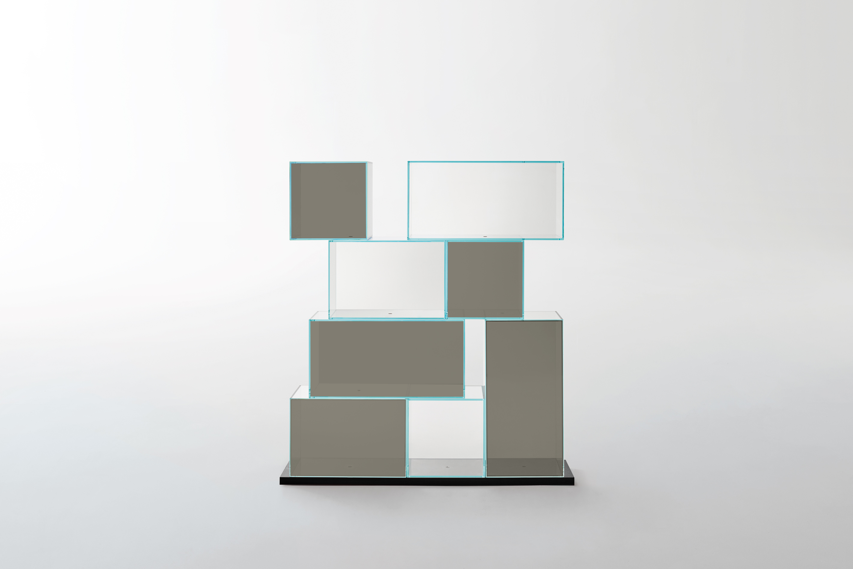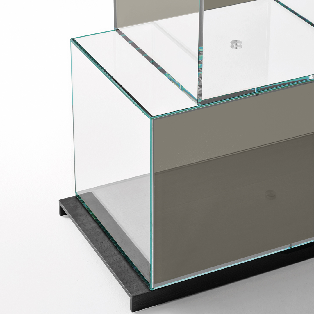 Transparent 10 mm extra light tempered glass boxes in a variety of sizes are used to build these bookcases. The boxes have a unique aesthetic because of the intentional misalignment and irregular overlap. They have a back panel that is available in bronze, smoked, transparent extra light, or "transparent coloured glass" finishes. These boxes are joined to one another with simple chromed metal joints and sit atop an oak base that has been black lacquered with an open-pore finish. Each composition can be used from one or both sides, depending on personal preference, offering a variety of display options.