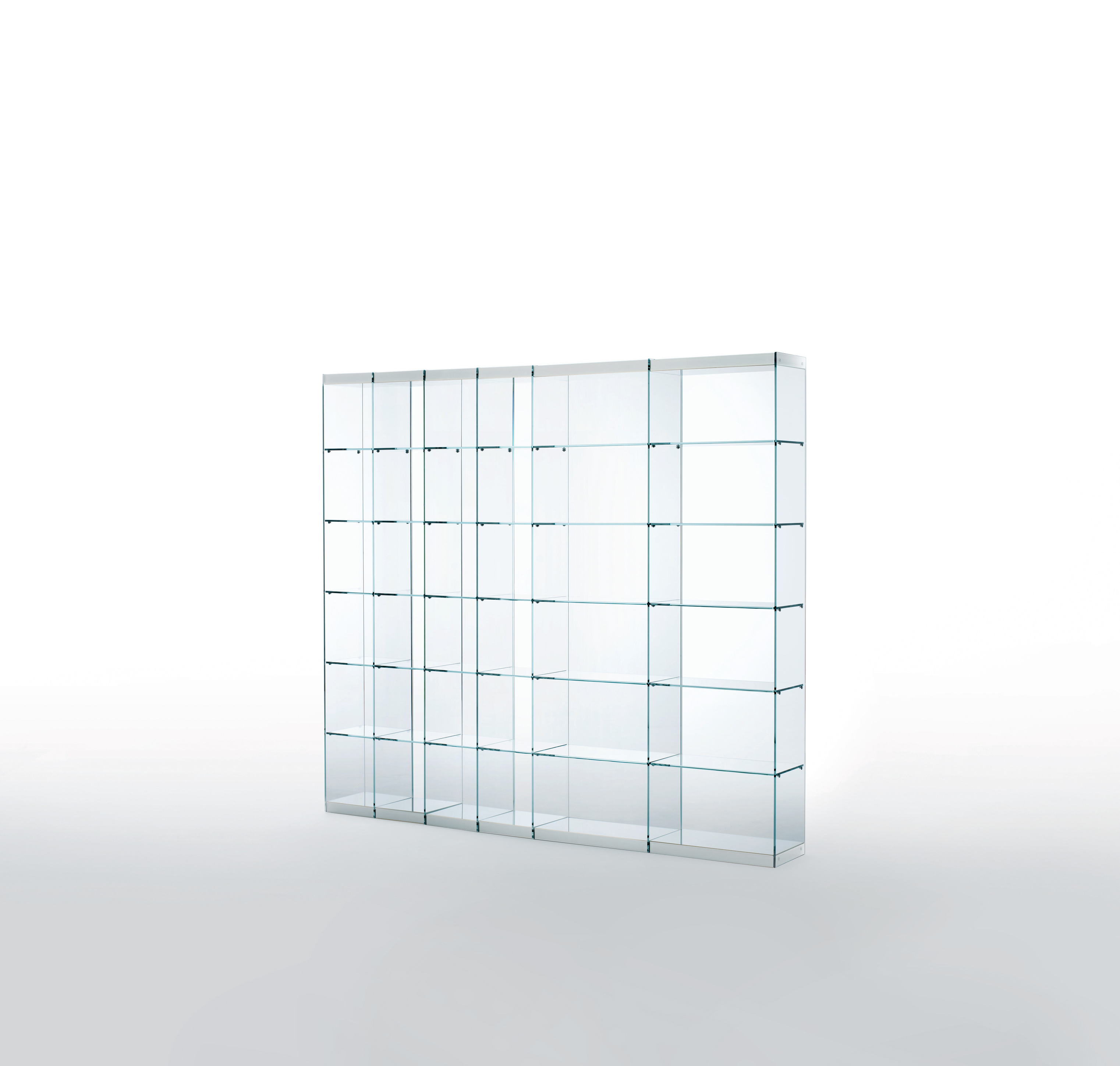 This bookcase has tempered 10mm thick glass modules with different depths and widths. Transparent extra light glass plates and sides offer a distinct aesthetic. The glossy lacquered glass used for the base and top gives the bookcase's structure a sleek appearance.