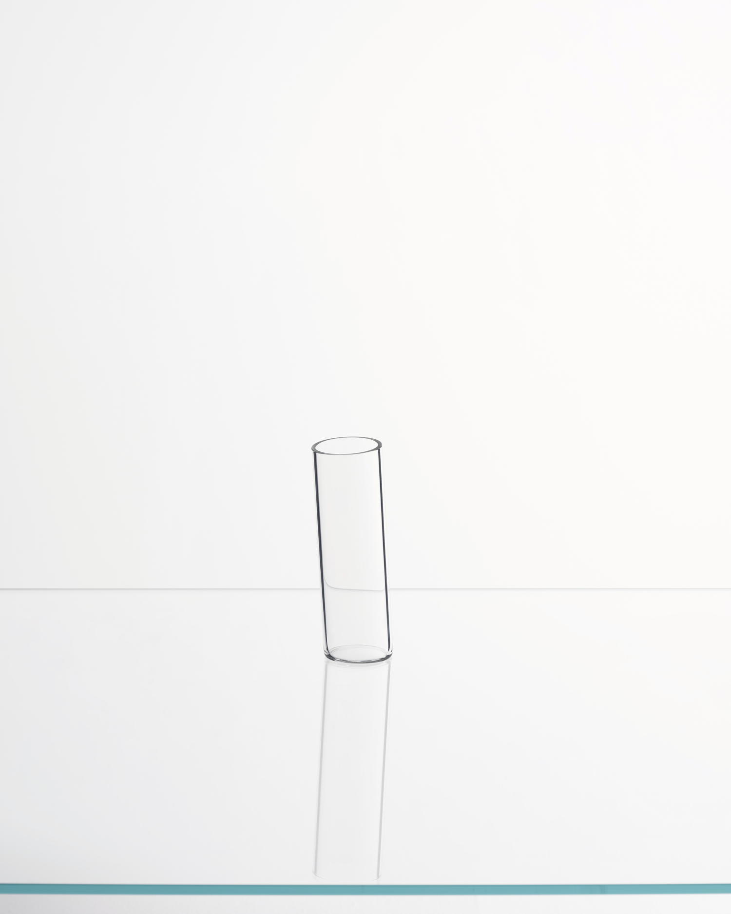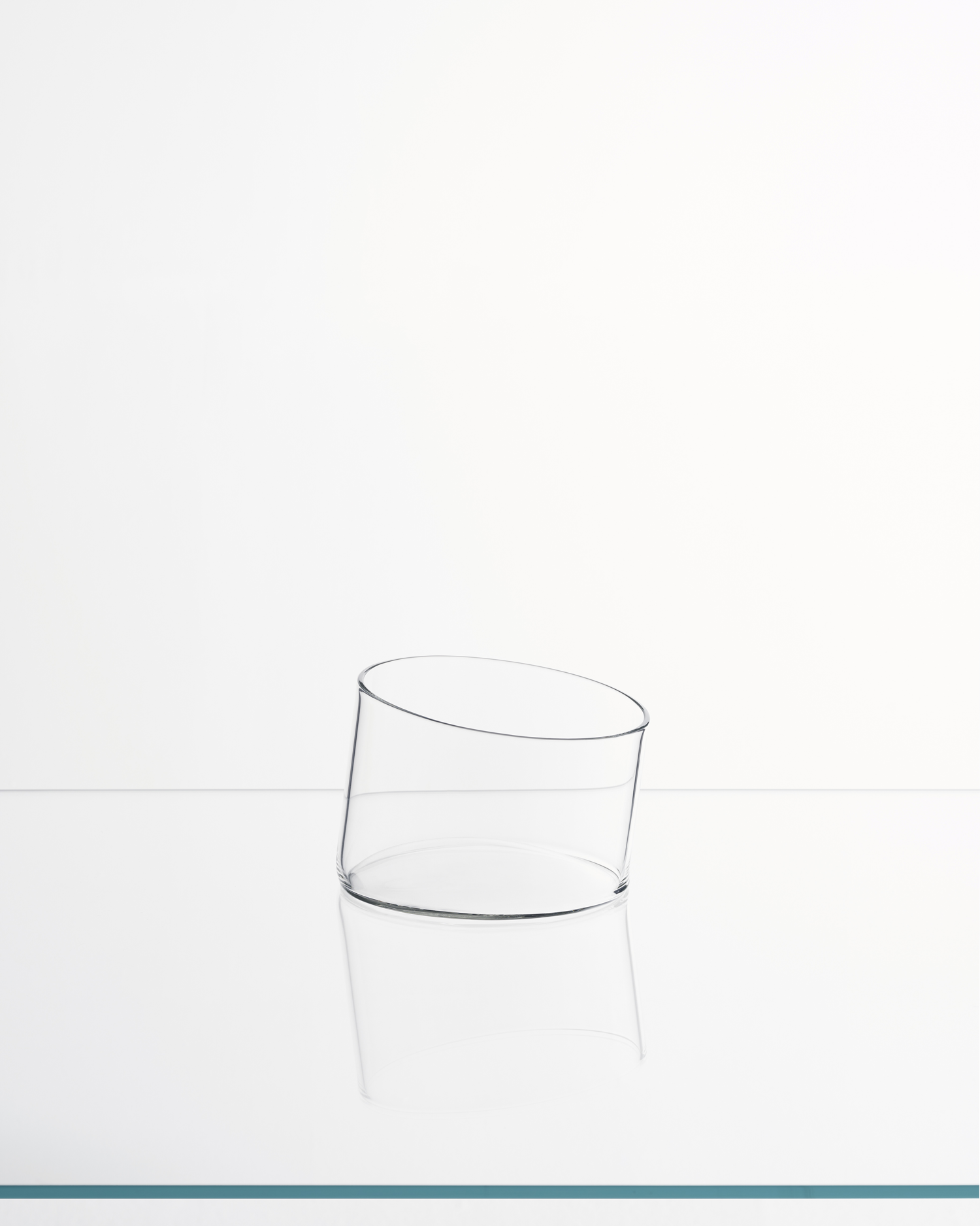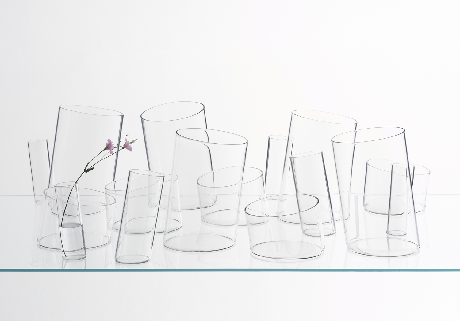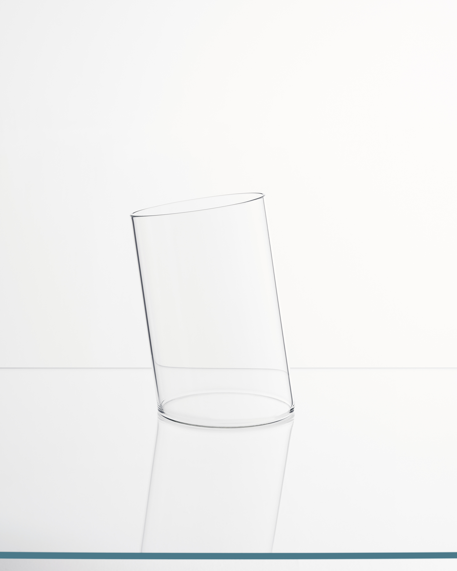 Cylindrical transparent borosilicate glass vases, each uniquely angled with varying inclinations across different sizes.