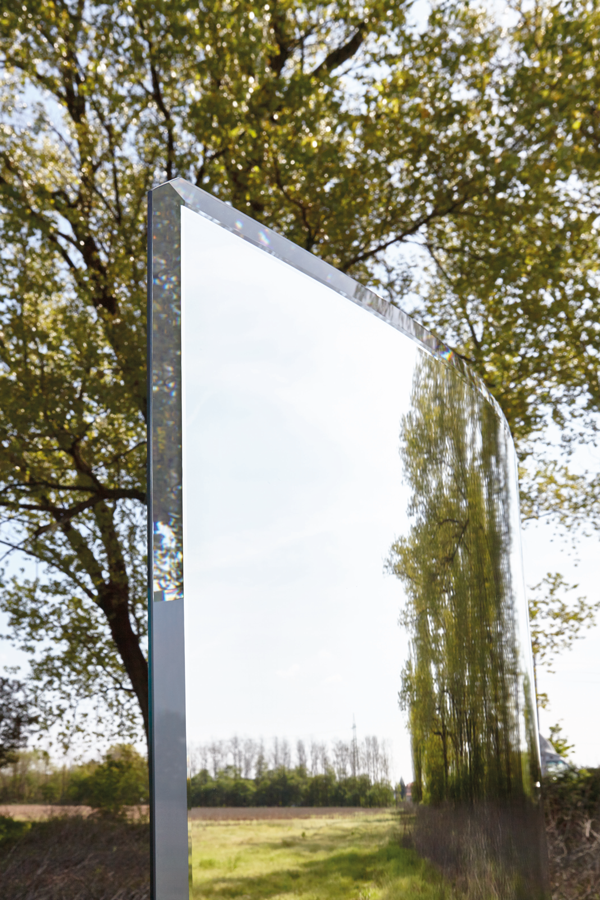 Curved mirror screen, 6 mm thick, with smooth rounded corners and a large chamfer on the vertical and top edges. The back features a silver safety anti-crushing film for added protection.