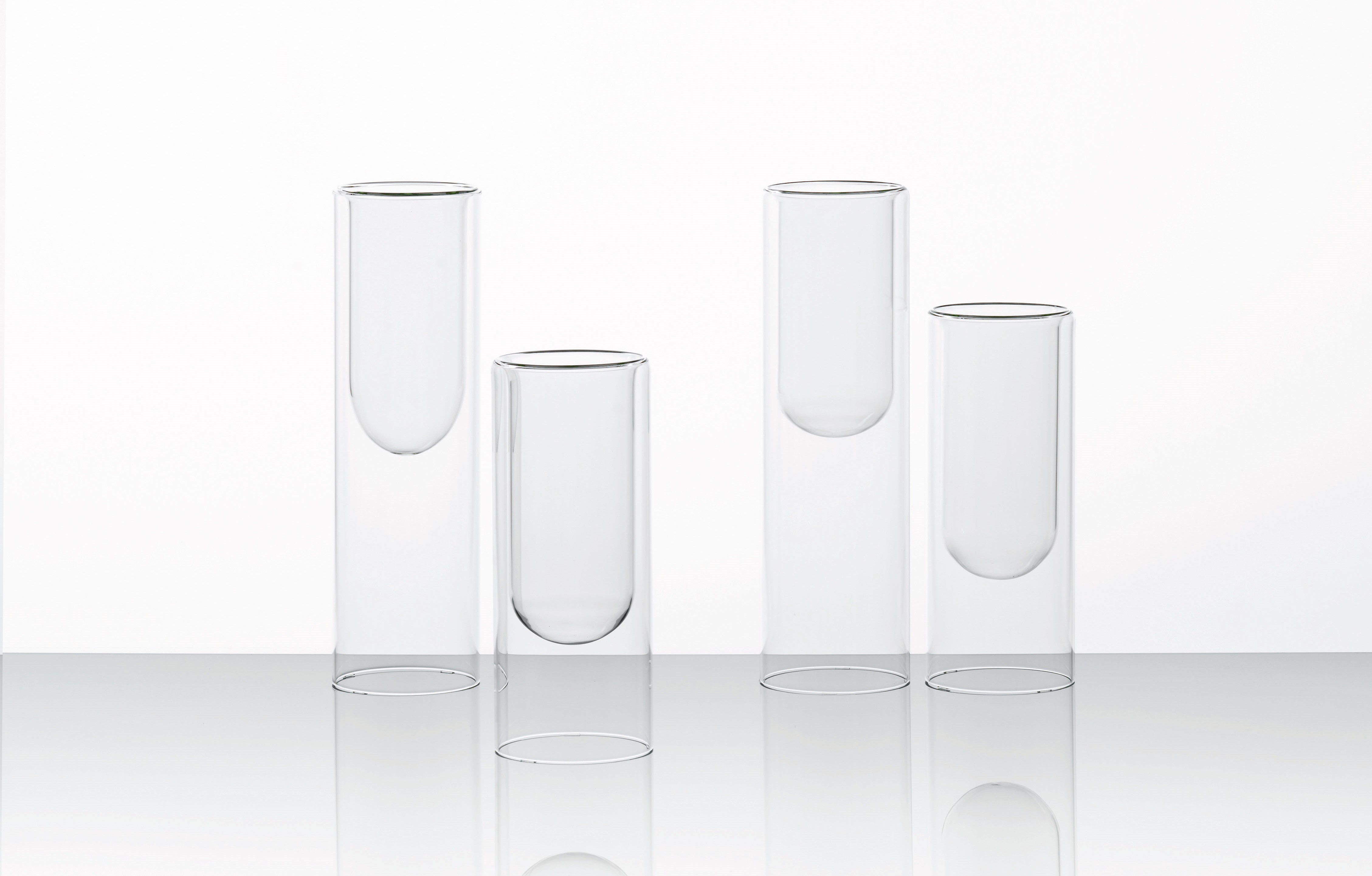 These transparent borosilicate glass cylinder vases are made with an intricate and sophisticated blowing method that forms a concave shape inside the cylinder. This concavity preserves the vase's smooth transition from the inside to the outside, demonstrating the continuity of the design. There are two distinct heights for the vases to accommodate different tastes.