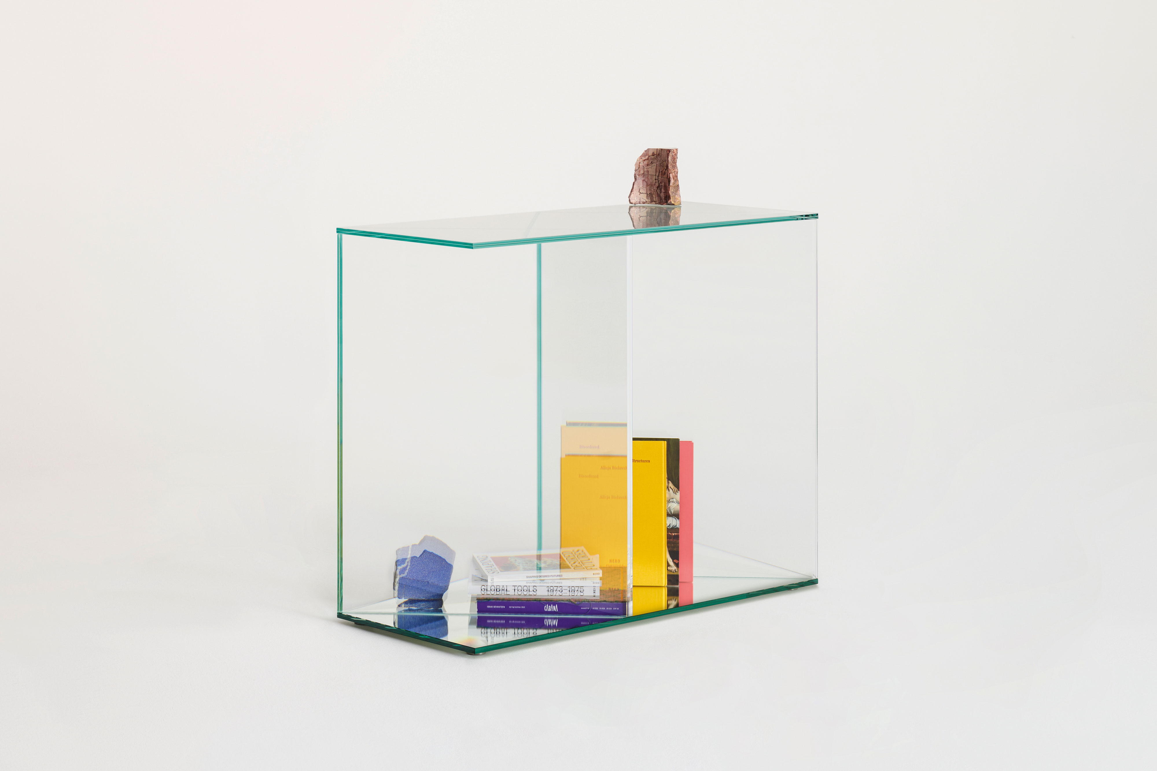 This collection includes low tables and consoles made of a novel laminated and bonded glass that creates mesmerizing optical illusions and surreal effects. Objects observed through this material appear to undergo remarkable transformations, including changes in material consistency, position, size, and even quantity. The collection's enchanting visual effects are intensified and amplified by a laminated mirror base.