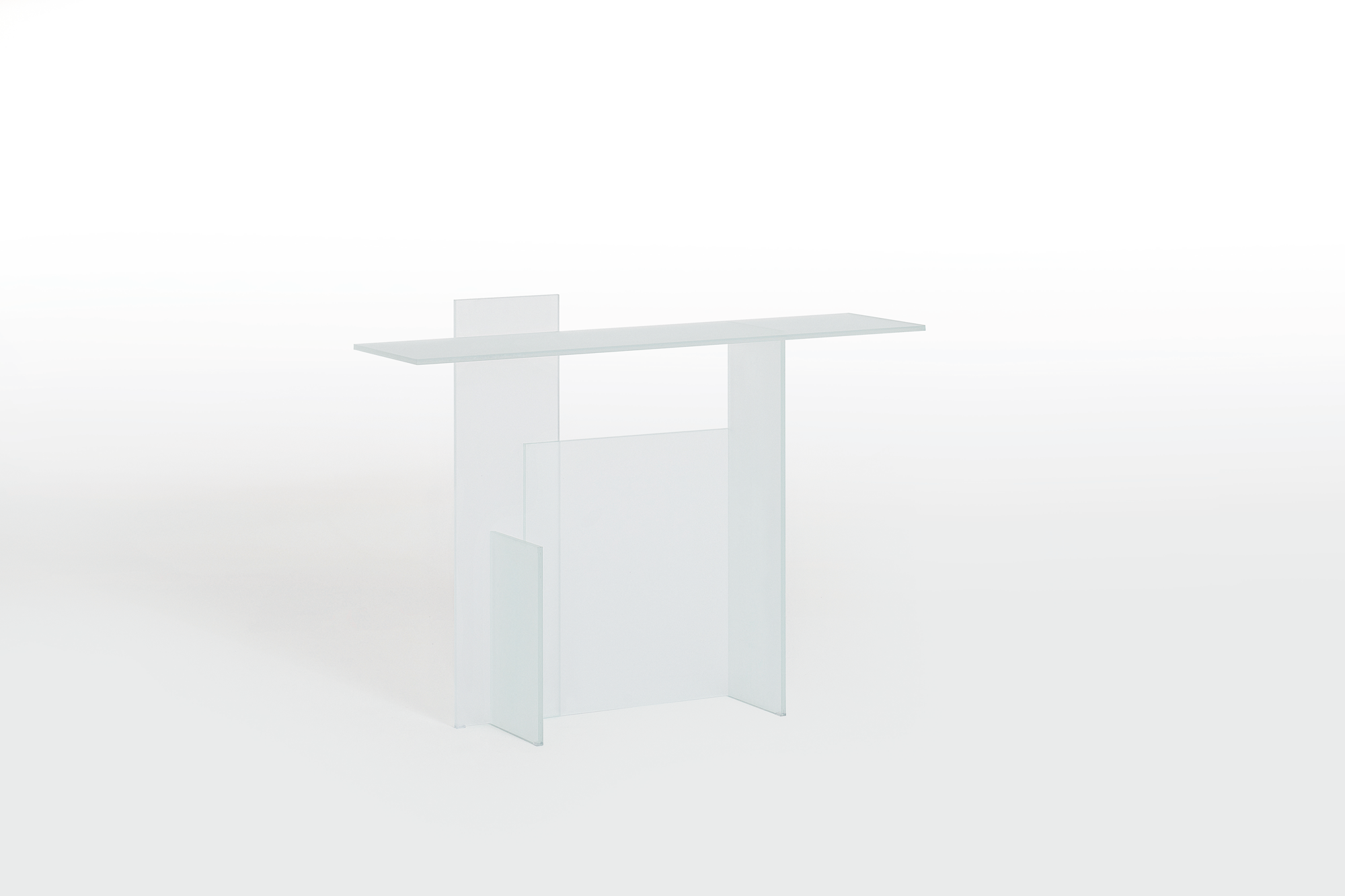 A sculptural collection of furniture—including shelves, consoles, bookcases, and low tables—crafted entirely from 10 mm tempered green or extra-clear double-sided acid-etched glass. Each piece is formed from interlocked and overlapping sheets, bonded using a special UV method, creating pure, refined designs with a minimalist aesthetic. Shelves can be wall-mounted in either orientation.