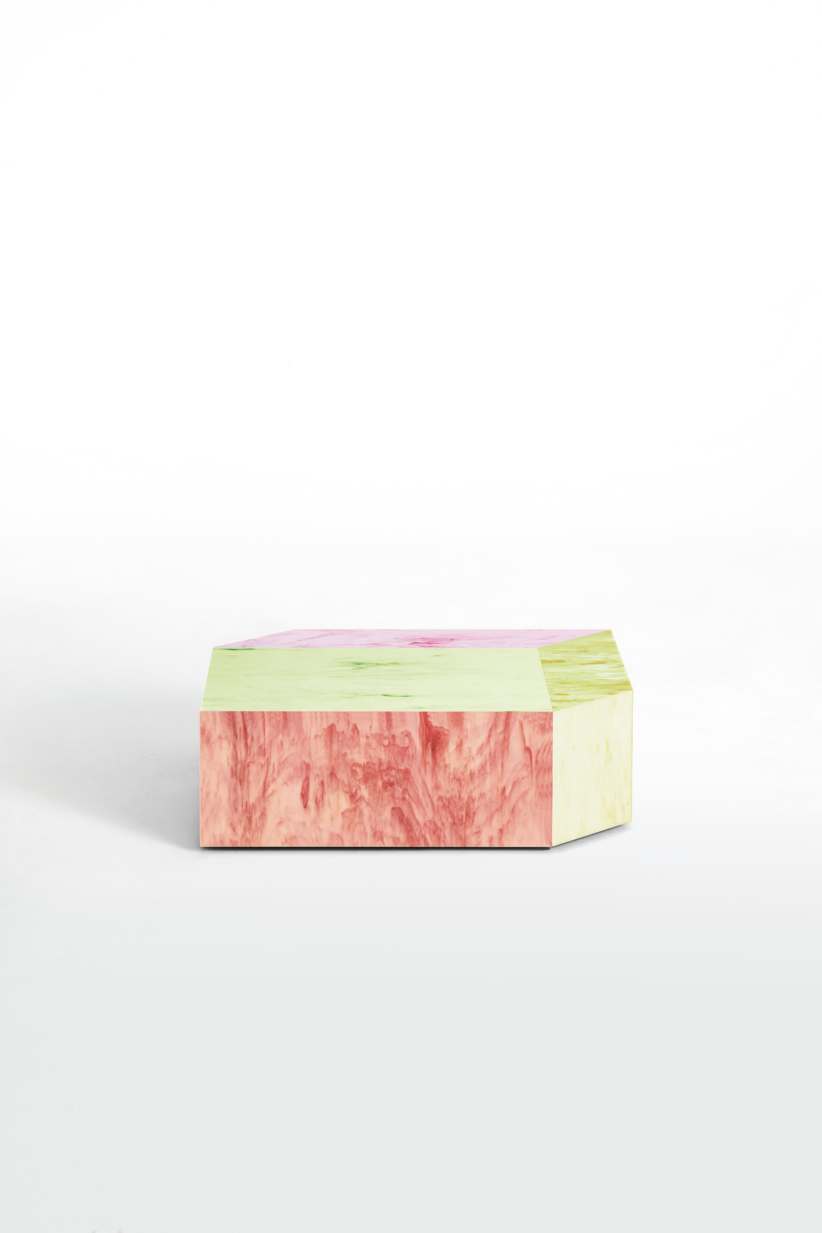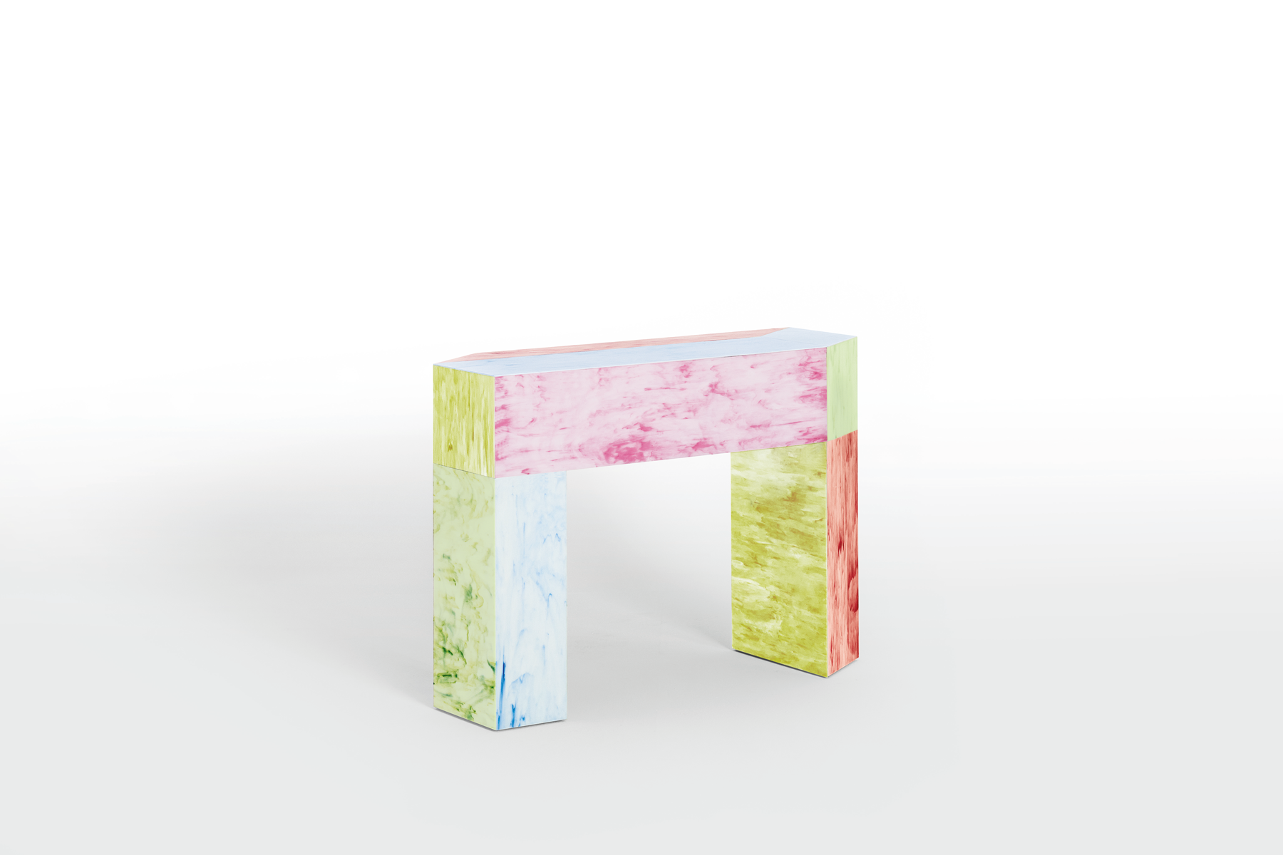 A striking collection featuring a low table and console with wooden structures entirely clad in a mosaic of cast glass tiles in random, vibrant colours. The meticulously shaped tiles create a geometric axonometric pattern across the surface. Each piece includes discreet, functional drawers with a seamless push-pull opening system.