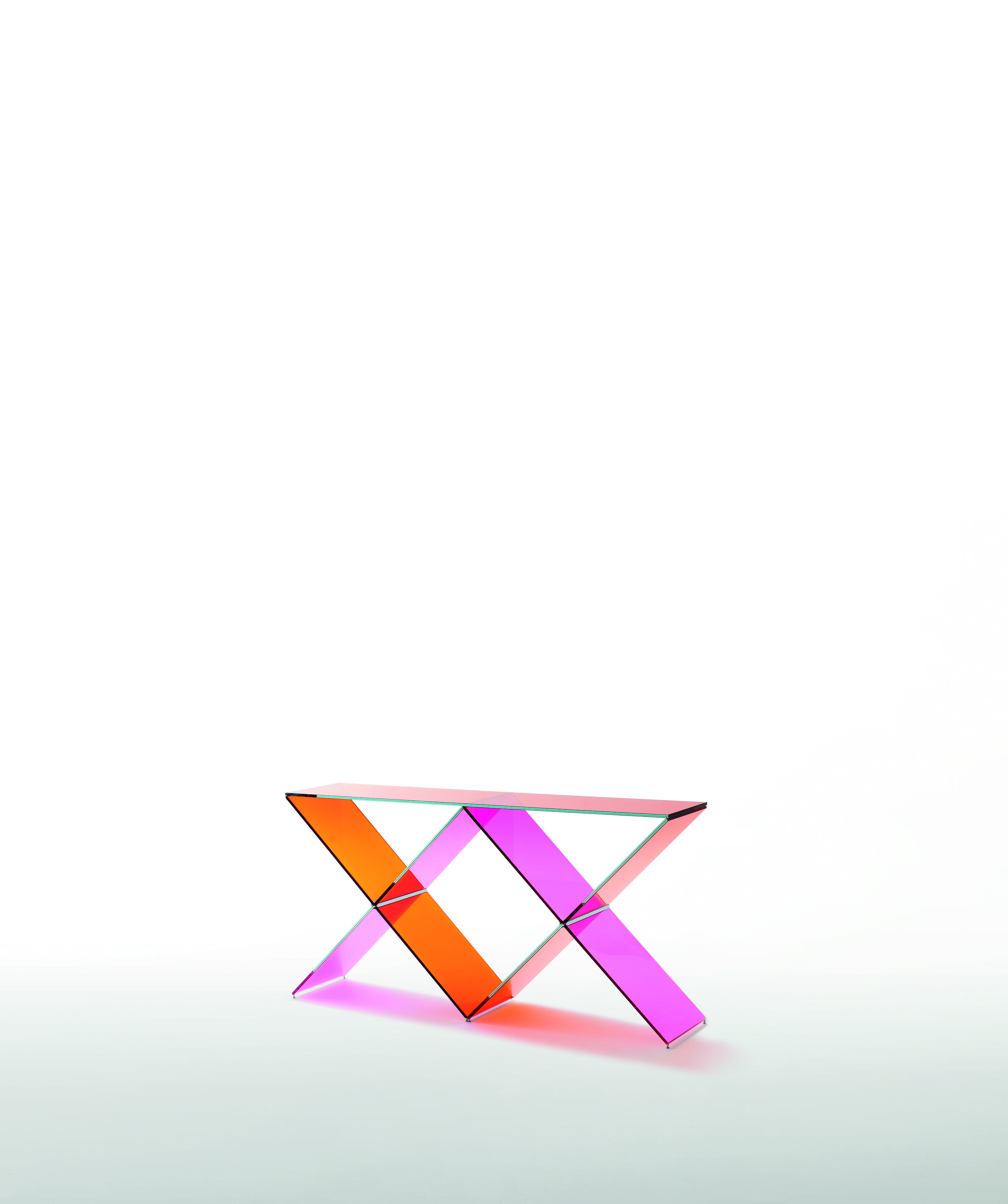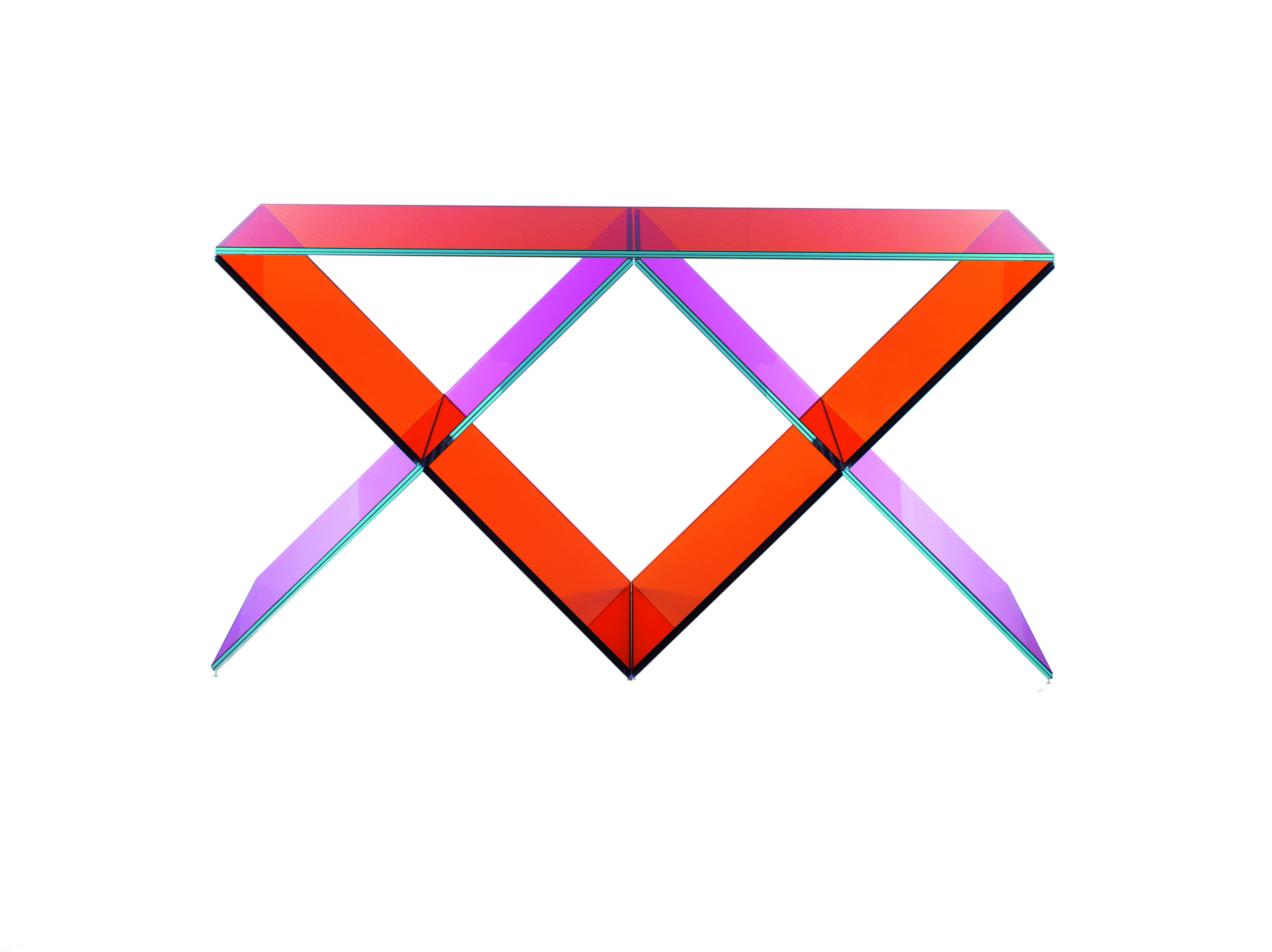 This console is made of transparent pink and orange glass. Its base is made up of two X-shaped pieces made of tempered and laminated 6+6 mm thick glass, with unique chamfering and gluing methods and embellished with polished chrome metal elements. This distinctive base supports the top, which is also made of laminated 6+6 mm thick glass.