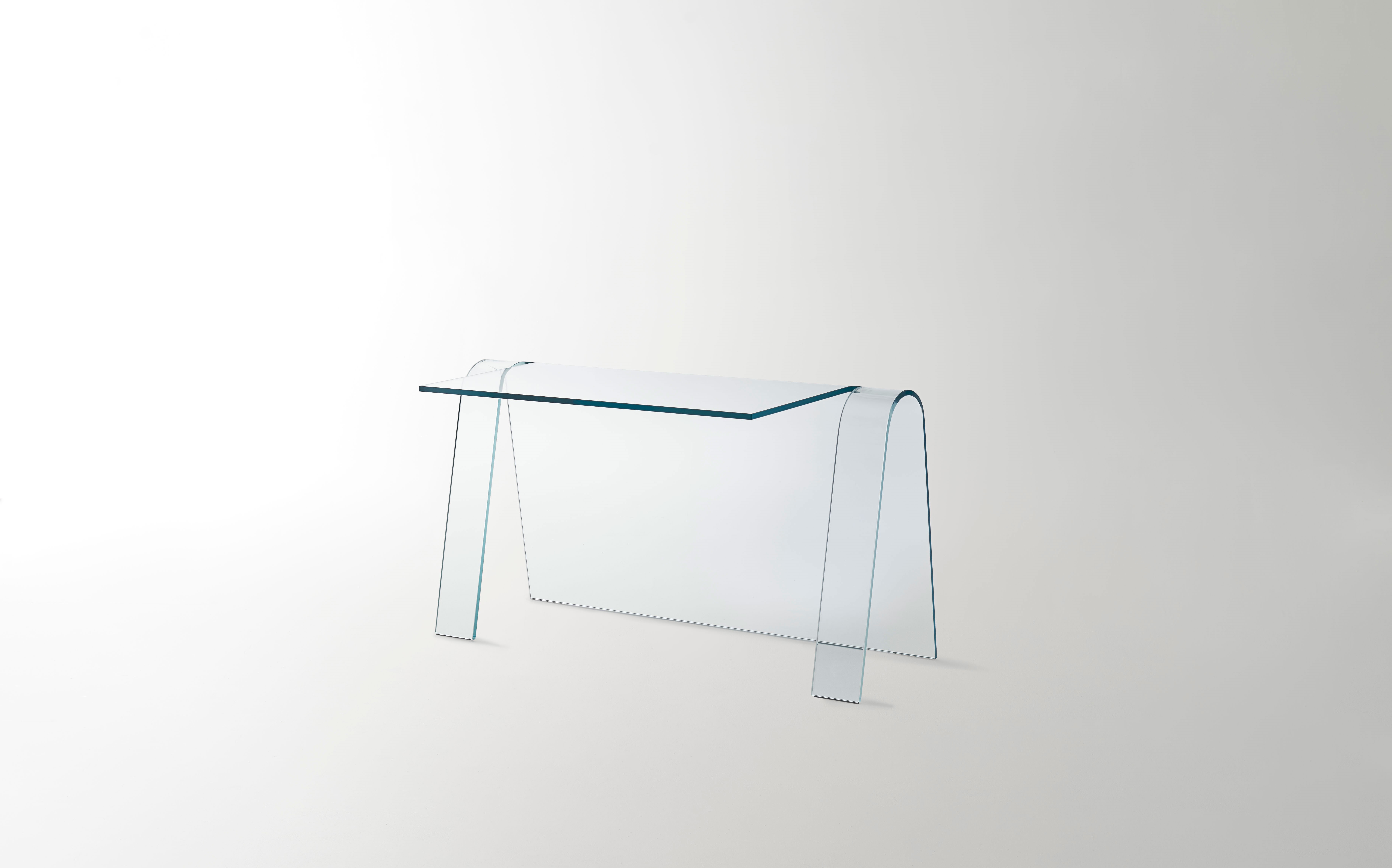 This elegant and minimalist desk is made from a single sheet of 15mm thick curved transparent extra light glass. Its graceful curves and meticulous attention to detail accentuate and highlight the material's inherent qualities.