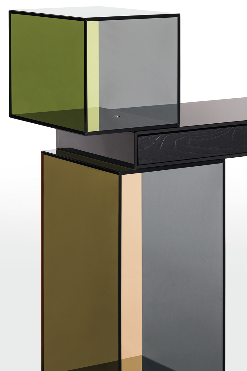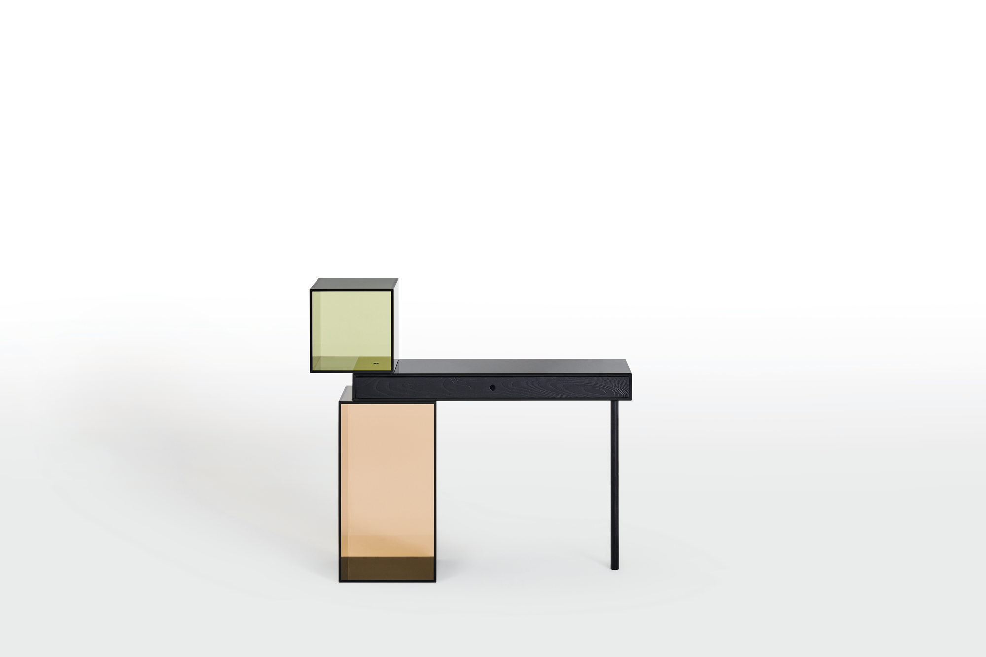 Compact desk crafted from 10 mm tempered smoked glass boxes, joined at 45° with sleek black anodized aluminum joints. The top box features a solid black stained ash drawer that glides smoothly on velvet inserts, with invisible safety stops. Additional boxes serve as storage and can include colored transparent glass back panels. A cylindrical solid ash leg in matte black supports the top, ensuring stability and balance.