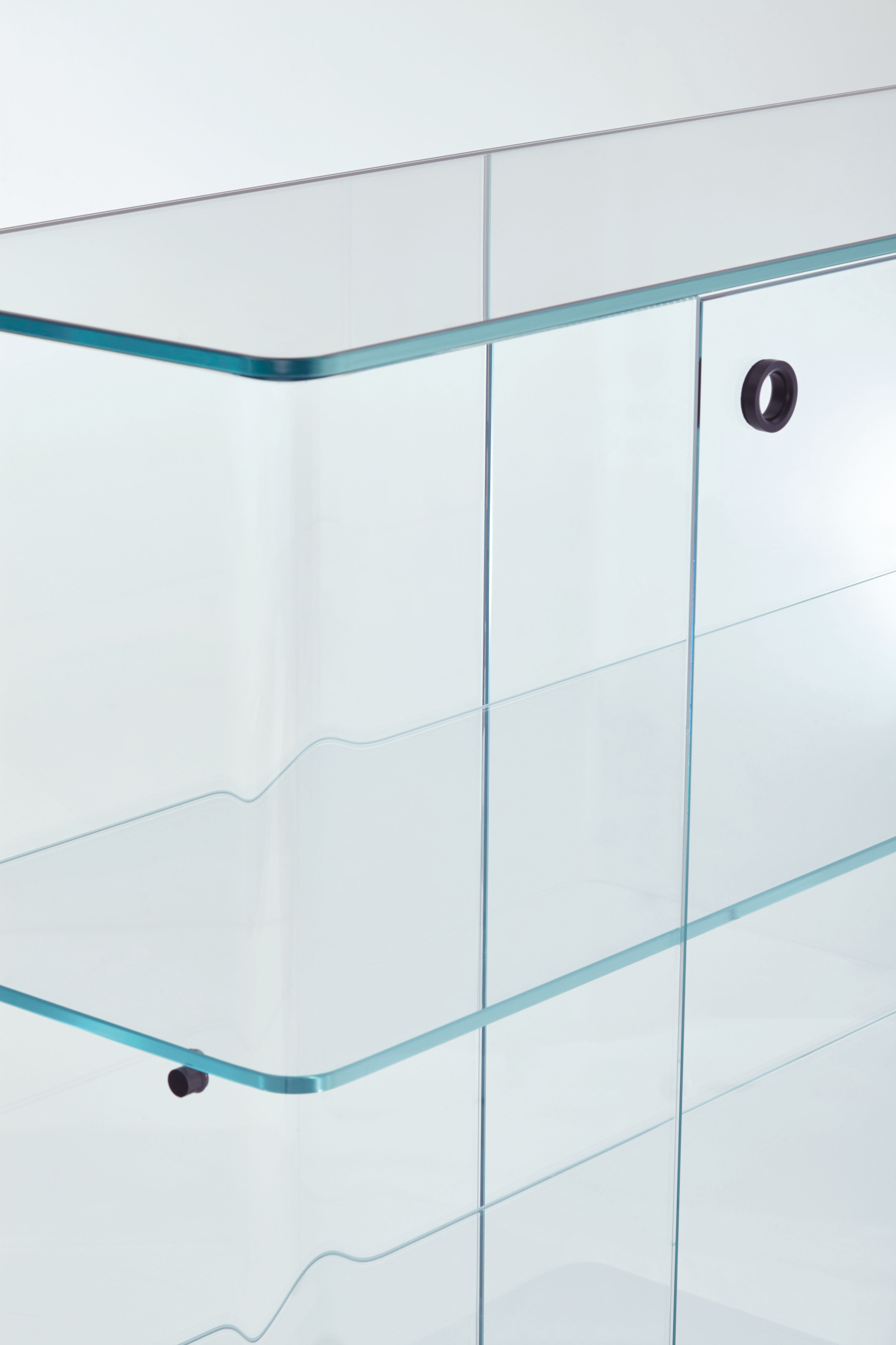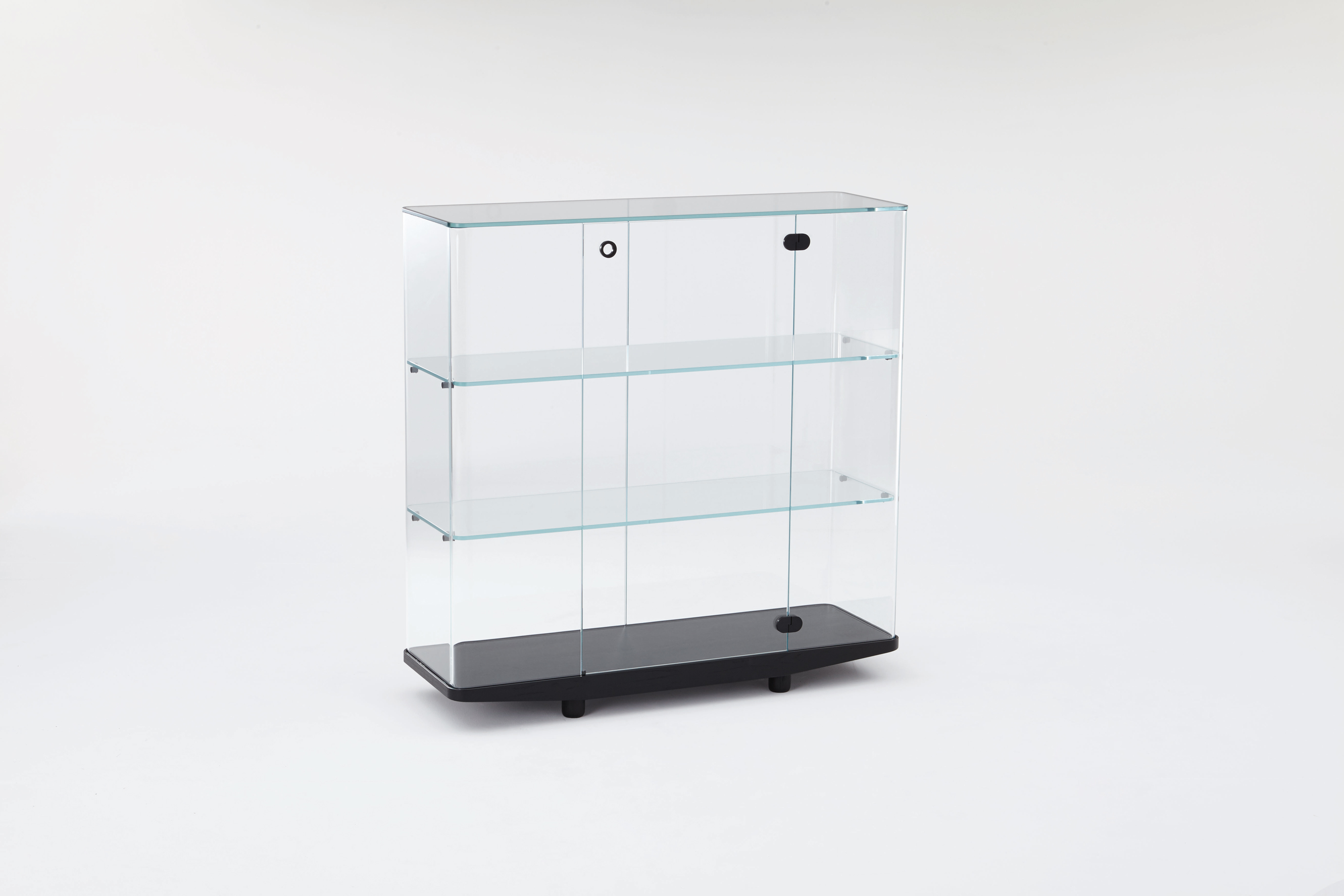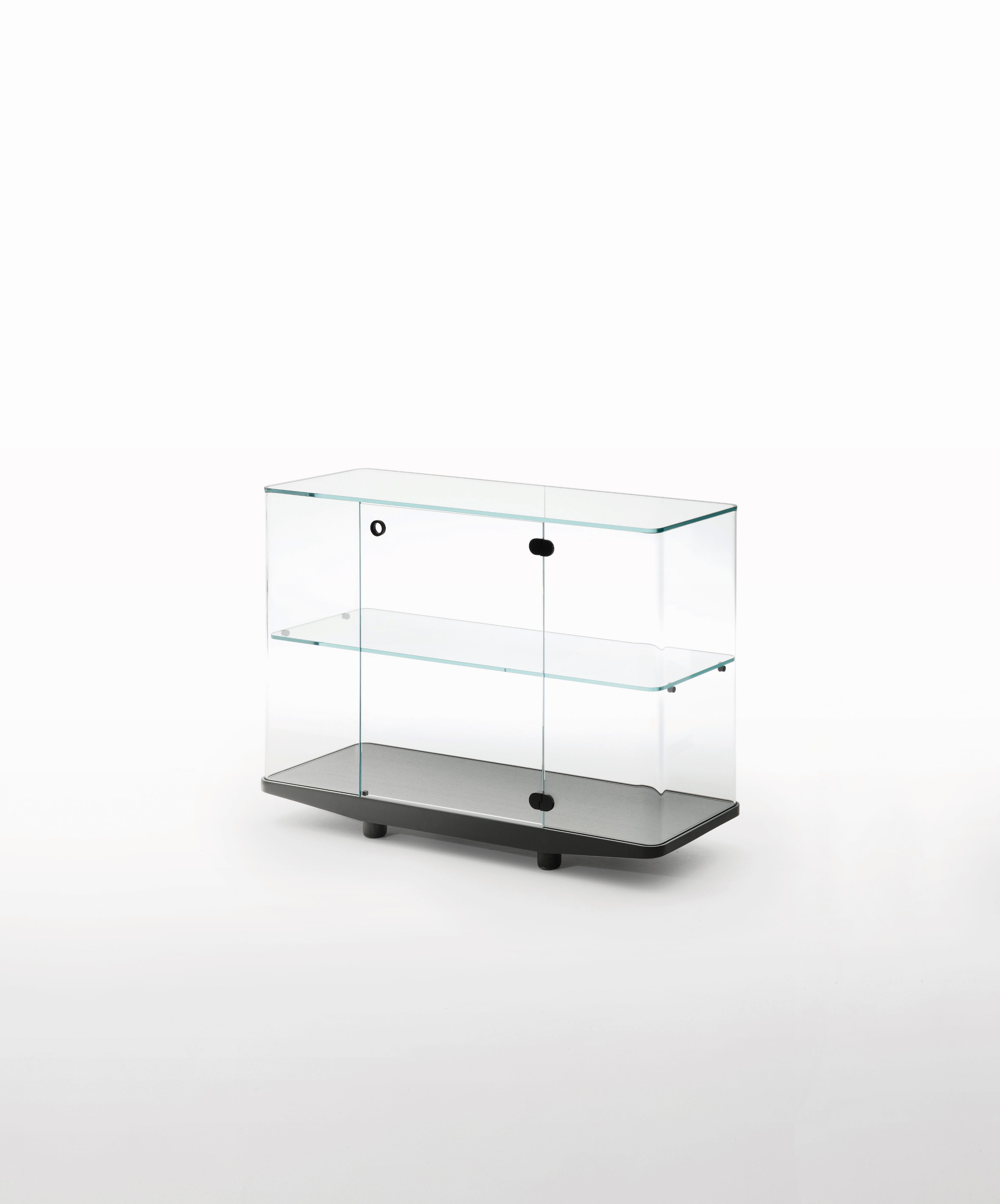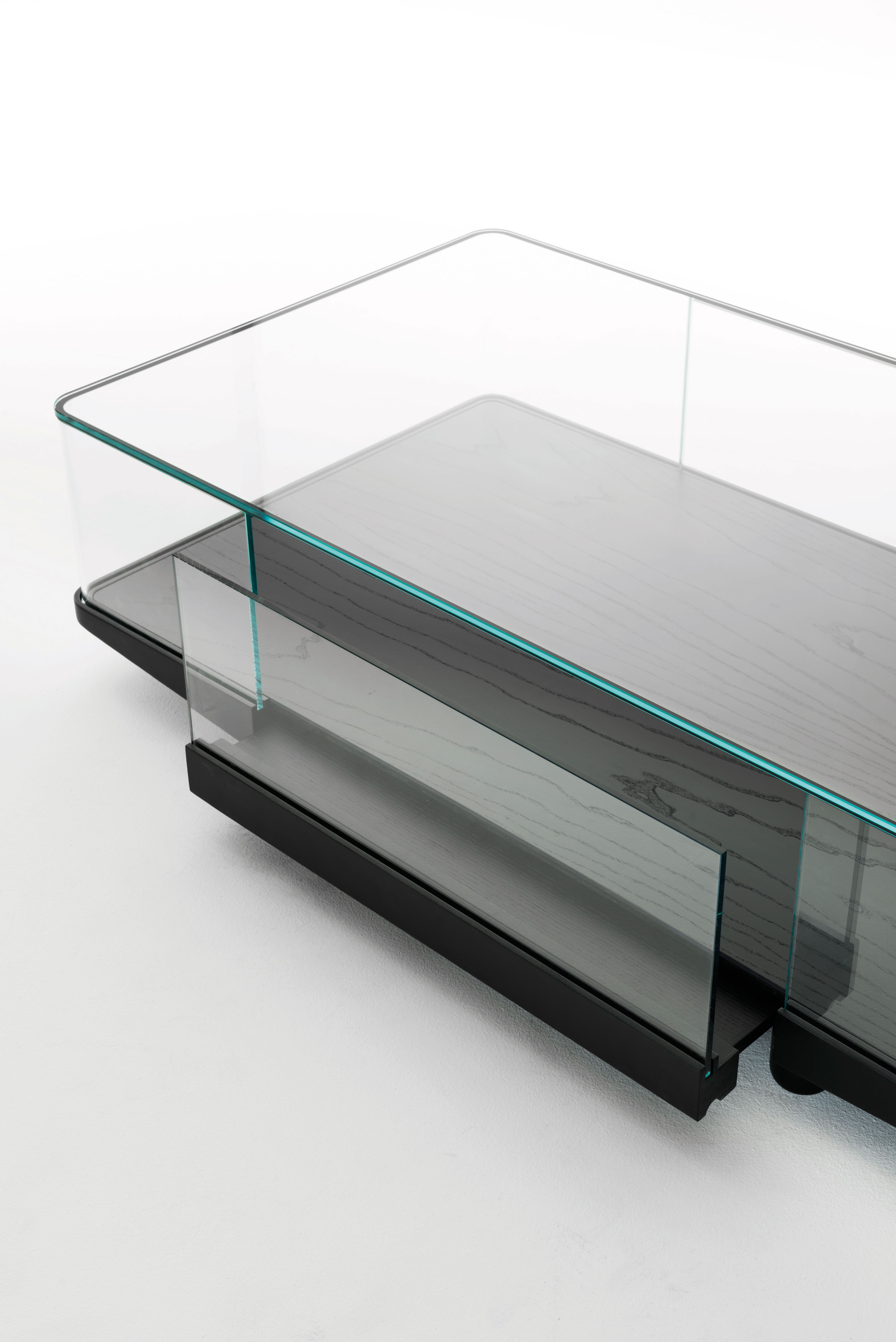 Low tables and display units made of 8mm transparent extra light glass with curved sides that seamlessly align with the attached tops are featured in this collection. A shelf and black anodized aluminium hardware are included with the display units. The unit bases are made of solid open-pore black lacquered ash, and the low tables have a recessed mirror. The display units (COR03-COR06) have doors, whereas the low tables have two sliding front parts.