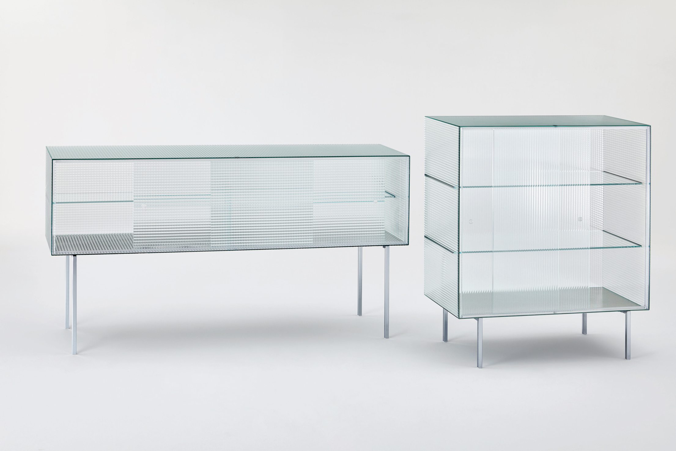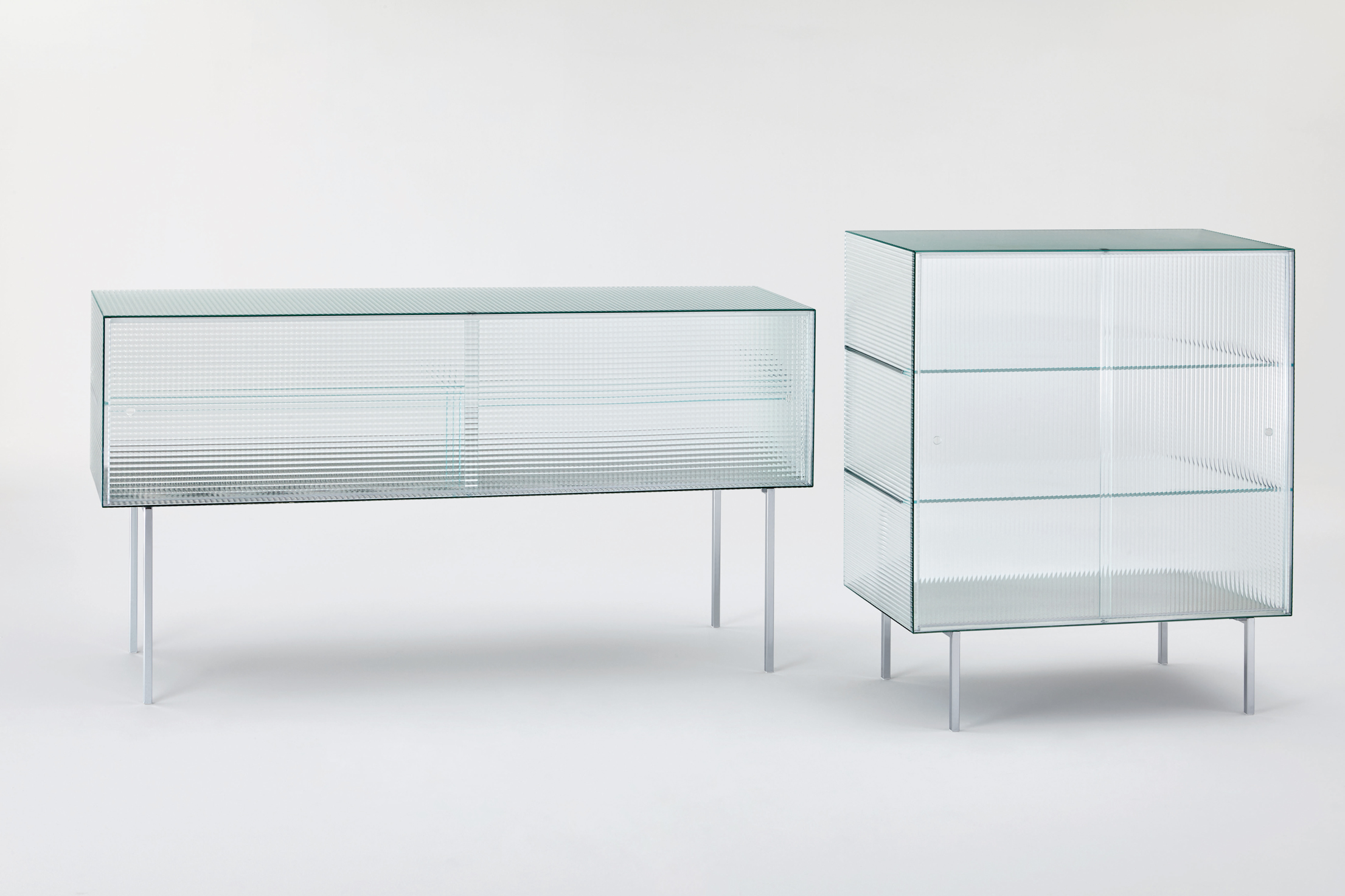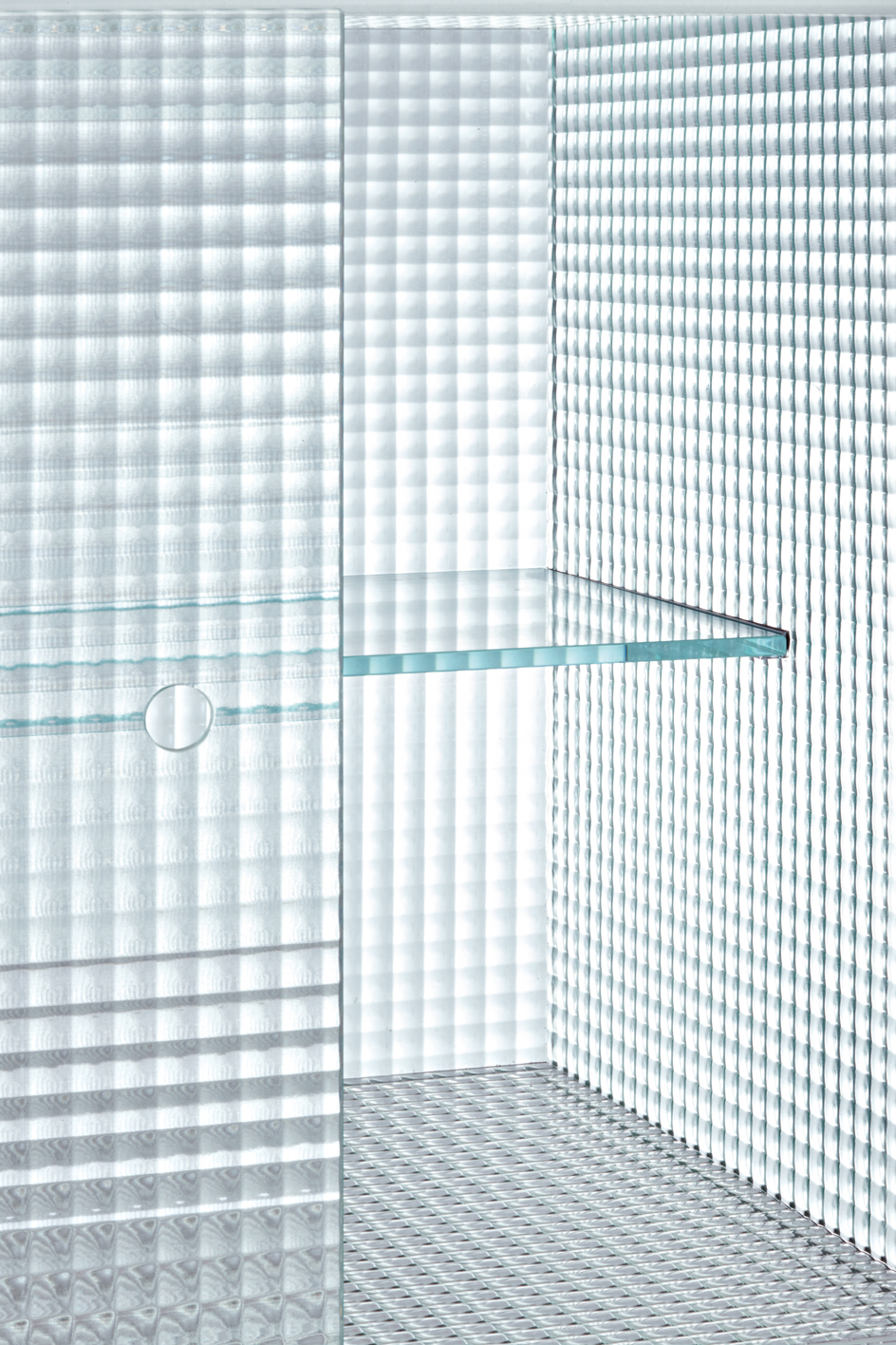 This storage piece is made of 8mm tempered checked-patterned glass that has been securely bonded at a 45° angle atop a silvered base. Its sliding doors glide along transparent plexiglass tracks and are supported by sleek chromium-plated metal legs. 8mm thick tempered extra light glass shelves are included, enhancing its functionality.