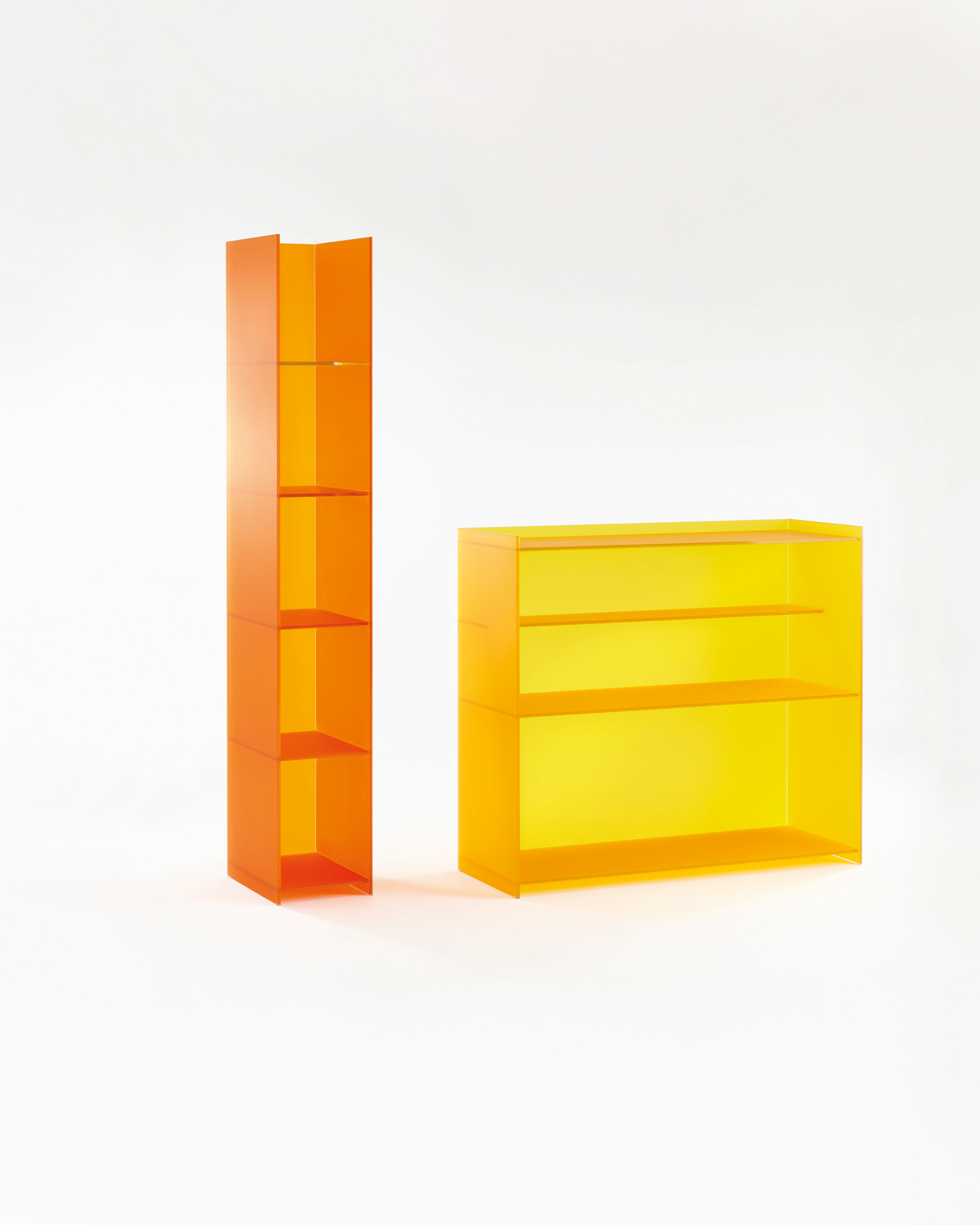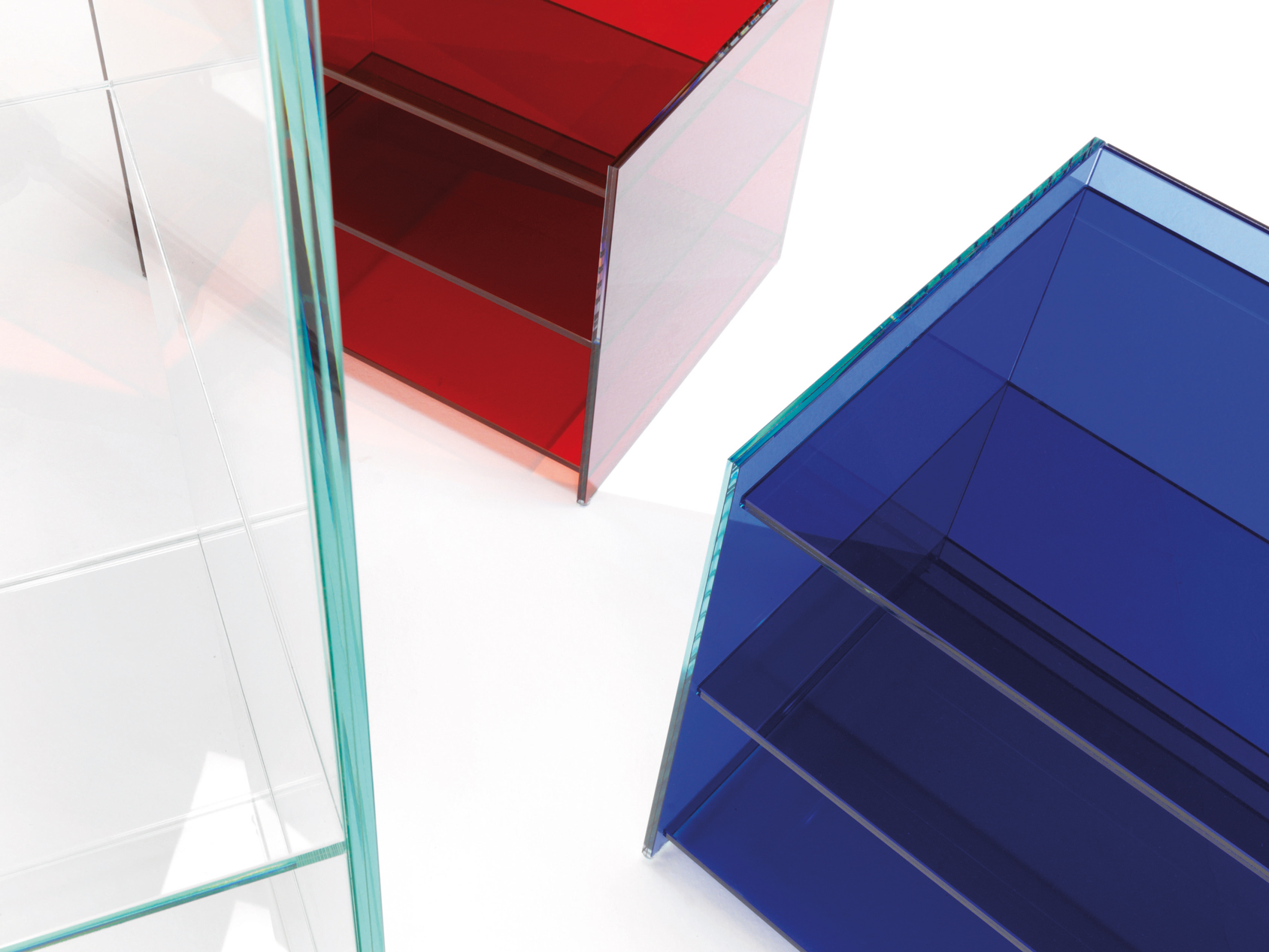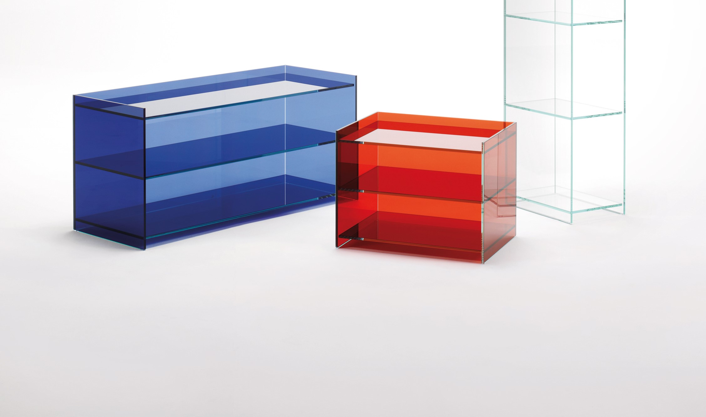 This collection features open storage furniture made of 5 + 5mm thick shiny ground and thermo-welded laminated glass. Choose between transparent extra light glass and transparent coloured glass.