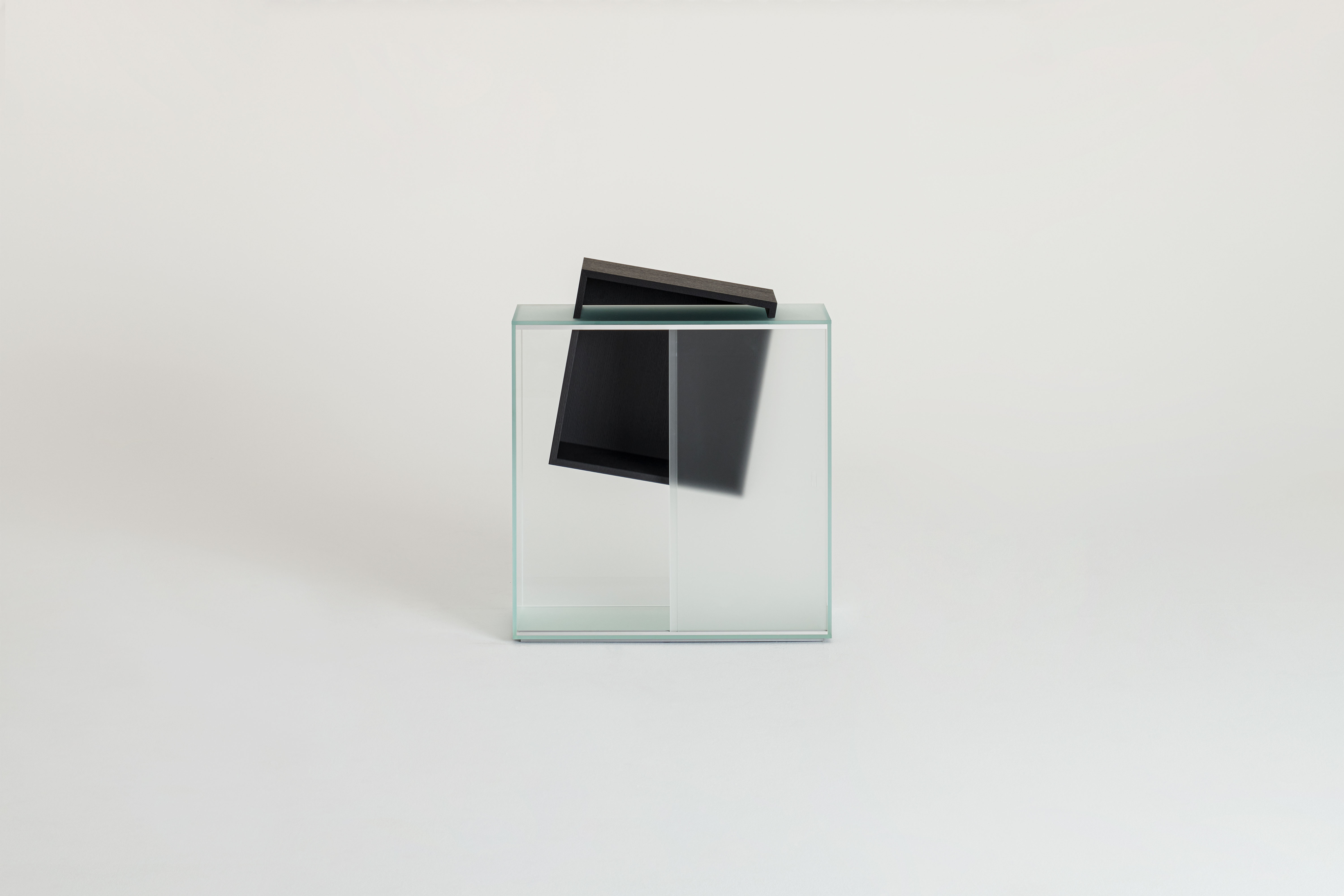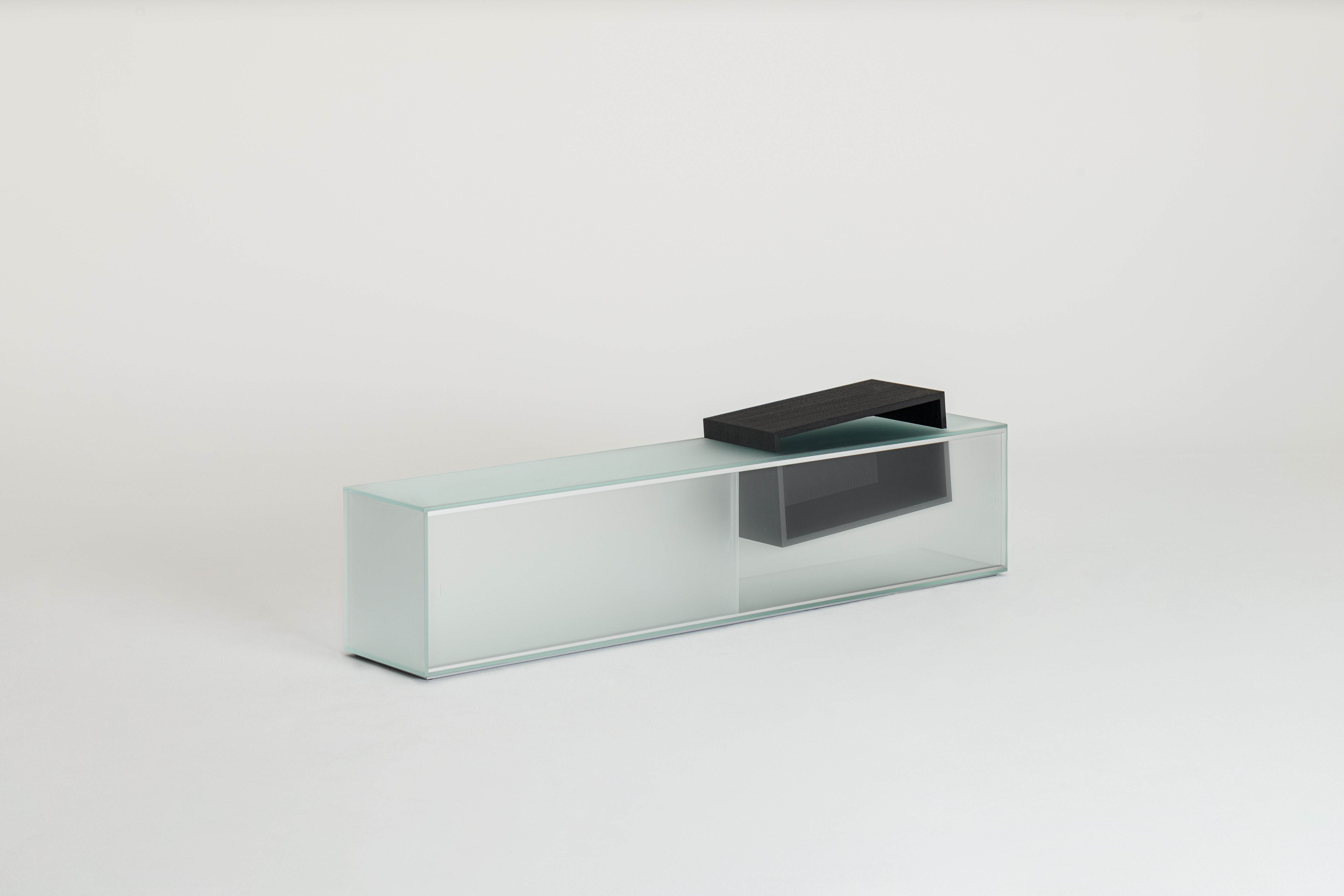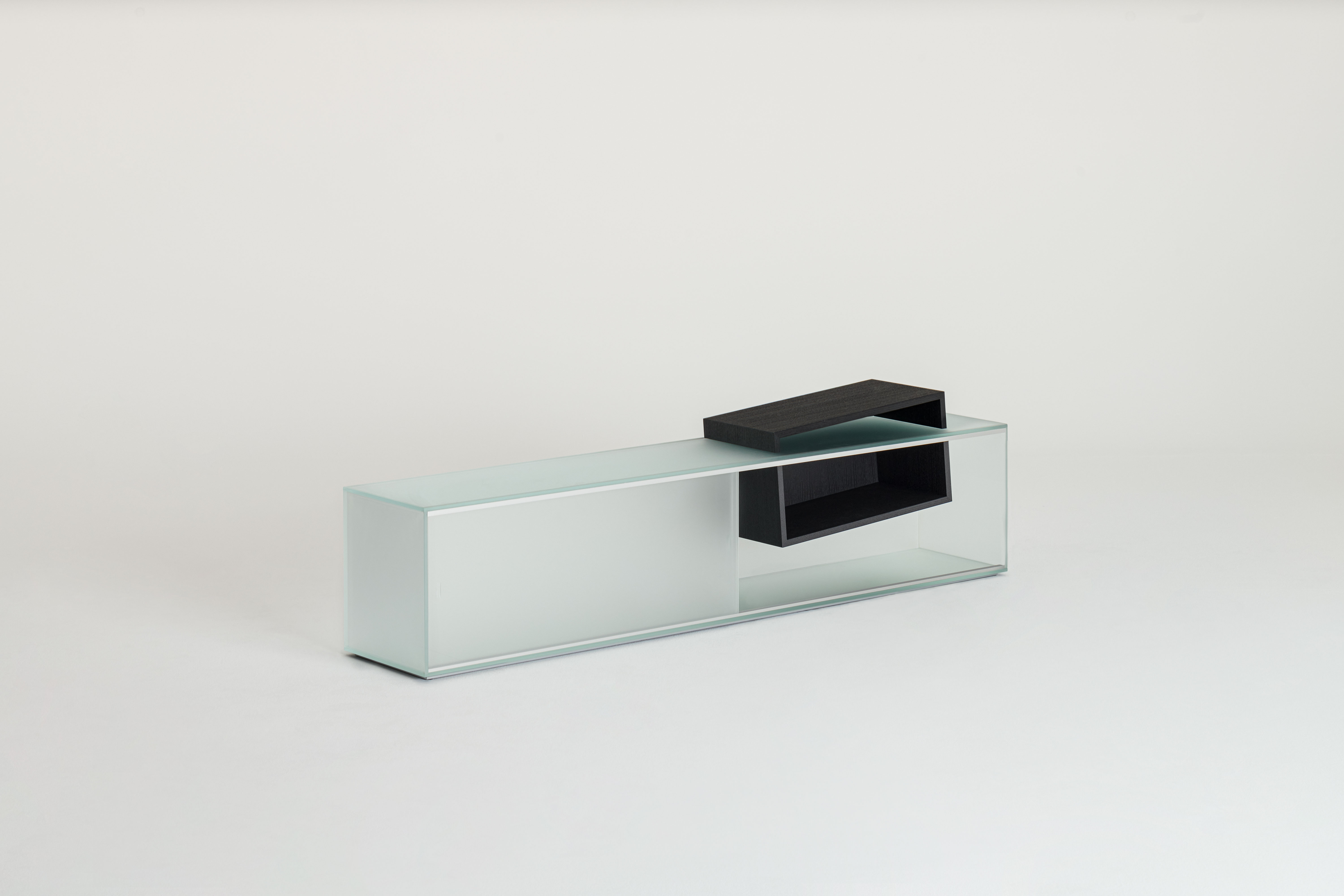 Storage furniture with sliding doors made of tempered, UV-bonded, acid-etched extra-clear glass is featured in this collection. A black oak wooden box serves as a storage unit, with one part remaining inside while the other rests on top, creating the illusion of a solid mass partially emerging as if floating in a liquid. The sliding doors are supported by natural anodized aluminium profiles, and the silvered glass base adds radiance and luminosity to the furniture.