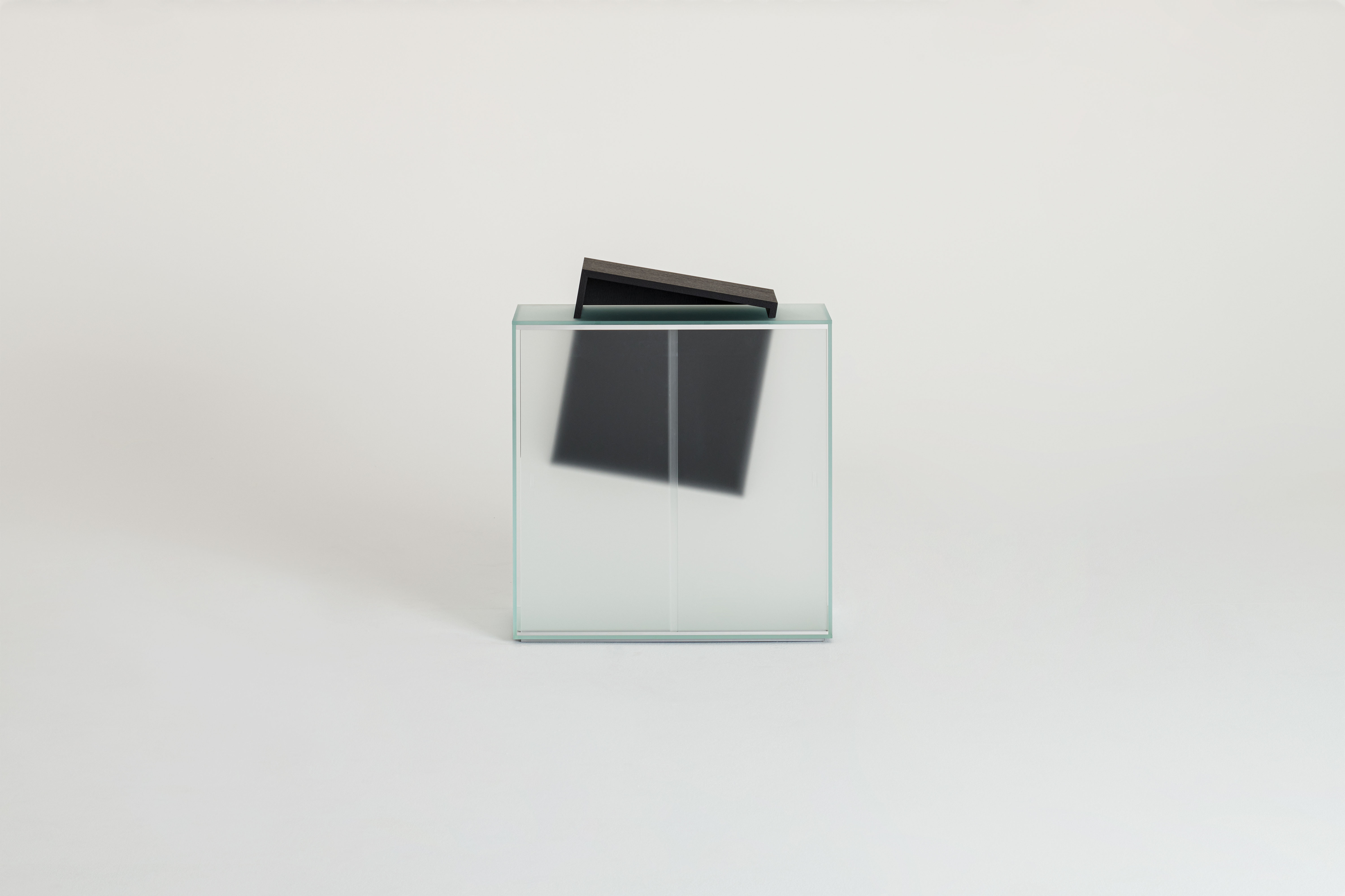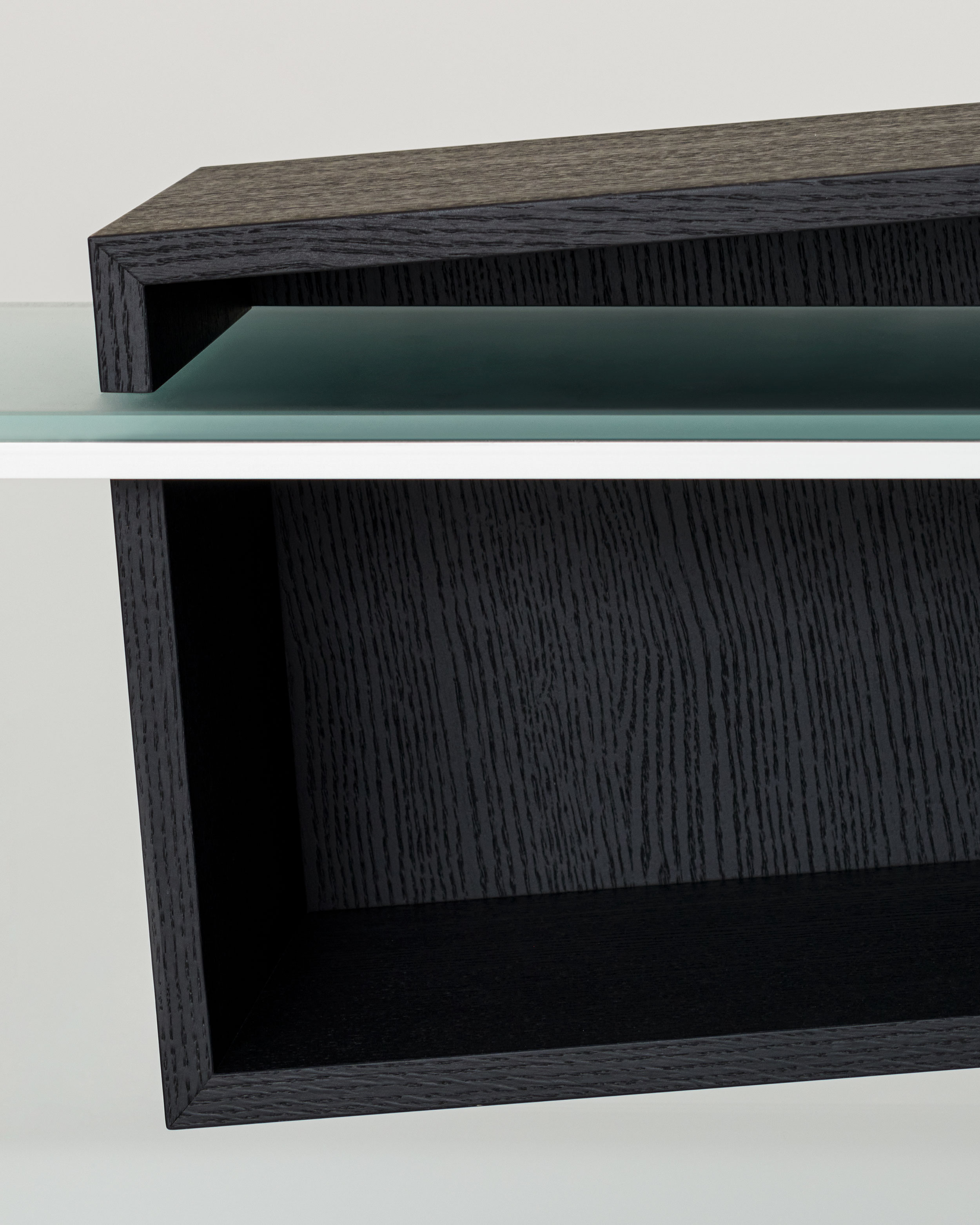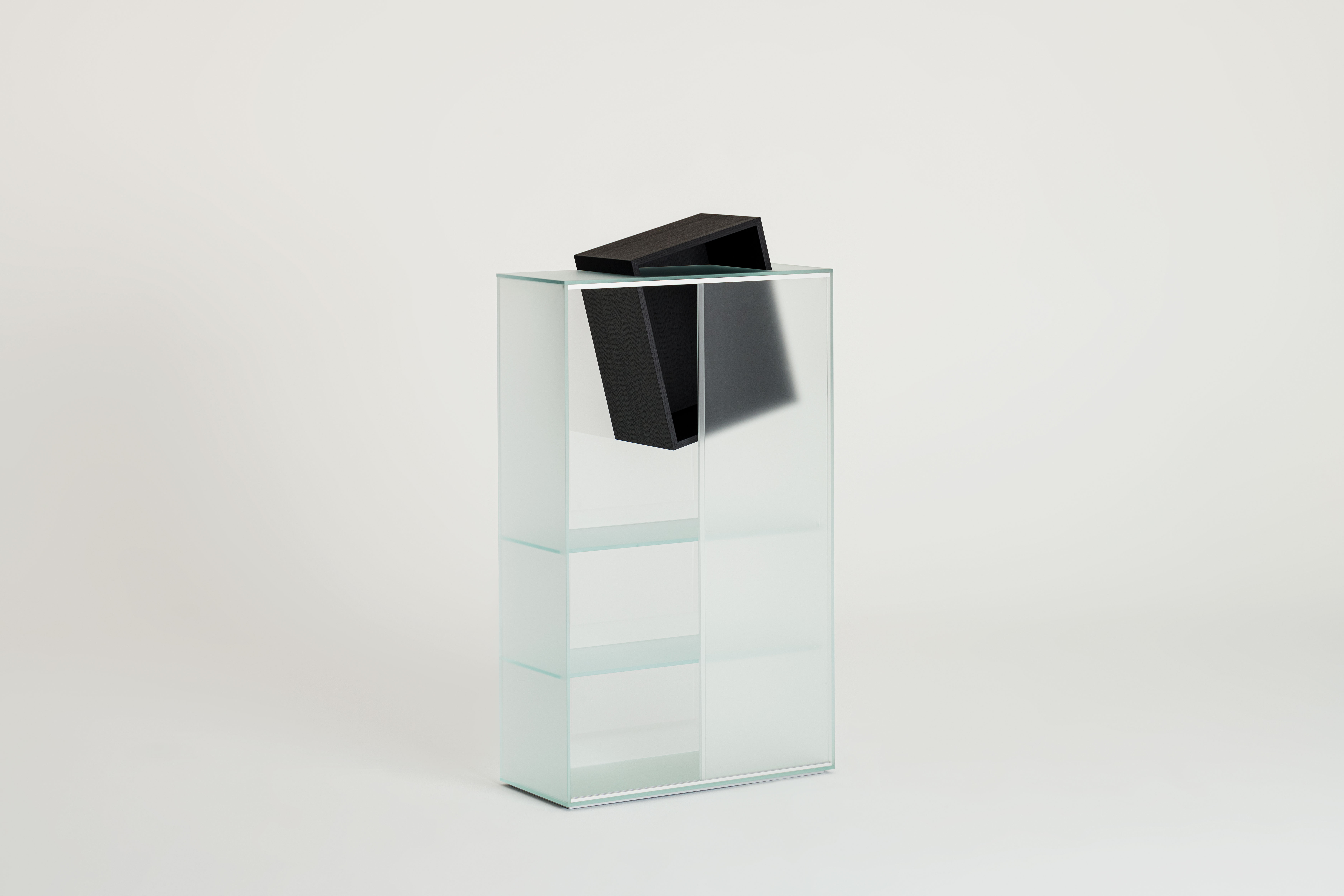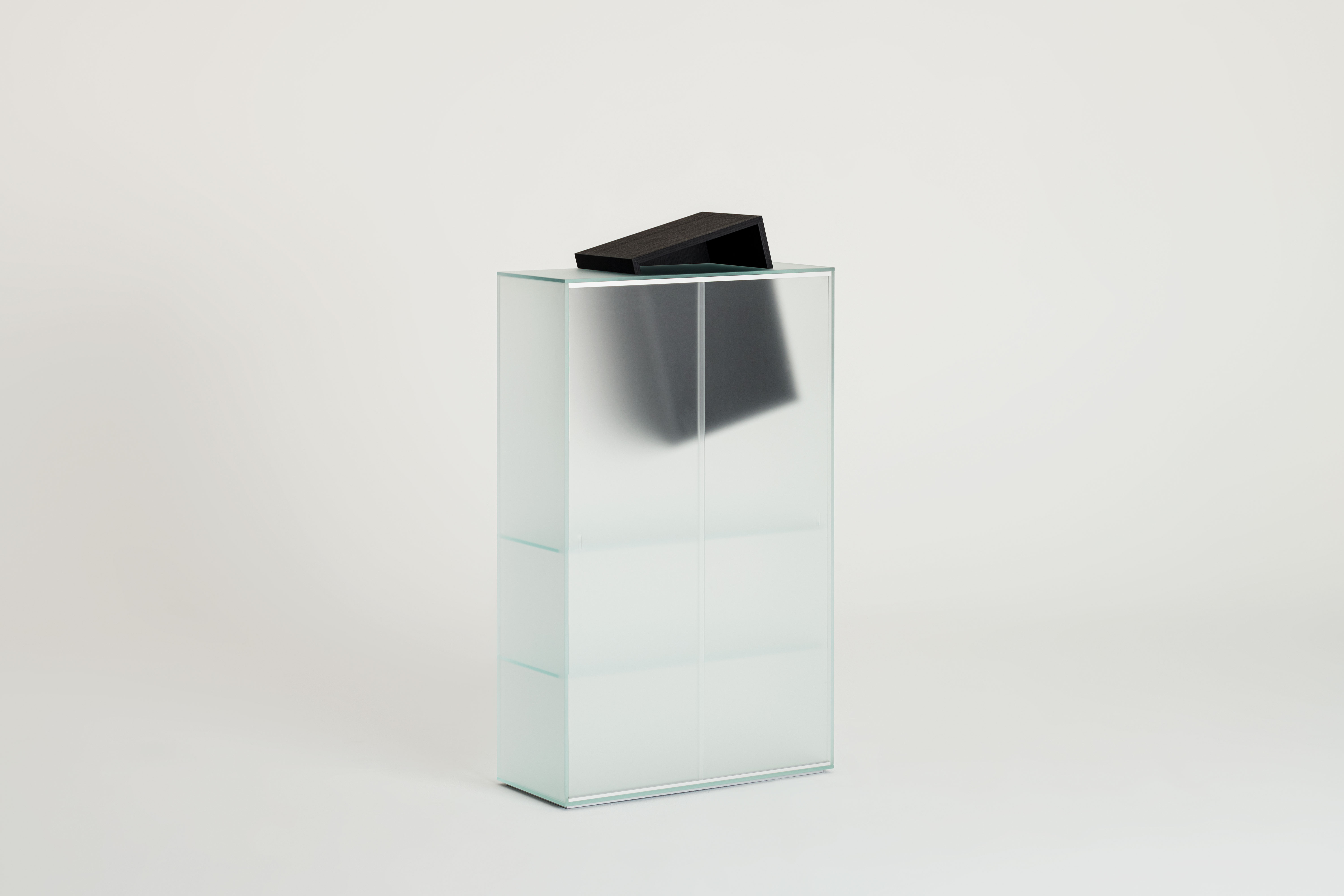 Storage furniture with sliding doors made of tempered, UV-bonded, acid-etched extra-clear glass is featured in this collection. A black oak wooden box serves as a storage unit, with one part remaining inside while the other rests on top, creating the illusion of a solid mass partially emerging as if floating in a liquid. The sliding doors are supported by natural anodized aluminium profiles, and the silvered glass base adds radiance and luminosity to the furniture.