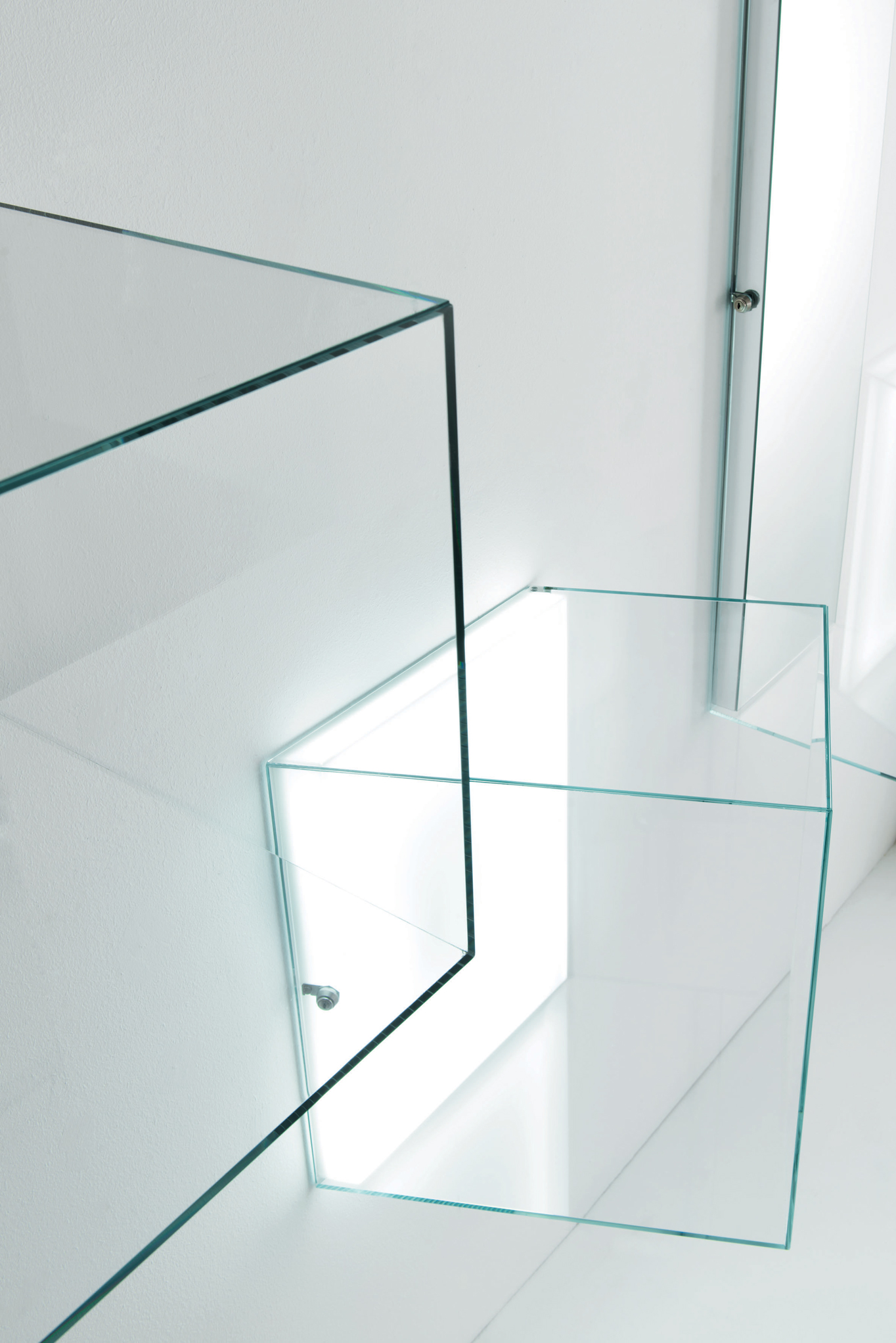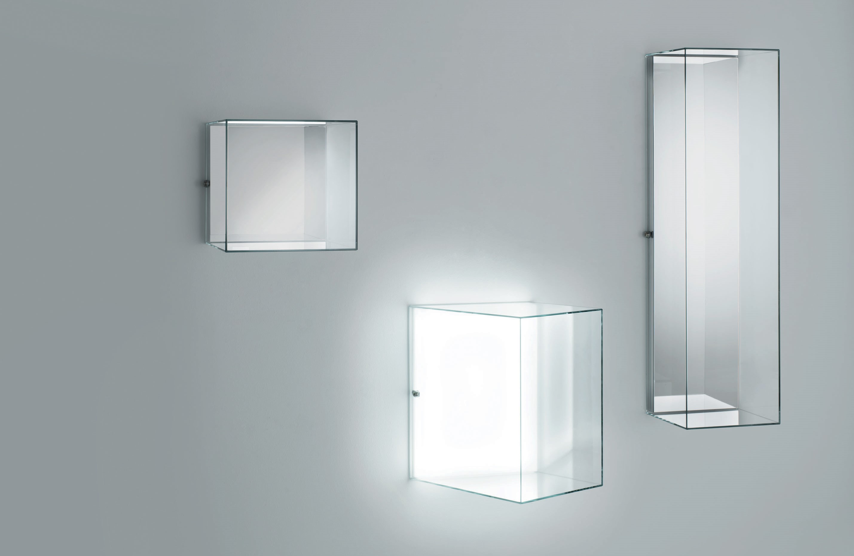 This collection includes suspended display cases that are securely locked and made of 6mm thick transparent extra light tempered glass that is bonded at a 45° angle. Straight (parallelepiped shape) and oblique (irregular prism shape) versions are available, with options for a mirrored back or an illuminated LED system. Objects placed within these cases appear to float in midair. Special hinges attached to the wall via a frame allow the glass cases to rotate for easy access. Each display case has a maximum weight capacity of 15 kg.
