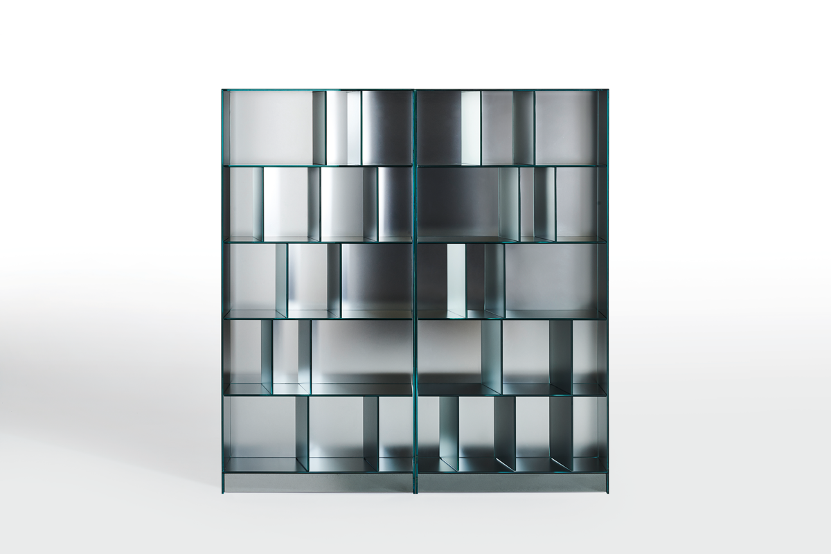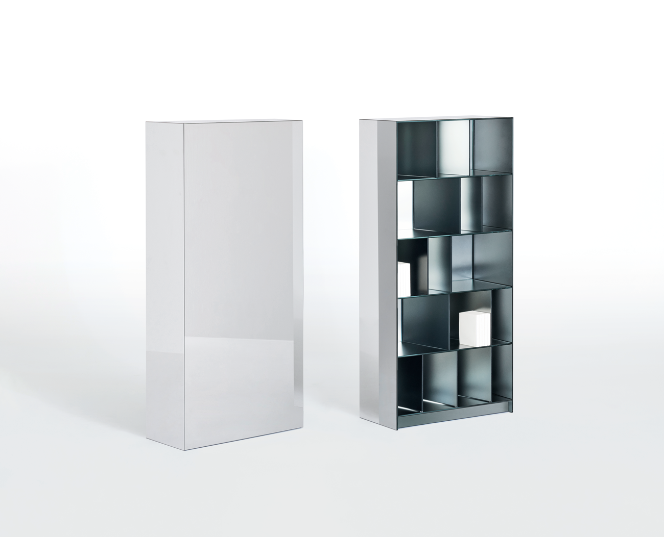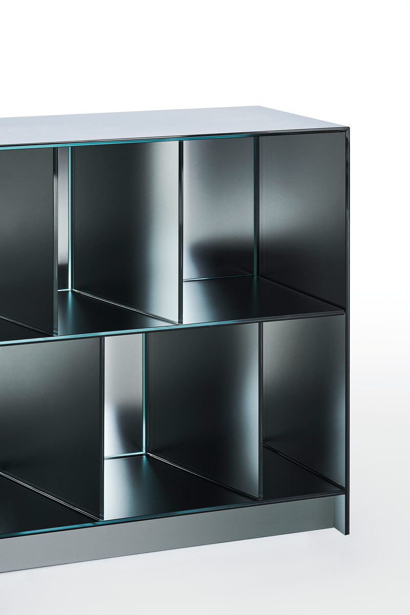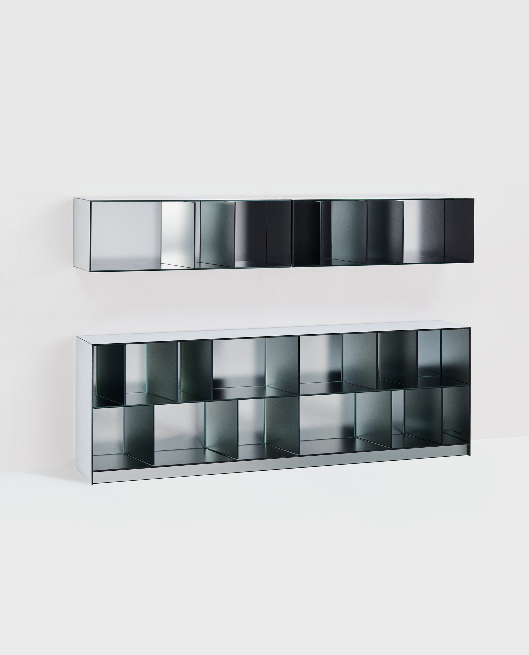 Open storage units crafted from 5+5 mm laminated glass with polished edges sealed at 45°. The exterior features a special mirrored finish, while the interior has an opaque mirror surface that softly blurs reflections for a subtle, elegant effect.