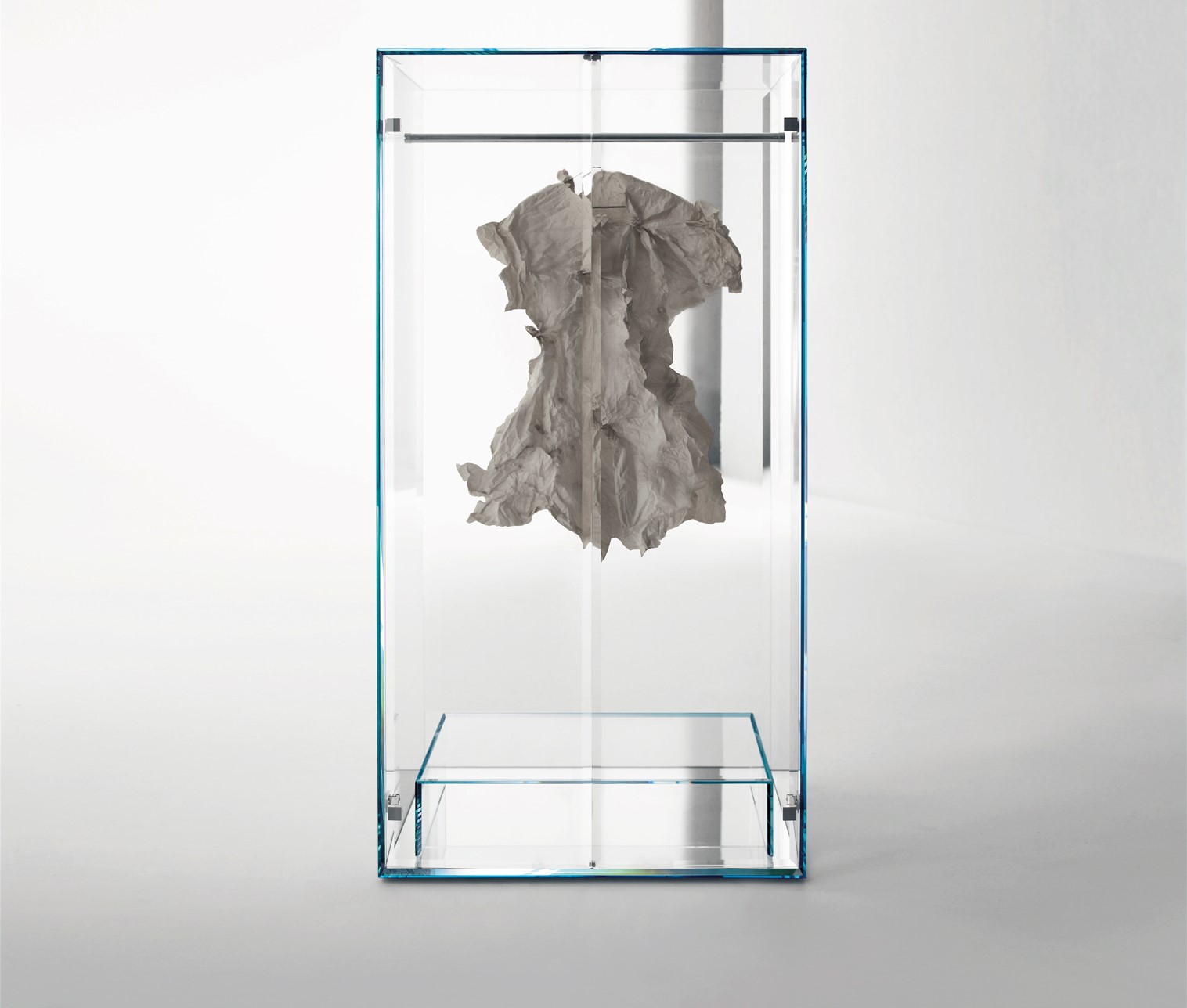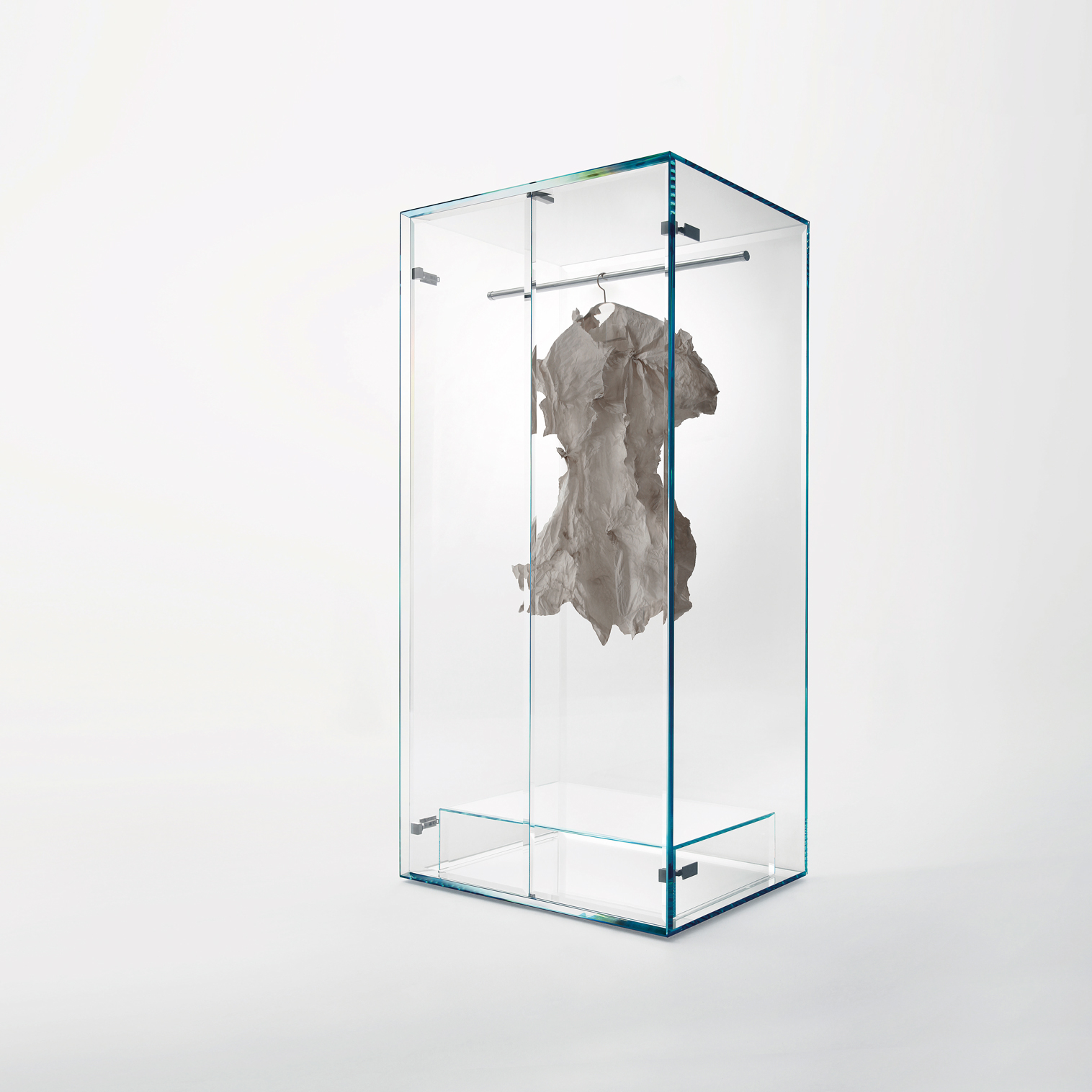 This wardrobe is made of 12mm transparent extra light tempered glass that has been thermo-welded with precise bevelling to reflect and refract light beautifully. It stands on an extra light mirror base with a coat hanger bar and polished steel hardware. A small bench made of the same material and style as the storage unit on the base completes the look. The doors are made of 8mm transparent extra light tempered glass and open easily with a push-pull system. This unit beautifully highlights and displays clothing and objects placed within it.