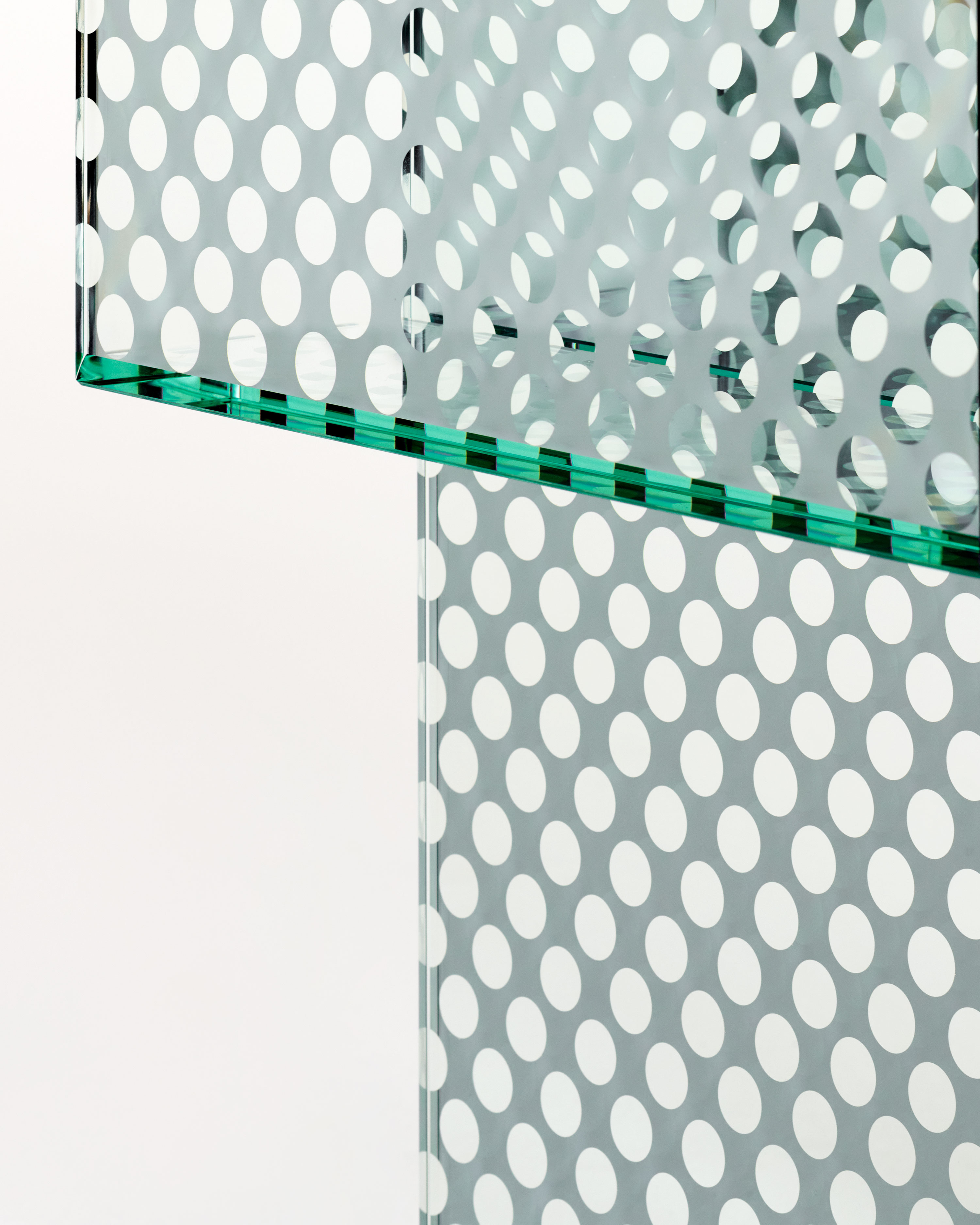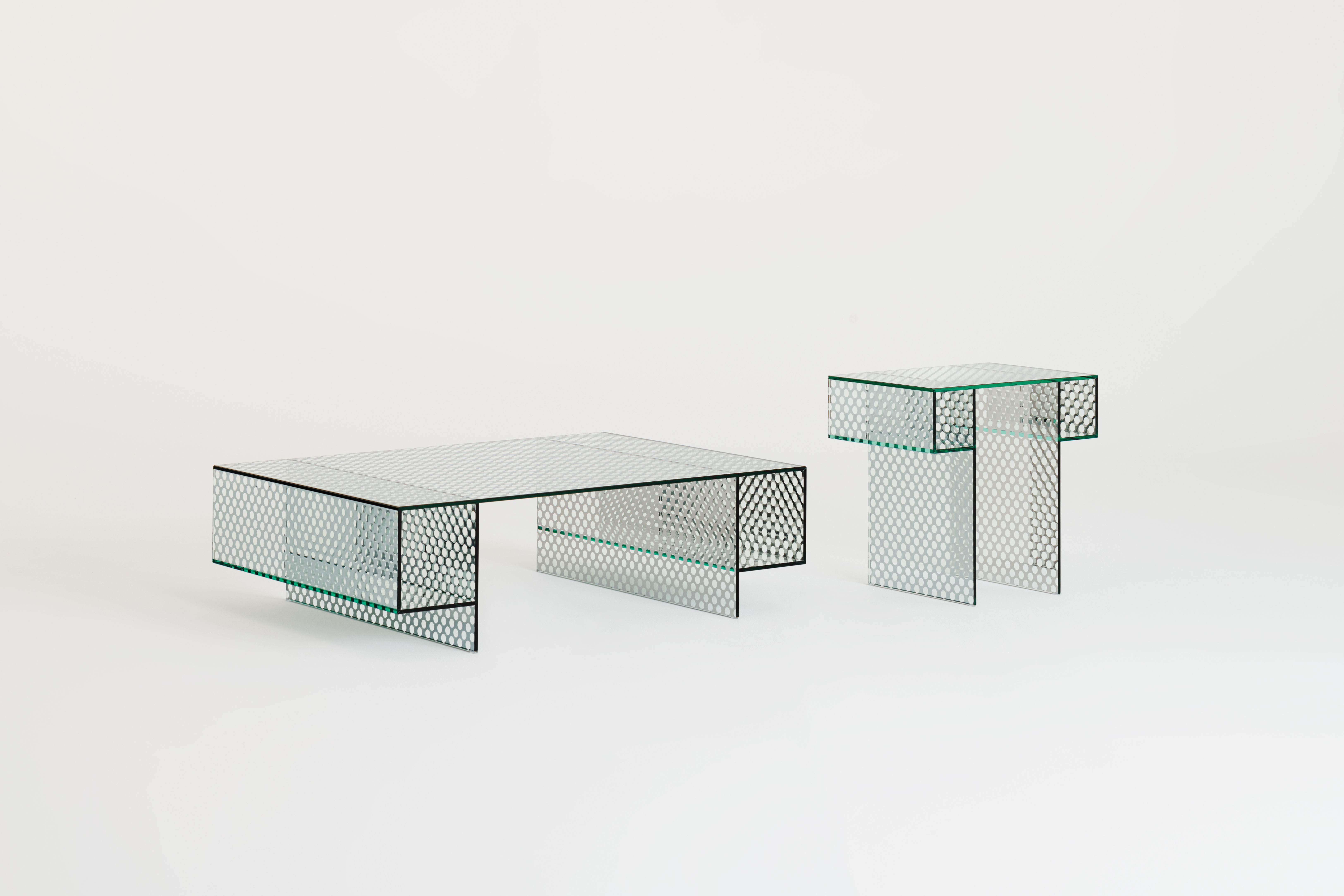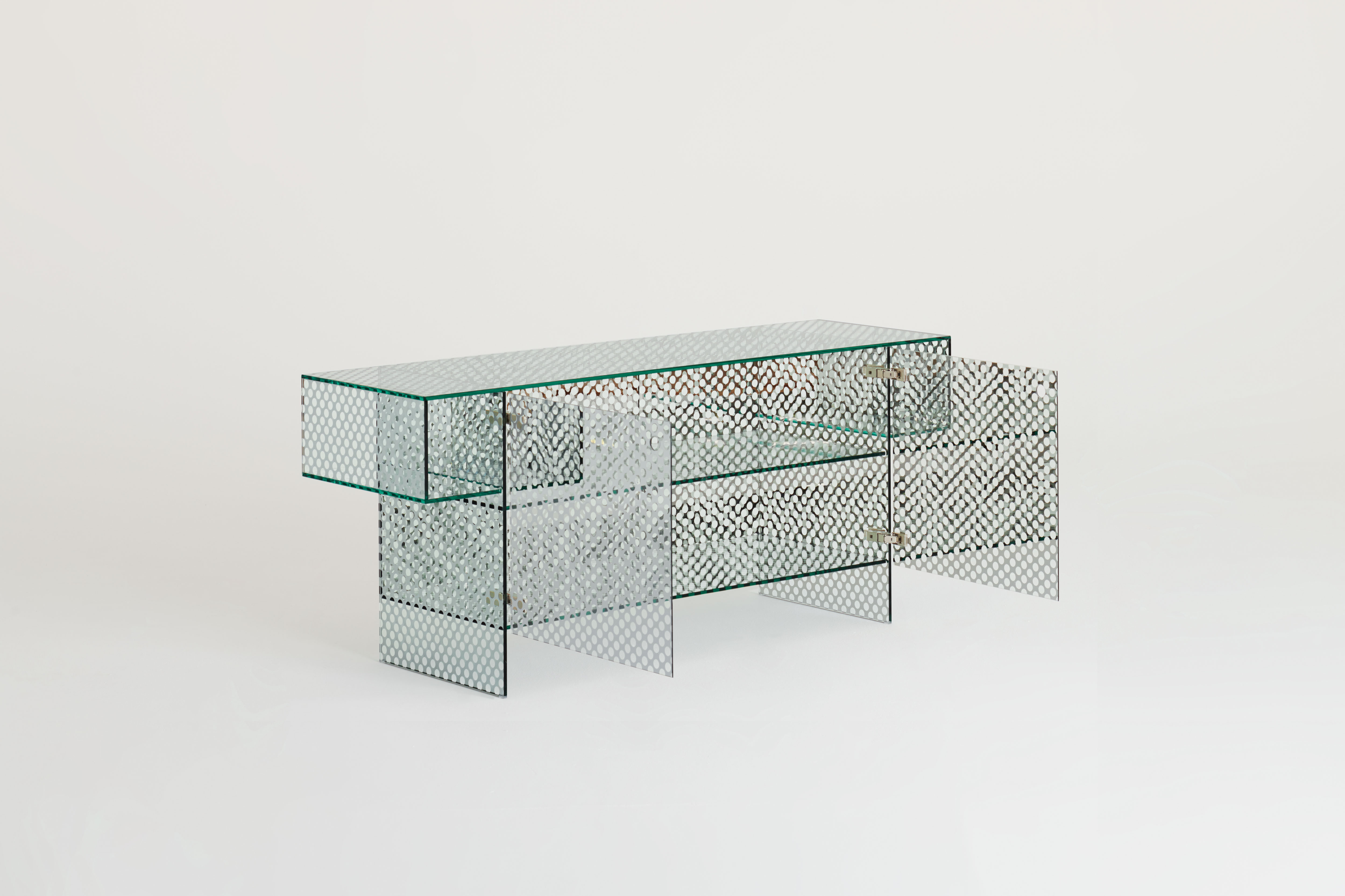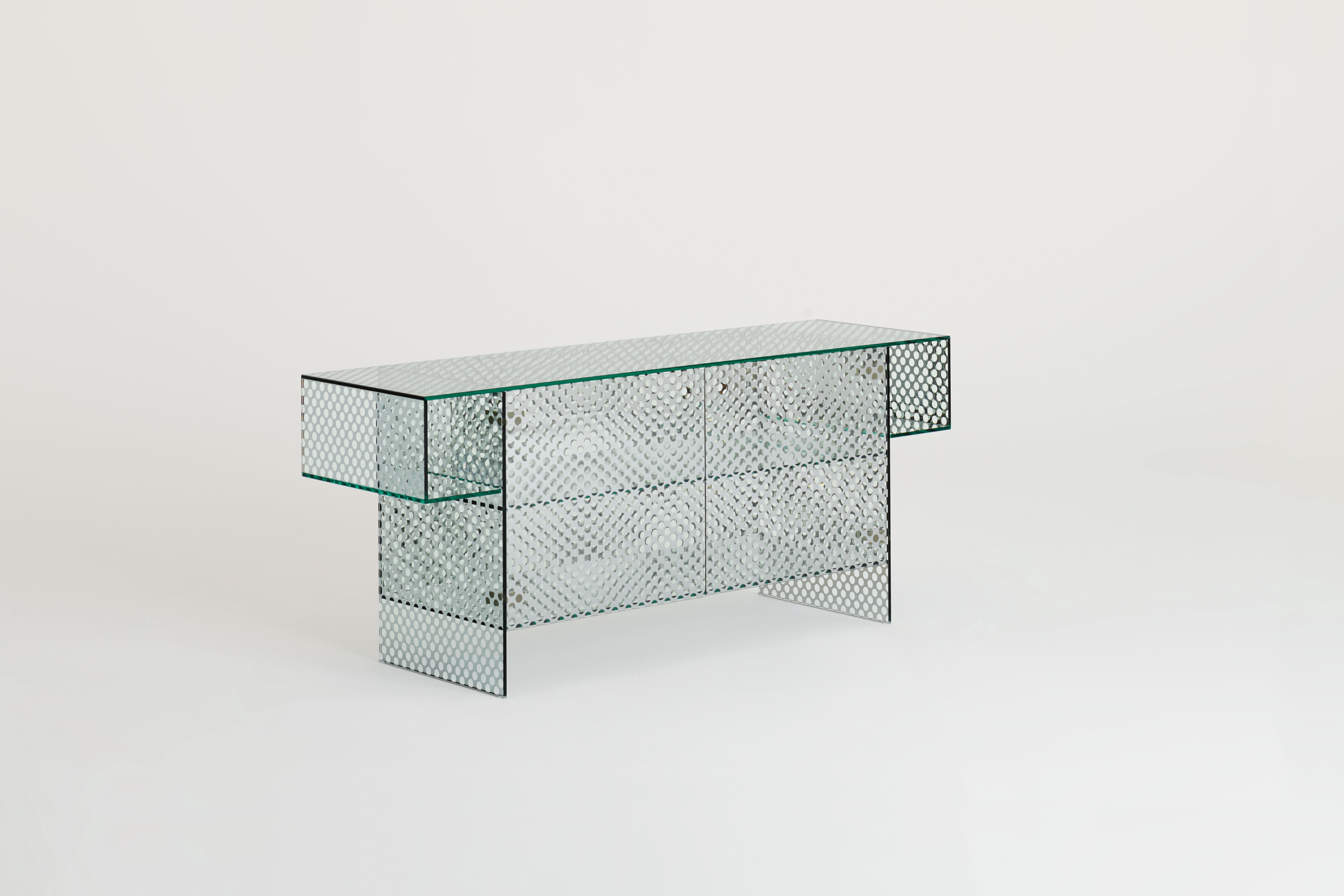 This collection includes low tables, consoles, and storage furniture made entirely of a one-of-a-kind double-sided mirrored glass. The glass has a decorative pattern that looks like round transparent marks, creating a perforated metal sheet effect. The glass is all tempered and UV bonded, and the doors operate with a simple push-pull system.