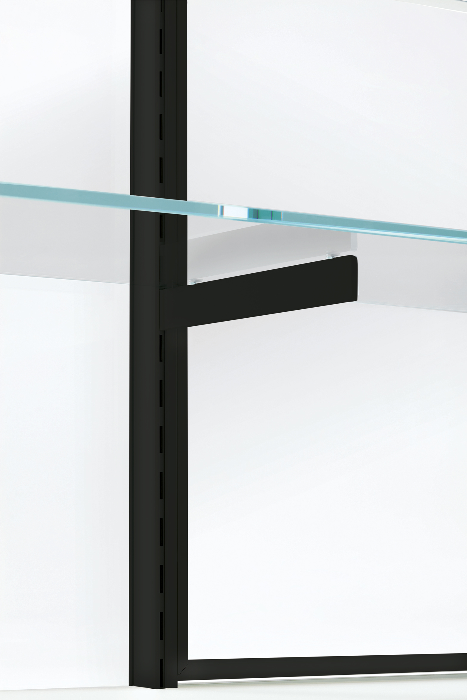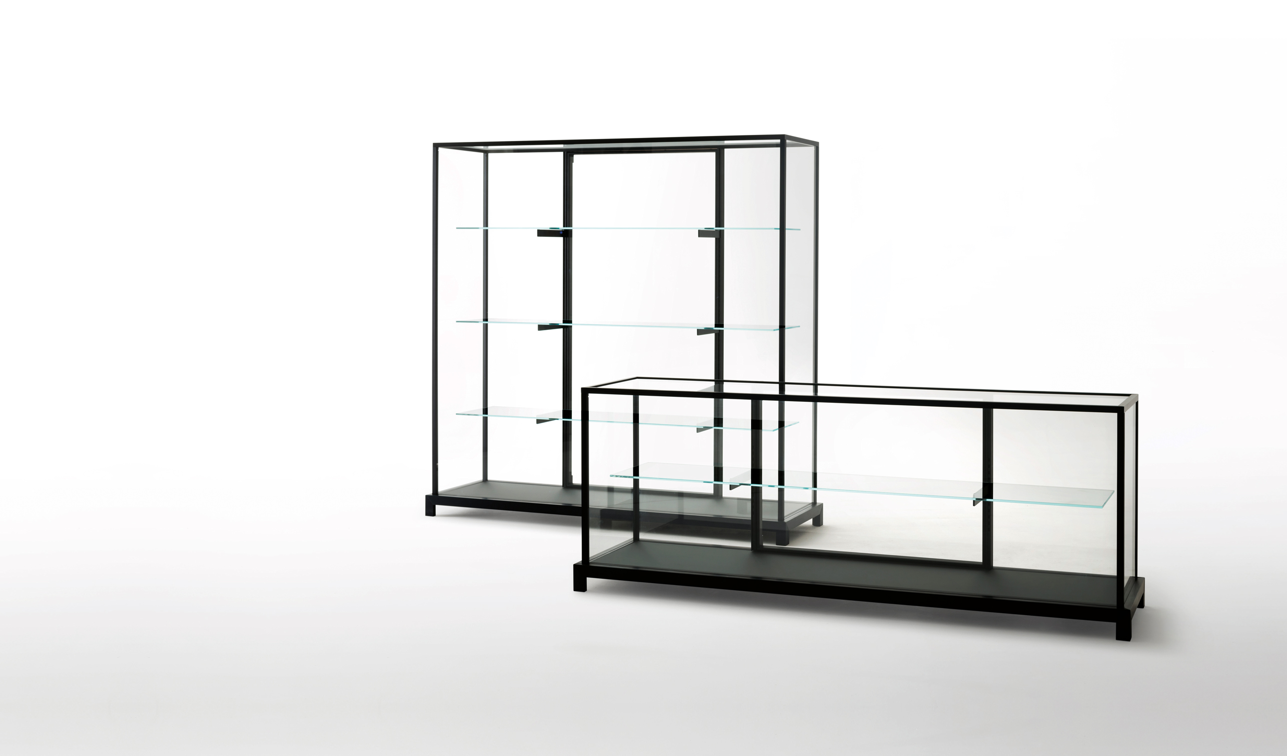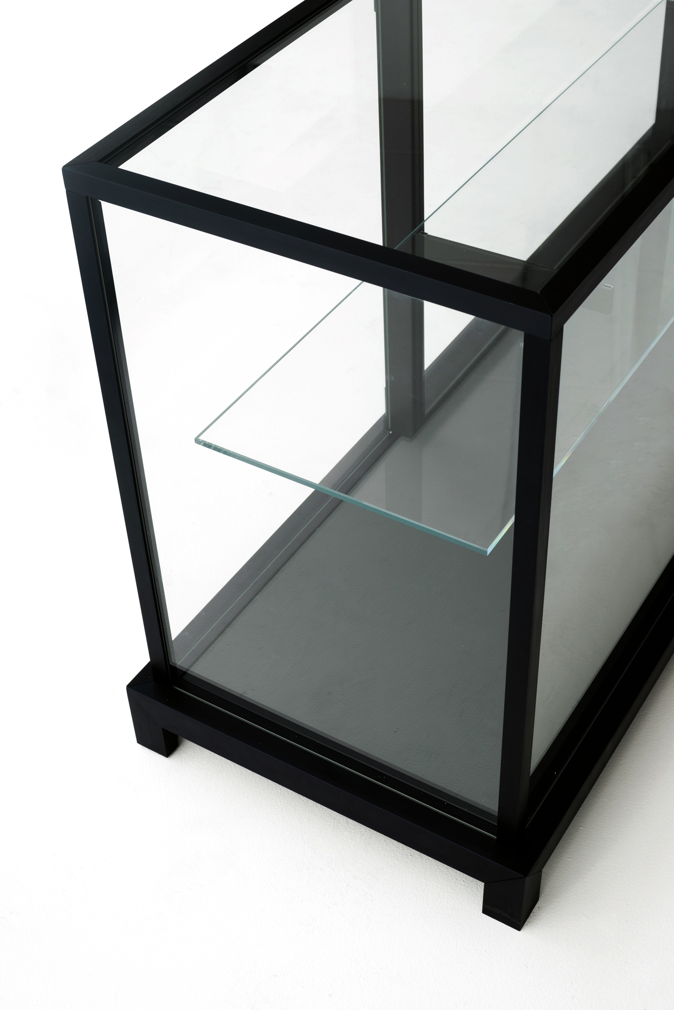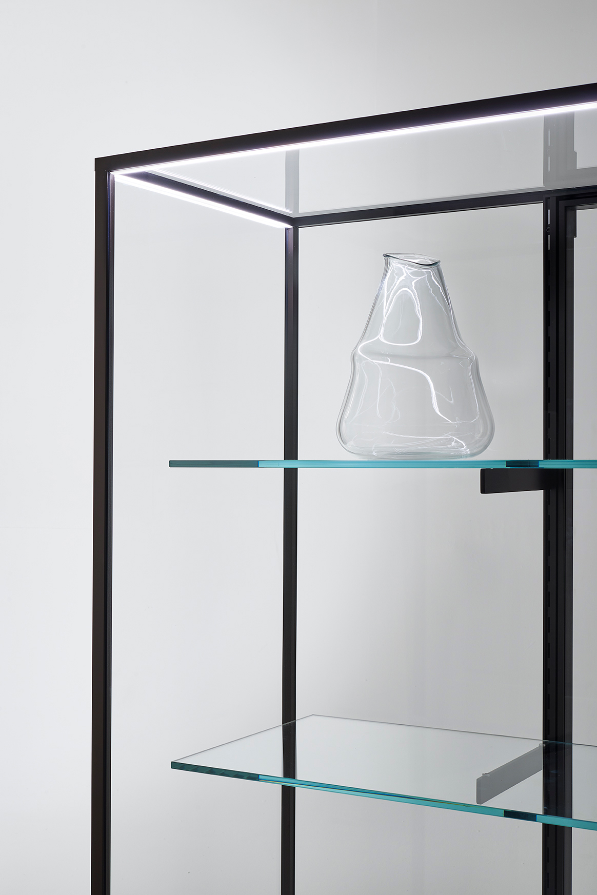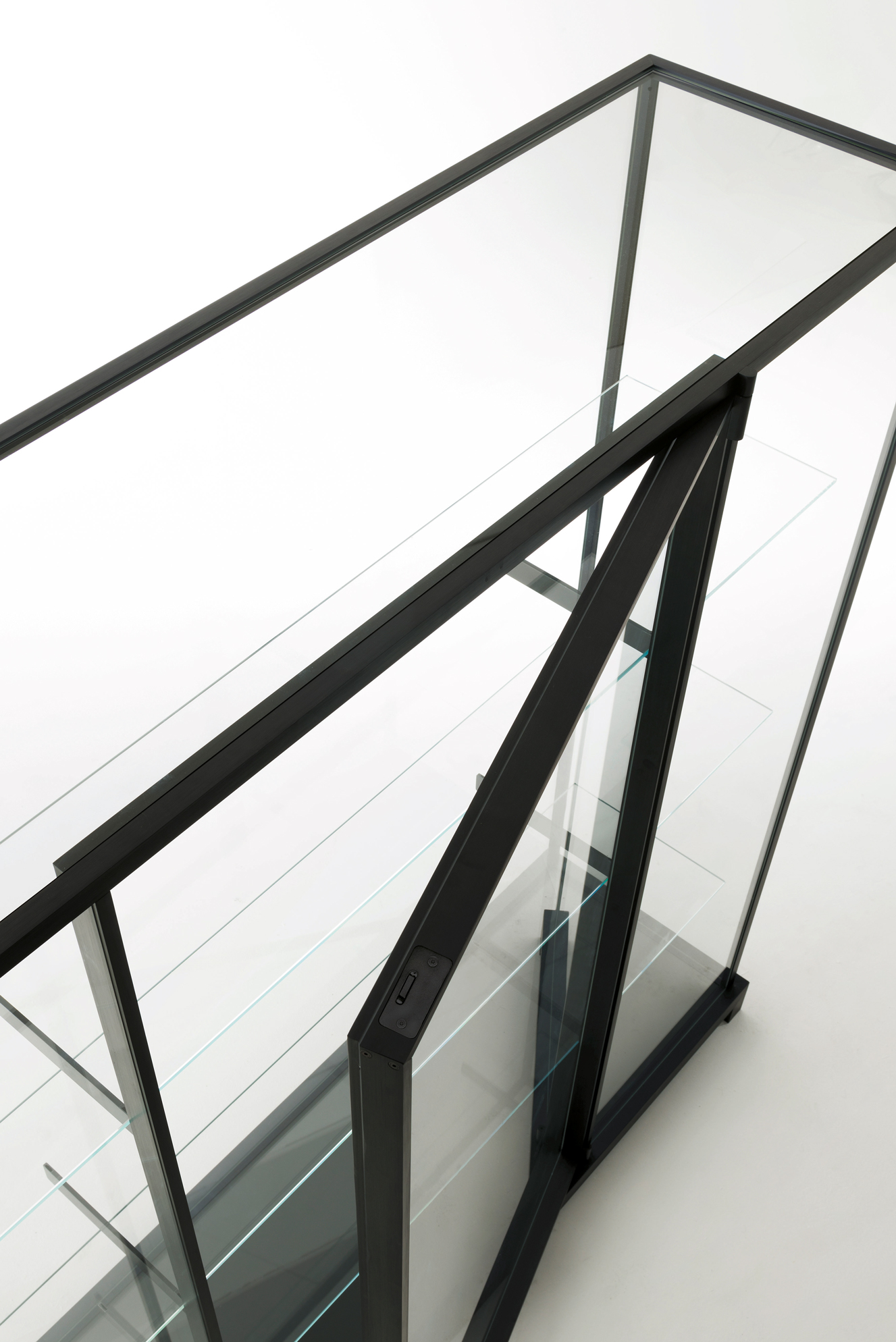 Display cases and storage units in dark brown anodized aluminium with finely detailed finishes and panels made of tempered transparent extra light glass comprise this collection. The base is made of lacquered glass that is opaque. The adjustable shelves are held up by brackets attached to two vertical pillars, which also serve as a striker for the door, which has fully adjustable hinges. These products, which are available on demand and fully disassembled, are ideal for museum and shop display needs. Their slender structure and transparent extra light glass ensure perfect 360-degree visibility of the displayed objects. Custom sizing is available, as is an optional integrated lighting system within the upper frame profiles, which provides high colour performance at 3500° K with a light intensity of 20 W/m.