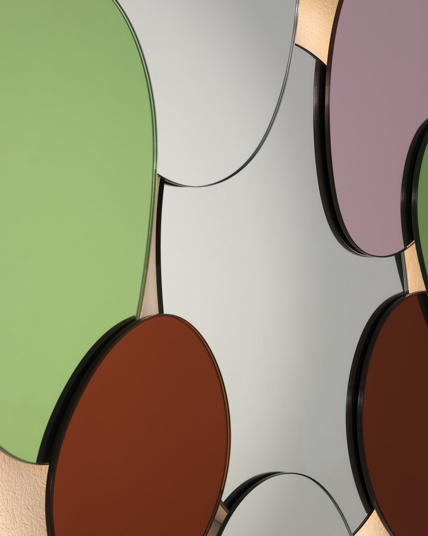 Wall composition of 10 irregular ovoid mirrors in varied shapes, sizes, and colors, partially overlapping and interconnected. Mounted on a multi-hook panel for flexible hanging and orientation. Available with or without a dimmable lighting system that creates a soft, glowing backlit halo.