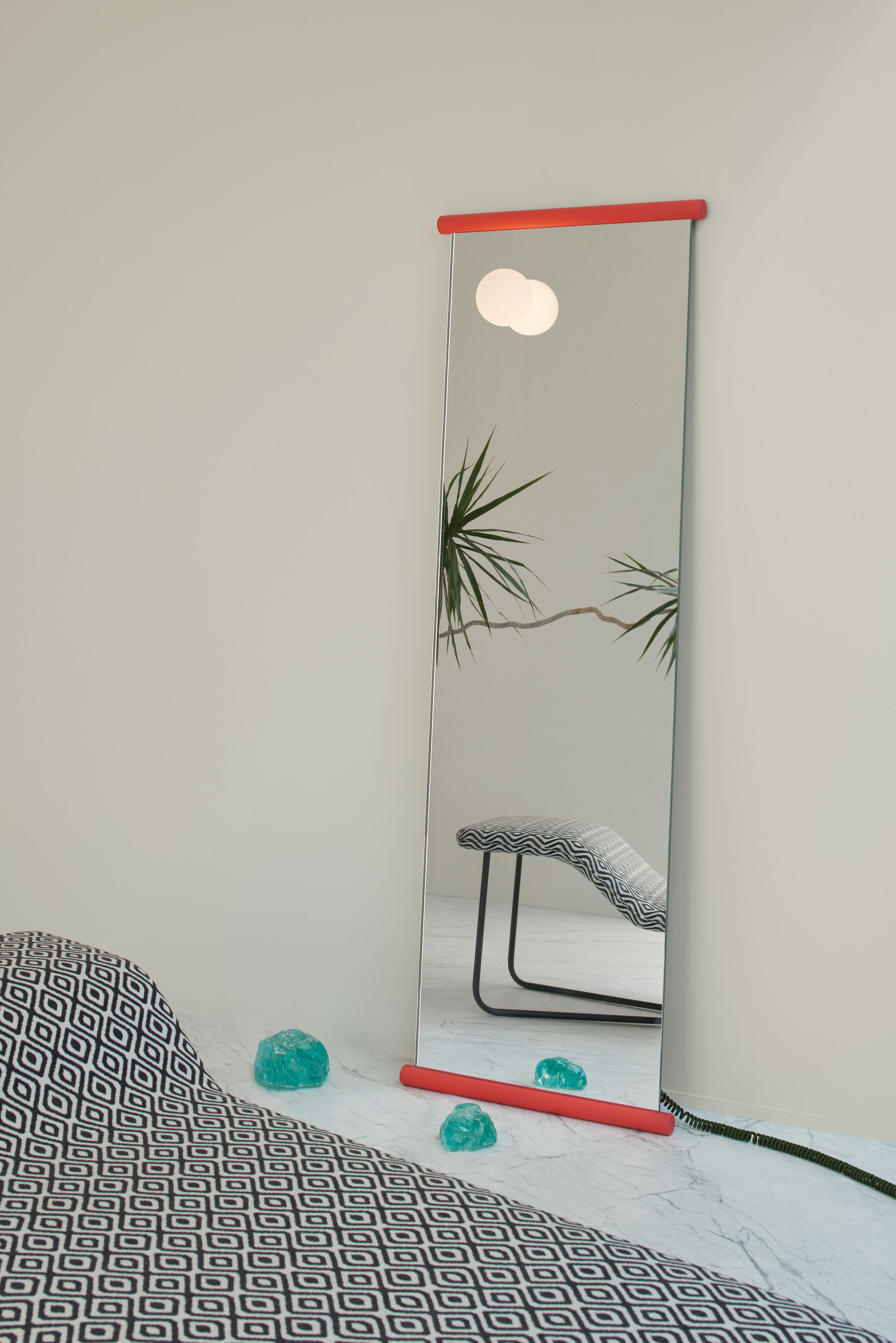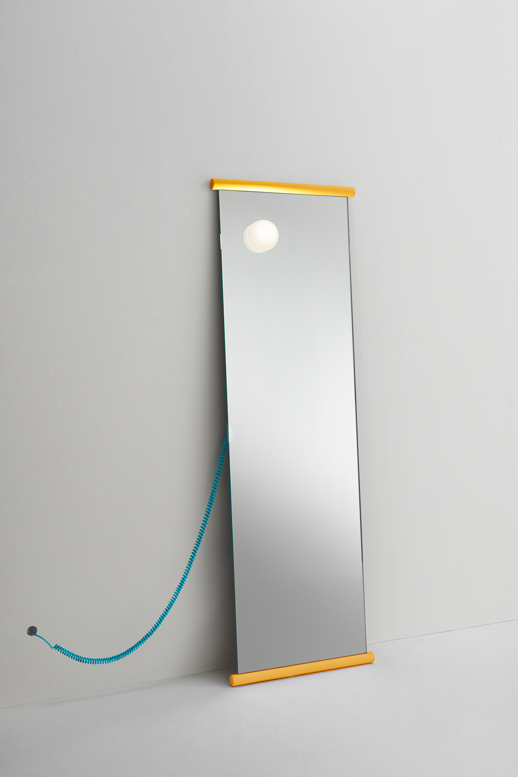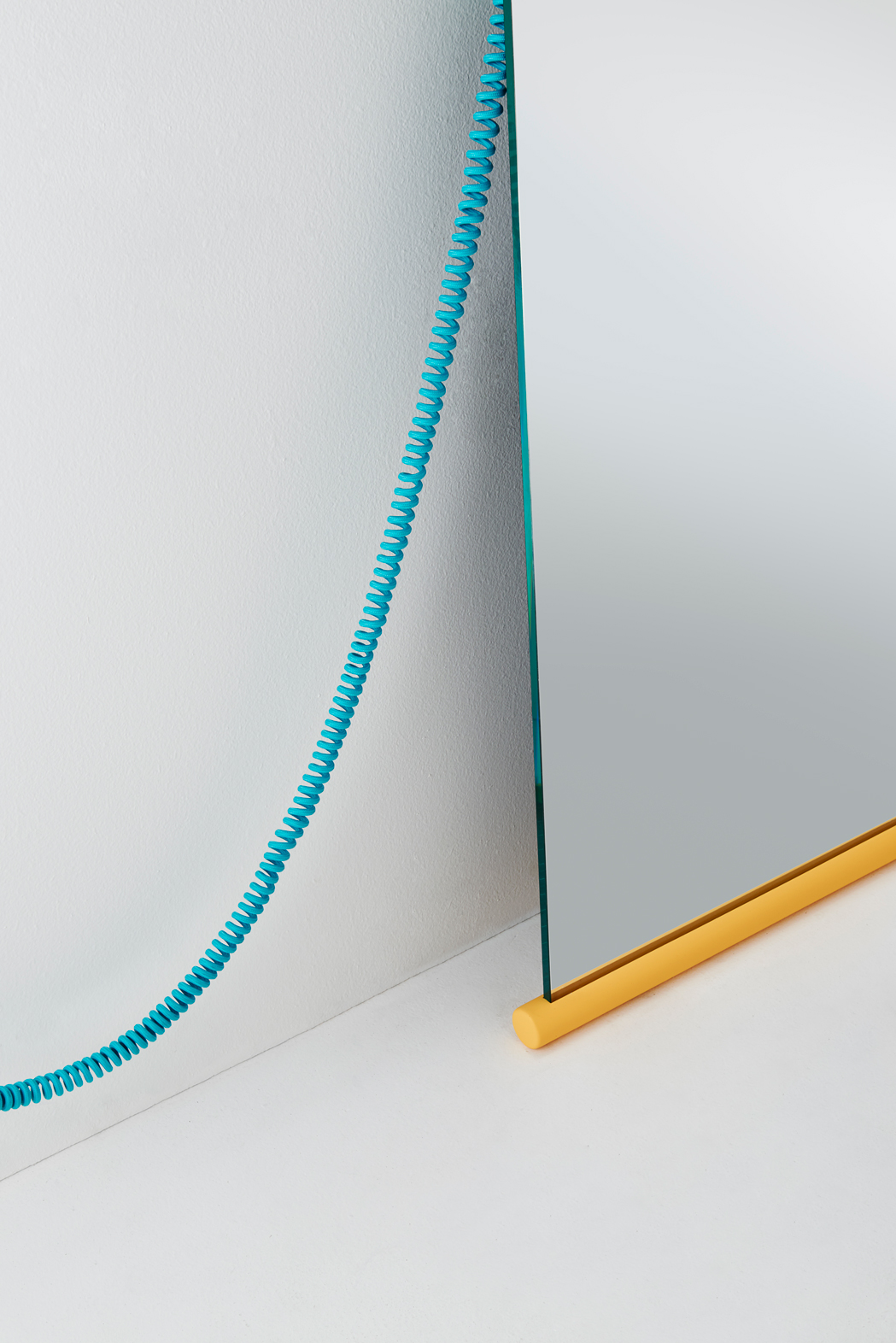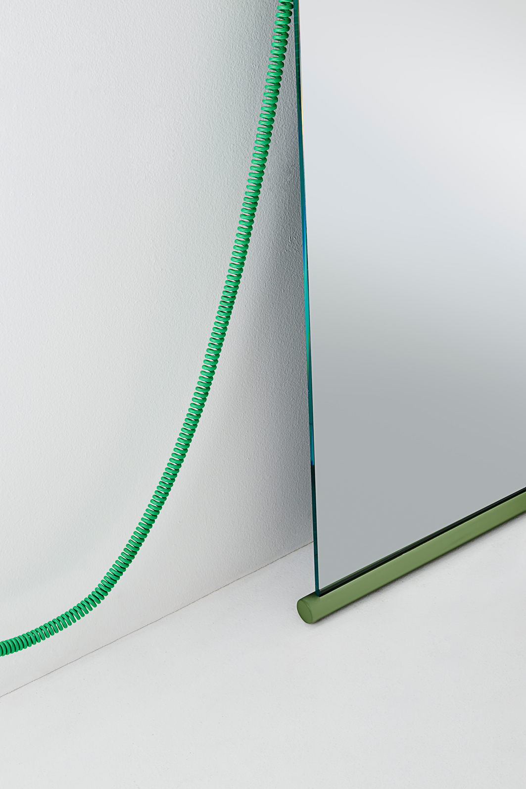 Discover our floor standing mirror, which is made of 12mm extra light glass and has two cylindrical bars painted in rubber-effect finishes (orange, green, or yellow) with finely detailed upper and lower edges. A superior dimmable LED light with outstanding colour performance is featured on this mirror. Made of mouth-blown glass from Murano, the opaline white cylindrical diffuser has a satin finish. Elegantly wrapped in fabric that complements the colour finish of the cylindrical bars, the spiral-shaped cable is available in three different colour finishes: kiwi green for camouflage green bars, turquoise for yellow bars, and camouflage green for orange bars. The mirror's on/off and dimmer switches are easily accessible on the rear.