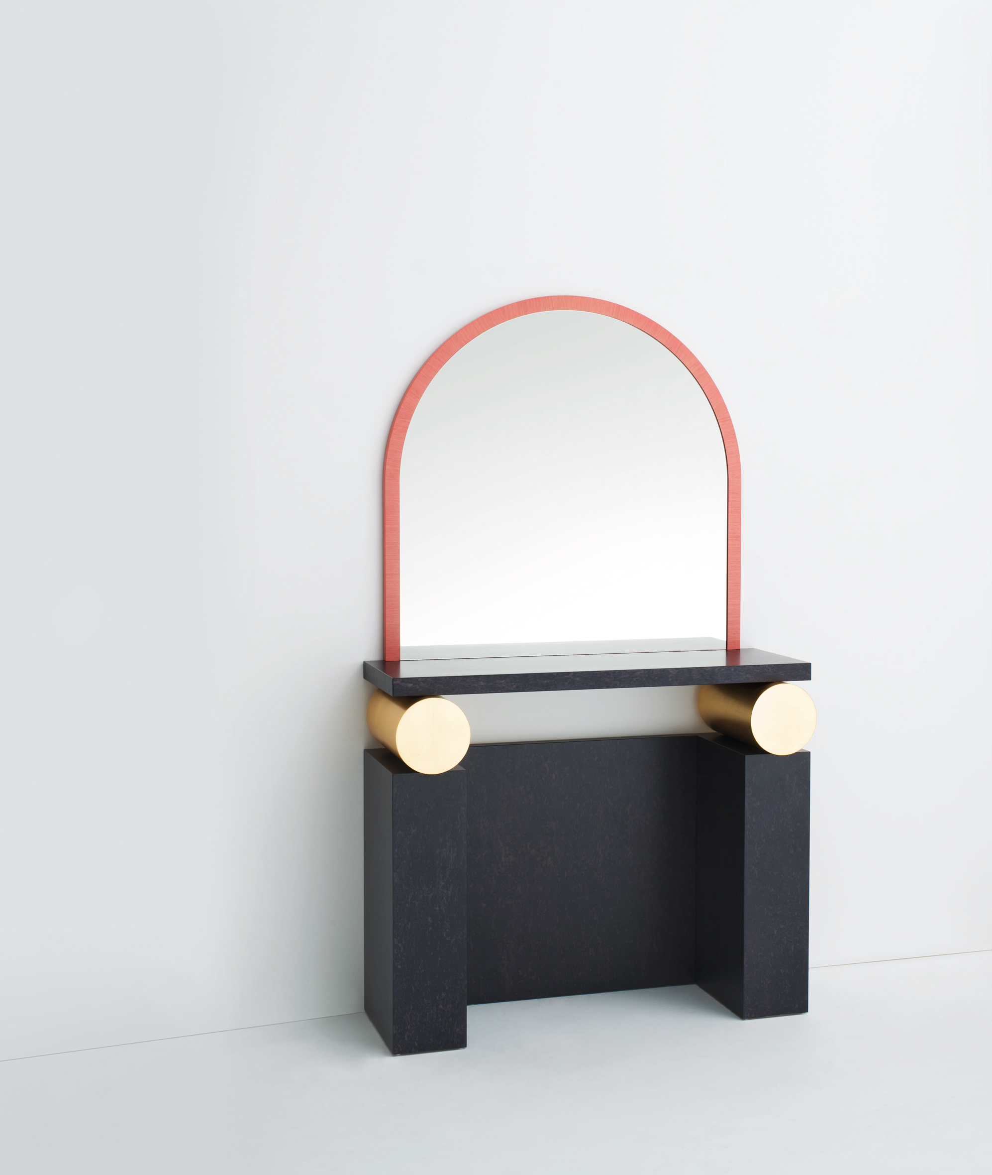 View our mirror unit with an Alpi veneer frame encasing a crystal mirror. The base and shelf display wood with an aniline finish that is enhanced by gold-plated cylindrical components. Because each piece is individually identified by a progressive numbering system, your space will feel a little more exclusive.