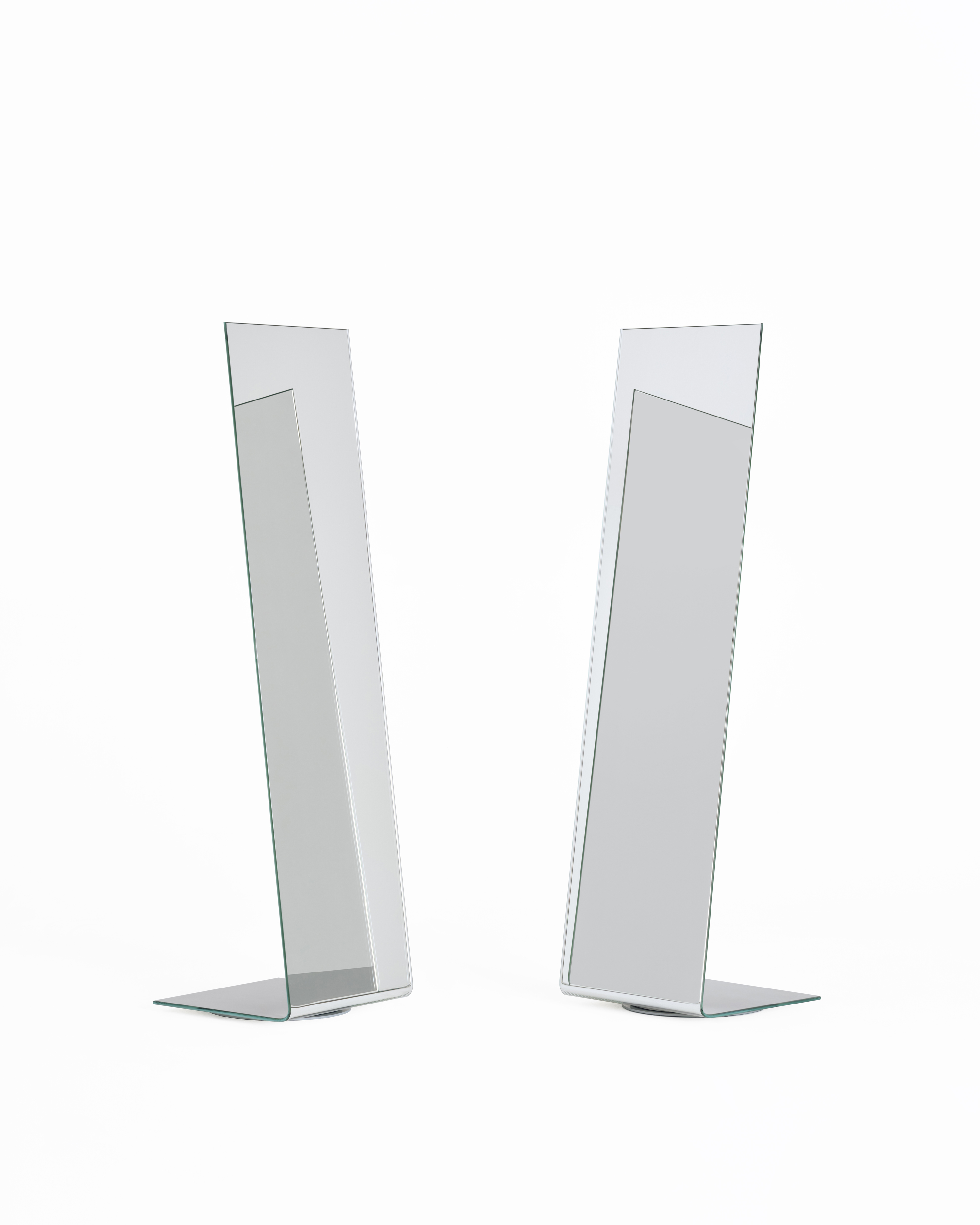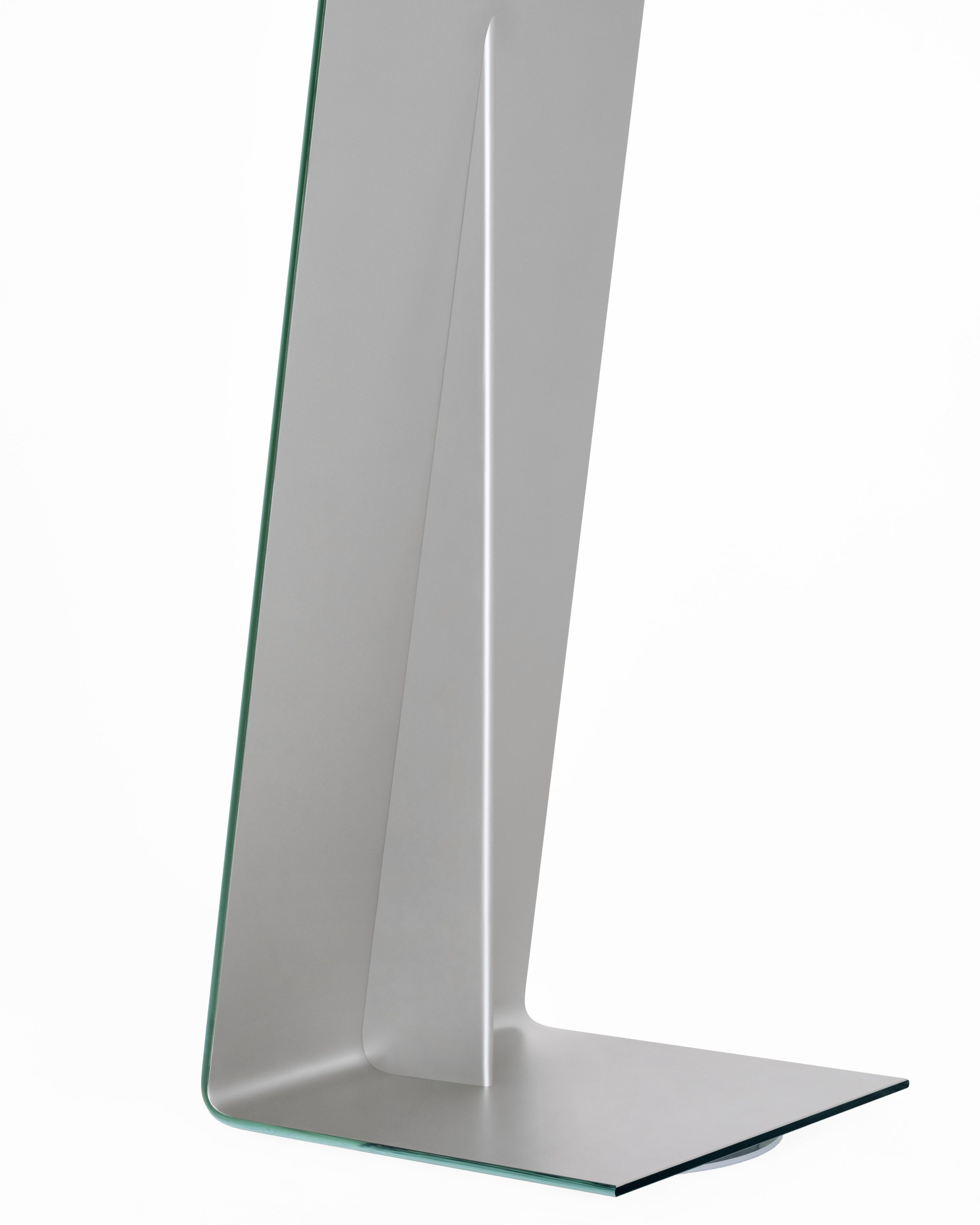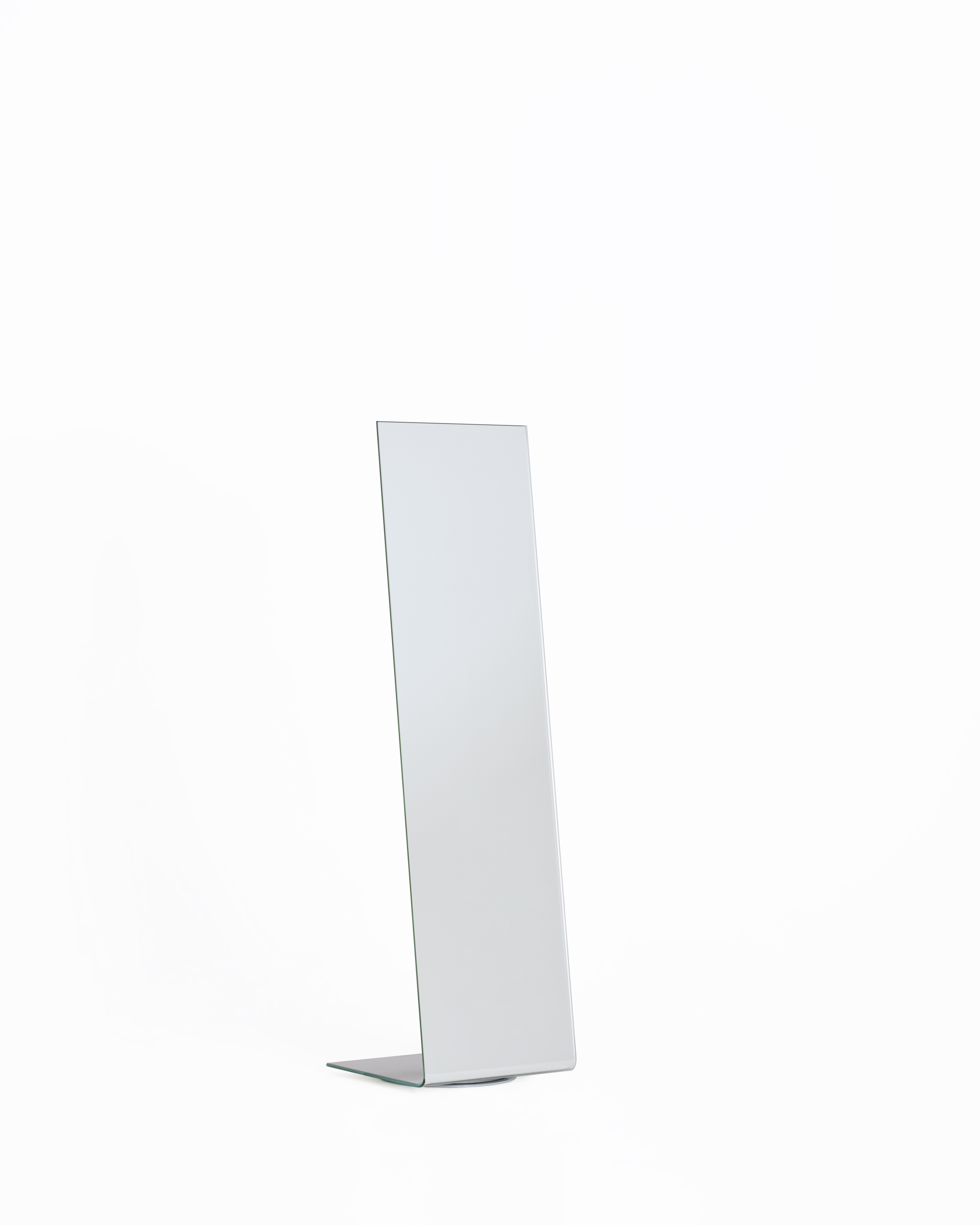Freestanding floor mirror crafted from 12 mm extra-clear curved glass with manual silvering. Features unique bullnose-polished vertical edges and a discreet silver-grey lacquered reinforcement on the back for added stiffness. Available in three widths with a removable counterweight for stability. The narrowest model (code IMI01) includes a swivel base.