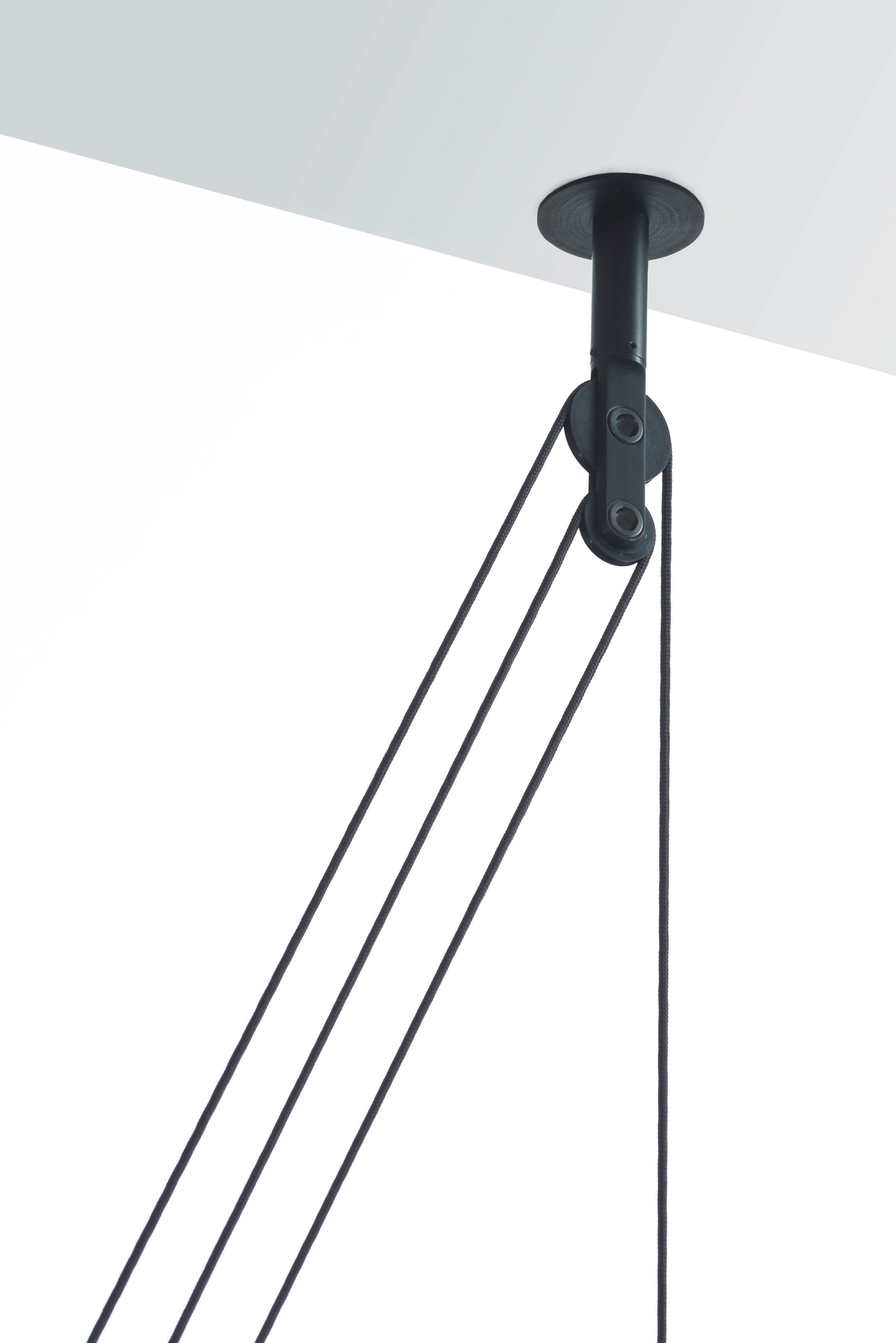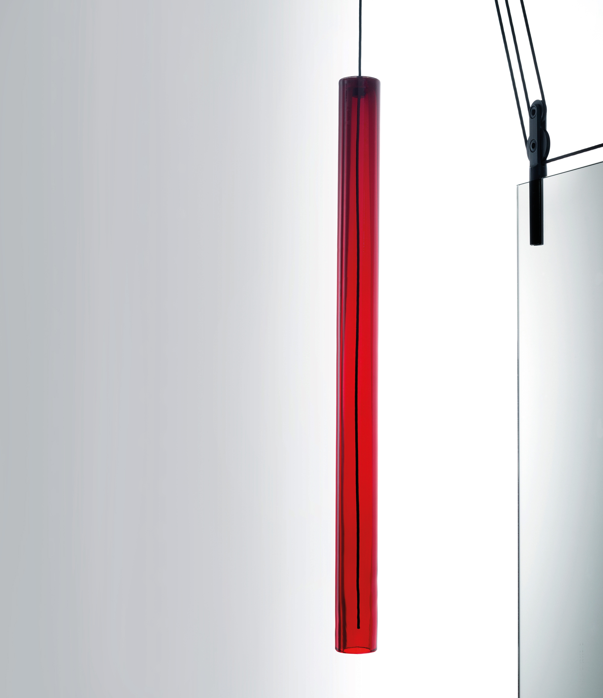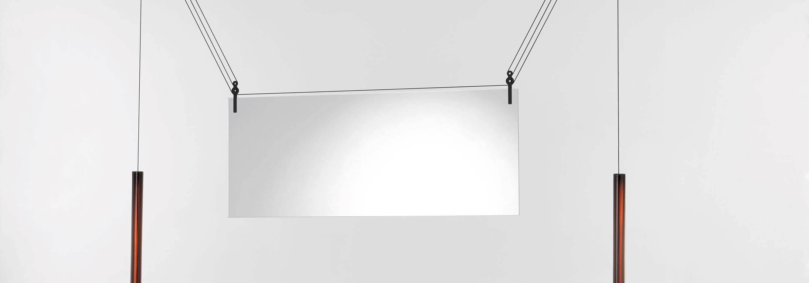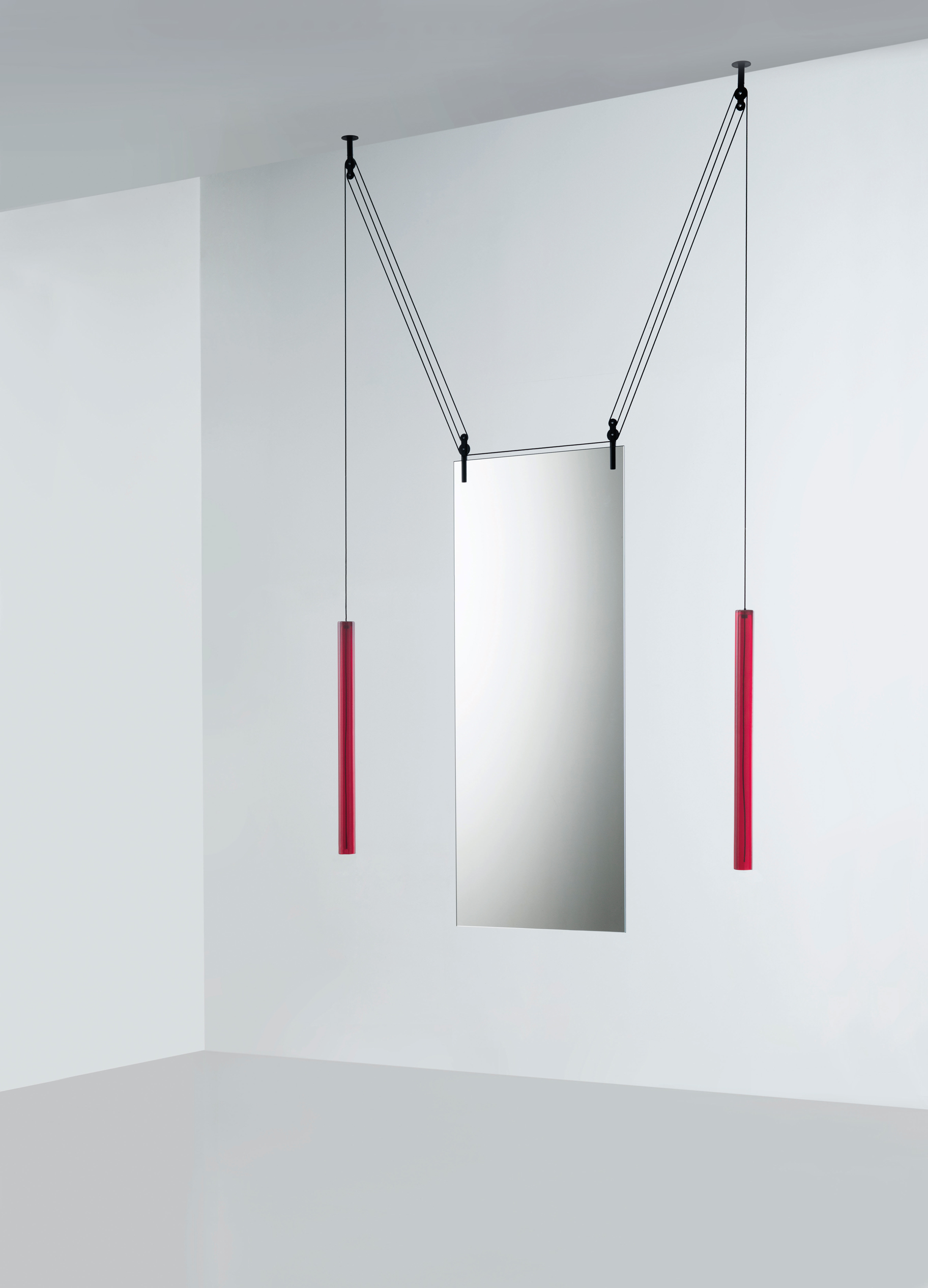 This ceiling-mounted double-faced mirror is available in three different sizes and is easily adjustable vertically using a counterweight, cable, and pulley system. Using red or neutral blown glass cylinders as counterweights to balance the movement of the mirror, as well as black aluminium cables and pulleys. Its dual-sided design makes it ideal for use as a dividing and screening element within a space or near a wall.