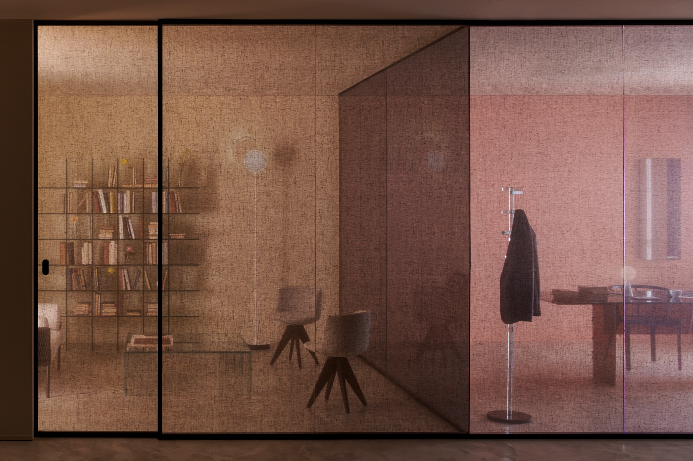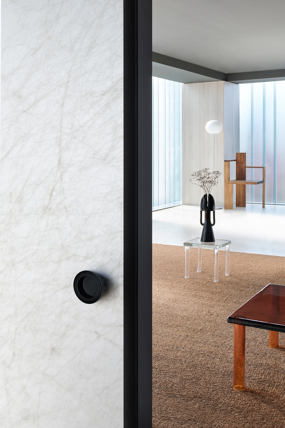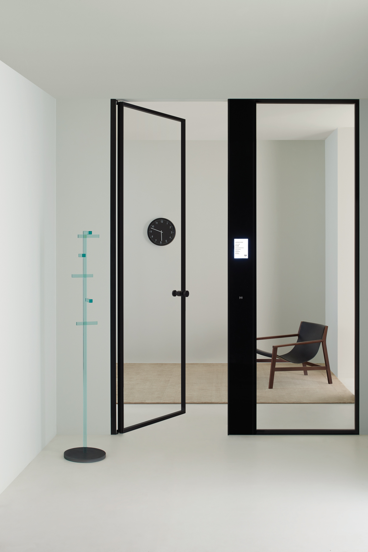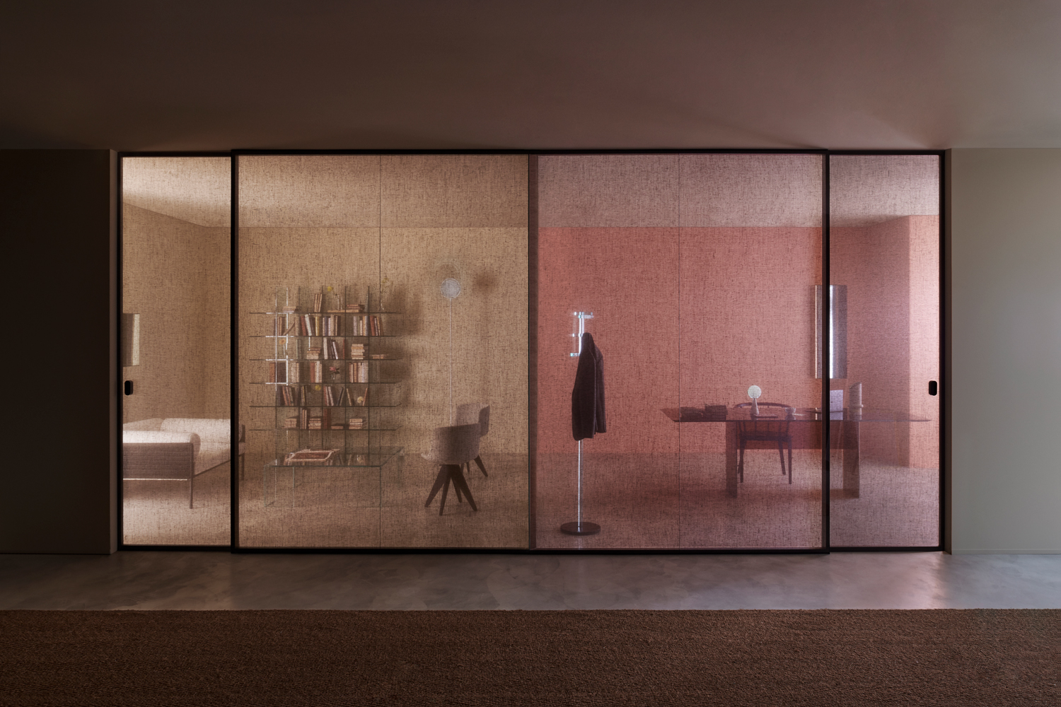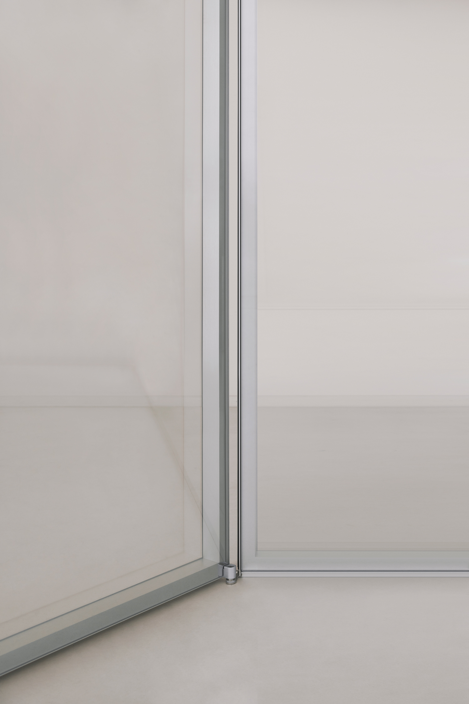 ALADIN WALL is a floor-to-ceiling partition with an aluminum frame fixed to floor, ceiling, and/or walls, available in five finishes and featuring an adjustment system for leveling and onsite irregularities. It integrates with Glas Italia swing and sliding doors in matching or contrasting finishes (note: not all glass types are compatible with every door model).