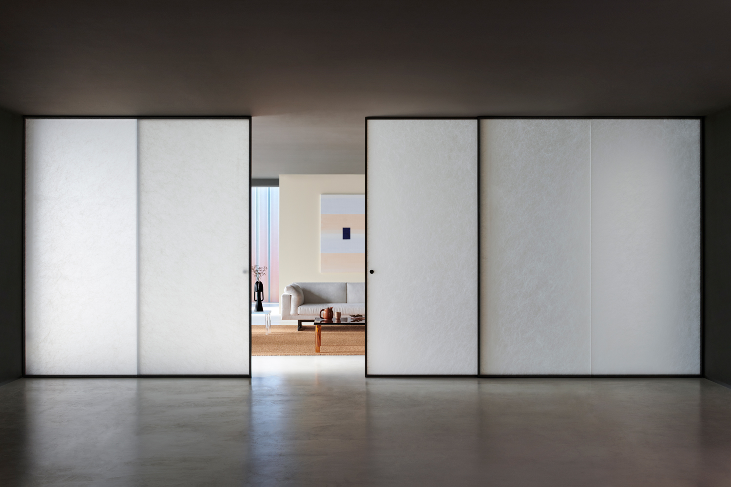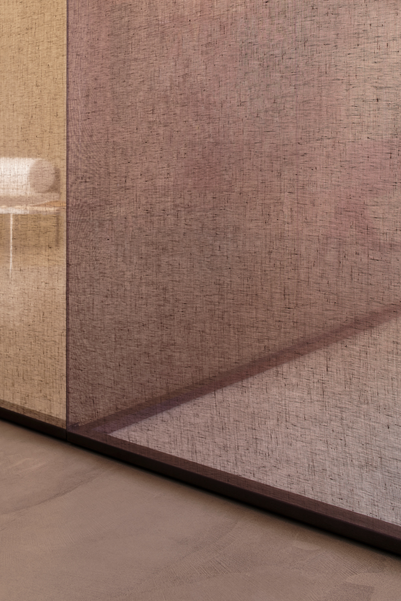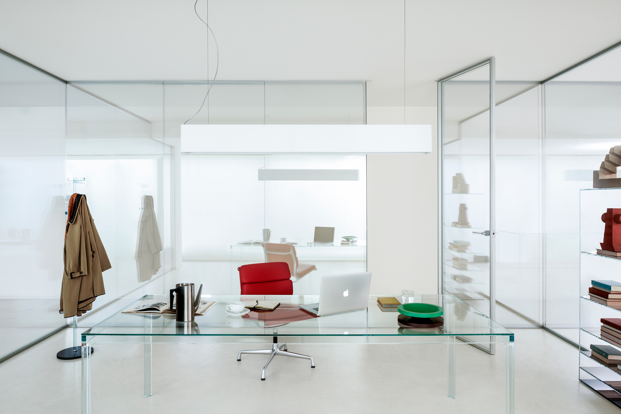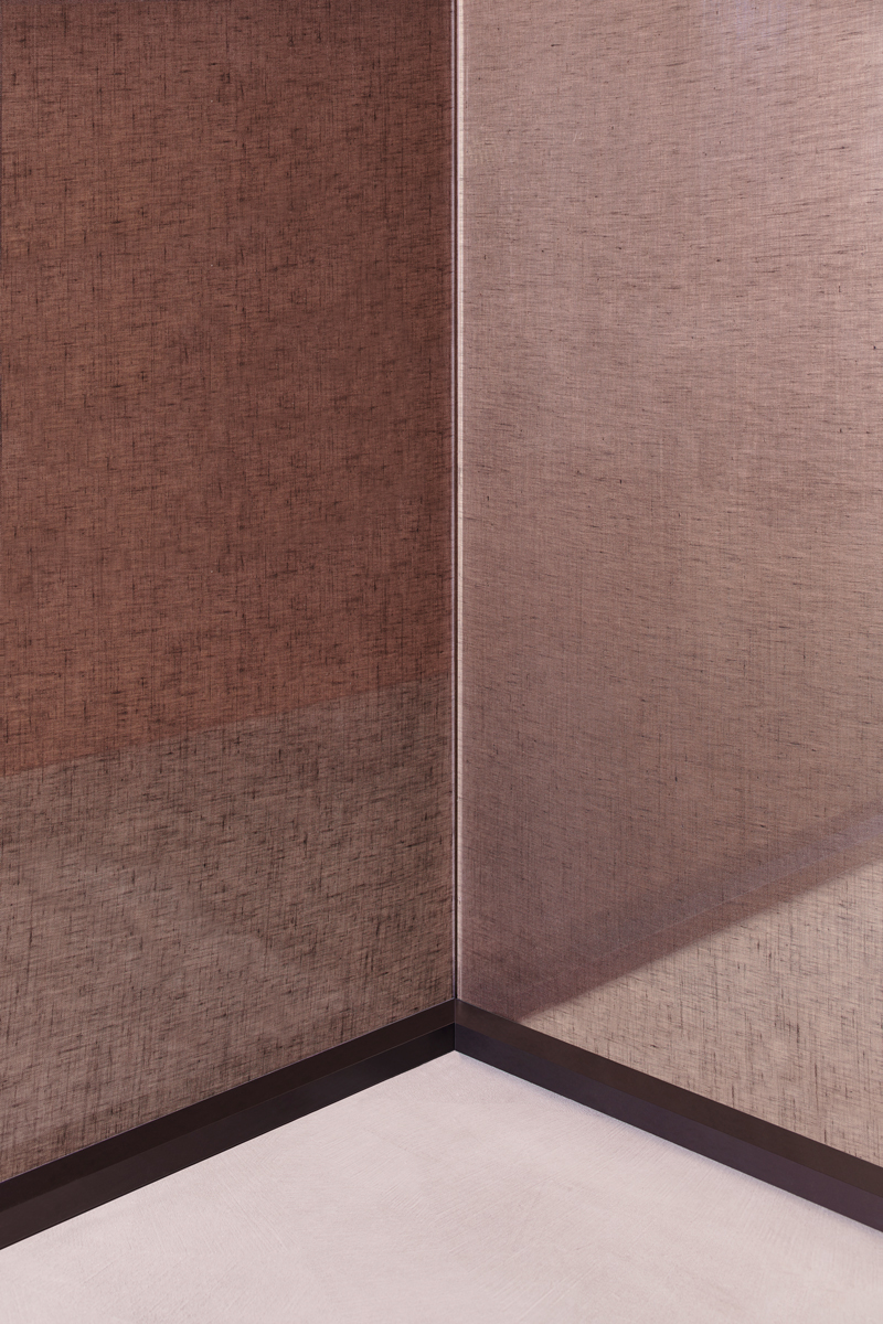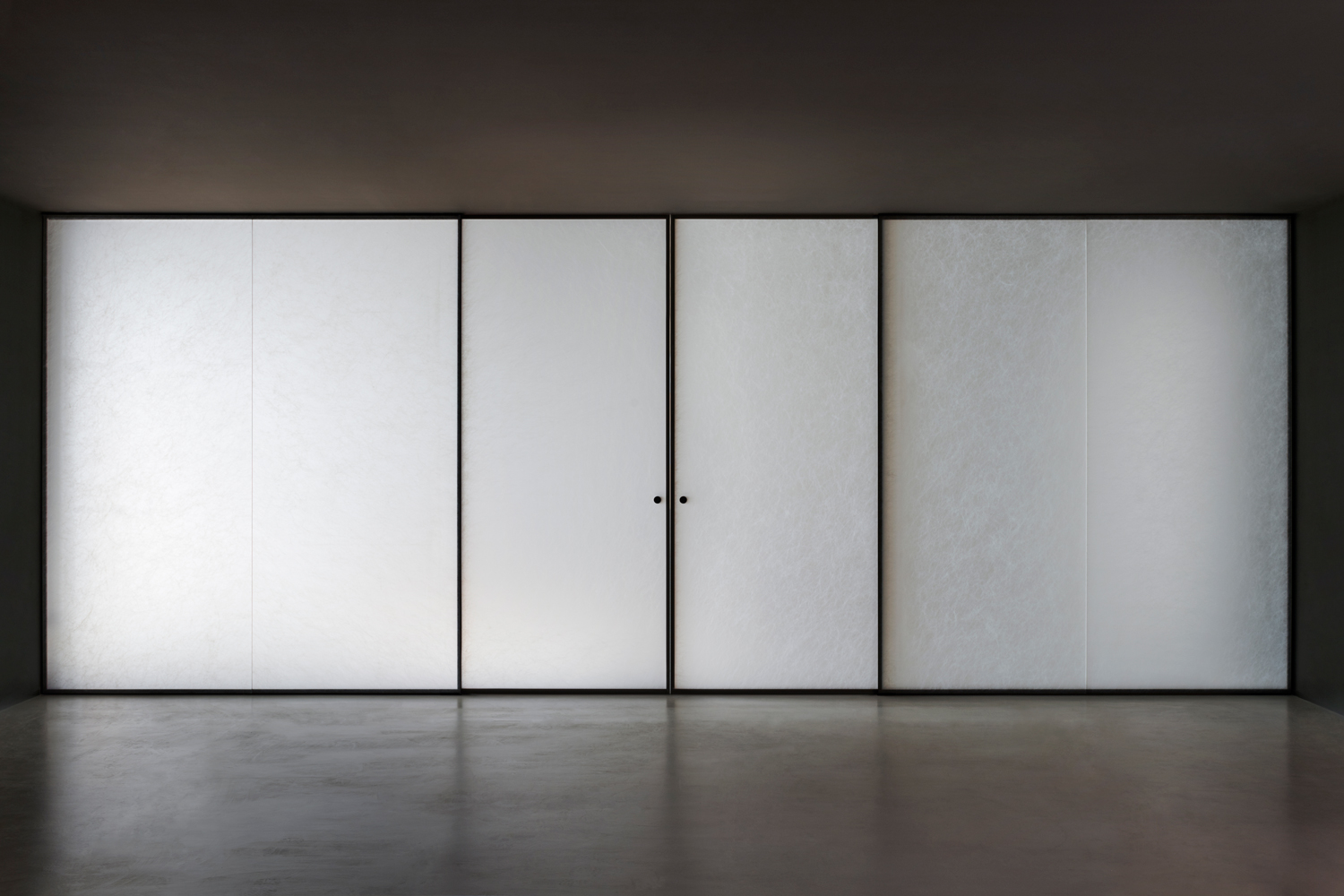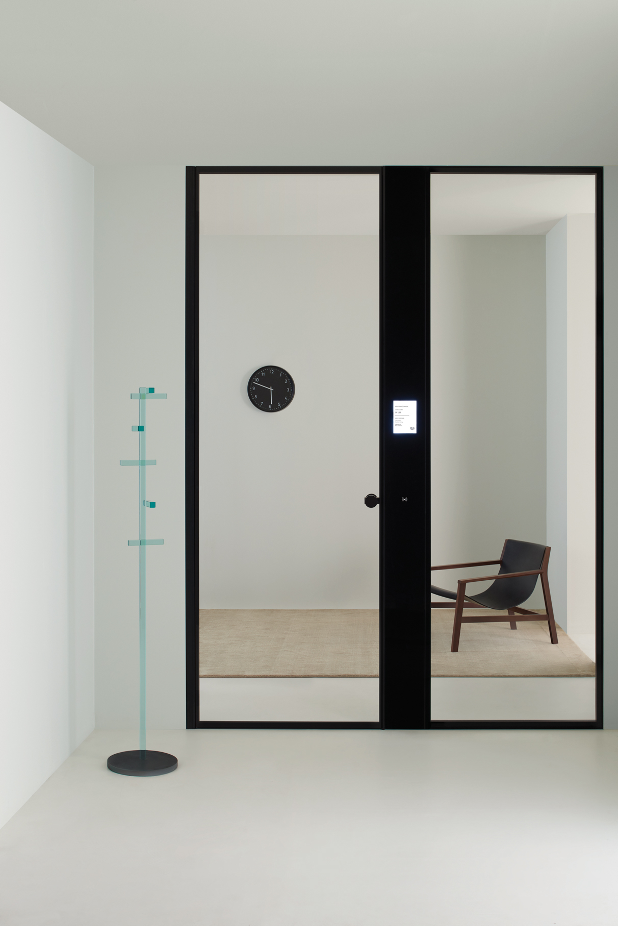 ALADIN WALL is a floor-to-ceiling partition with an aluminum frame fixed to floor, ceiling, and/or walls, available in five finishes and featuring an adjustment system for leveling and onsite irregularities. It integrates with Glas Italia swing and sliding doors in matching or contrasting finishes (note: not all glass types are compatible with every door model).
