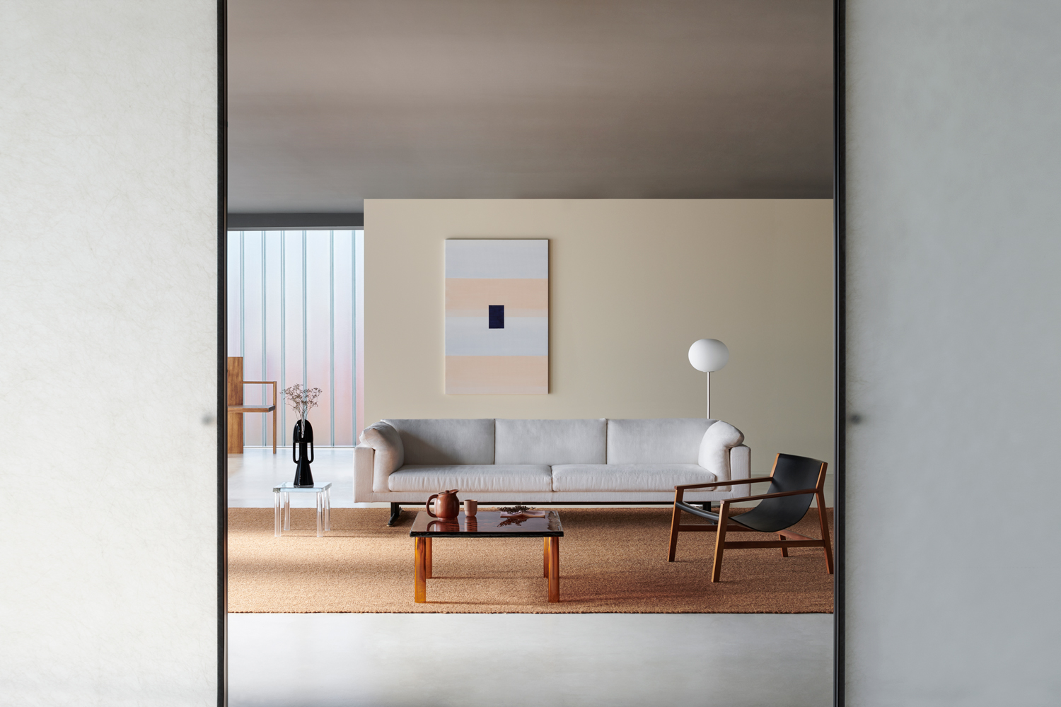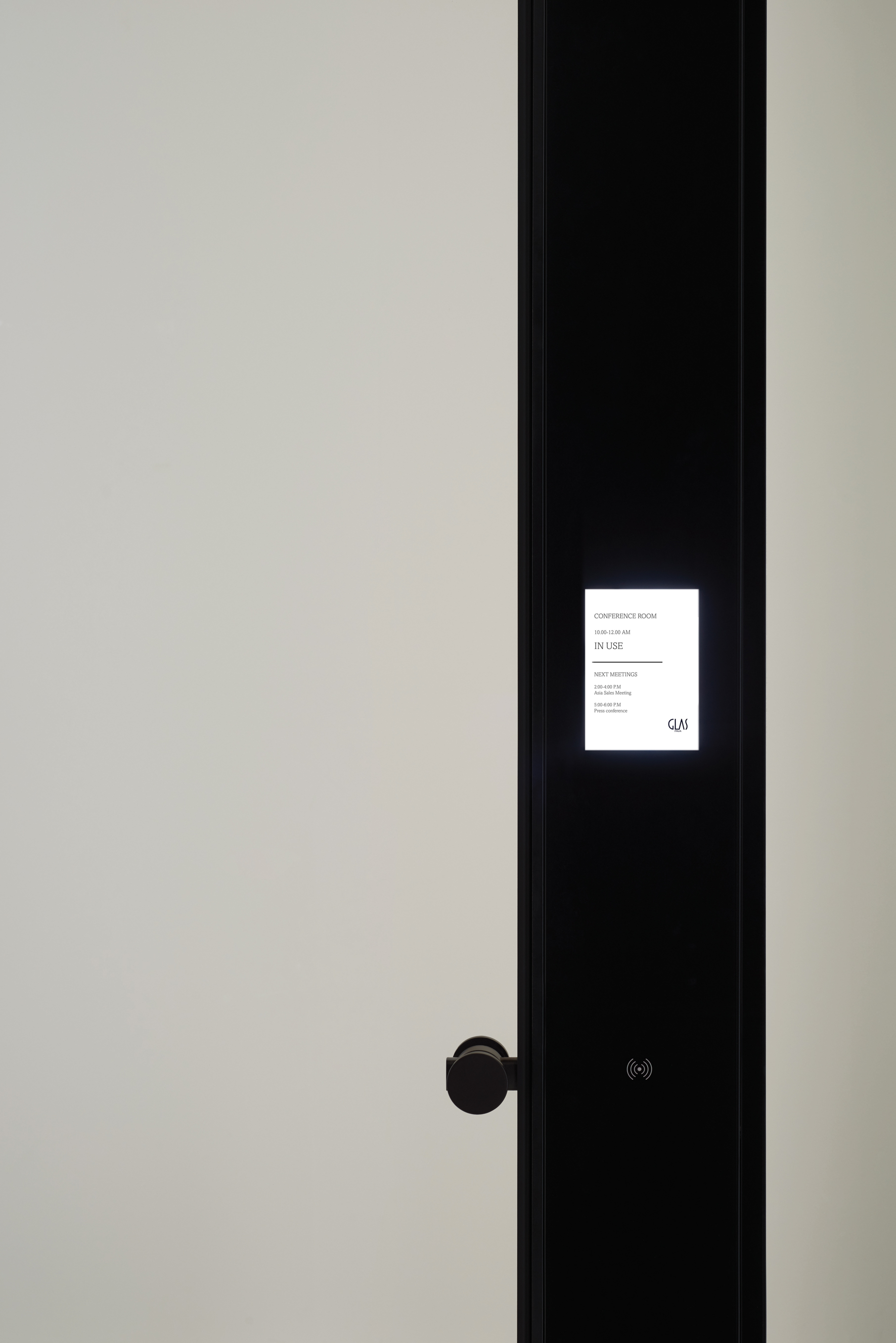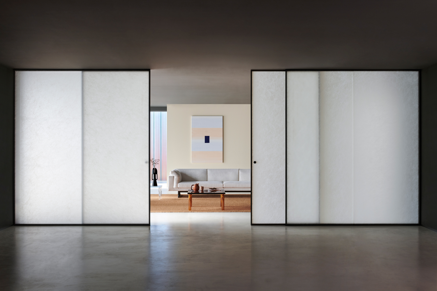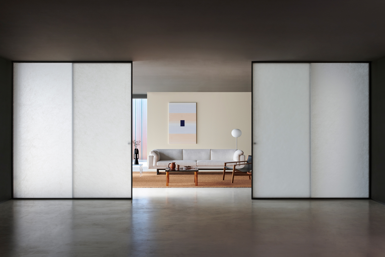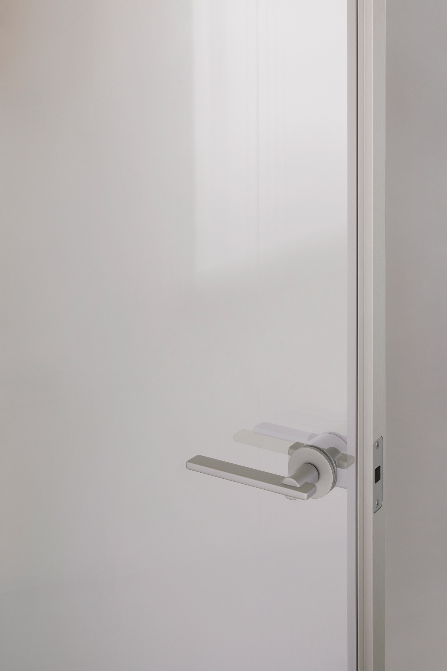 ALADIN WALL is a floor-to-ceiling partition with an aluminum frame fixed to floor, ceiling, and/or walls, available in five finishes and featuring an adjustment system for leveling and onsite irregularities. It integrates with Glas Italia swing and sliding doors in matching or contrasting finishes (note: not all glass types are compatible with every door model).