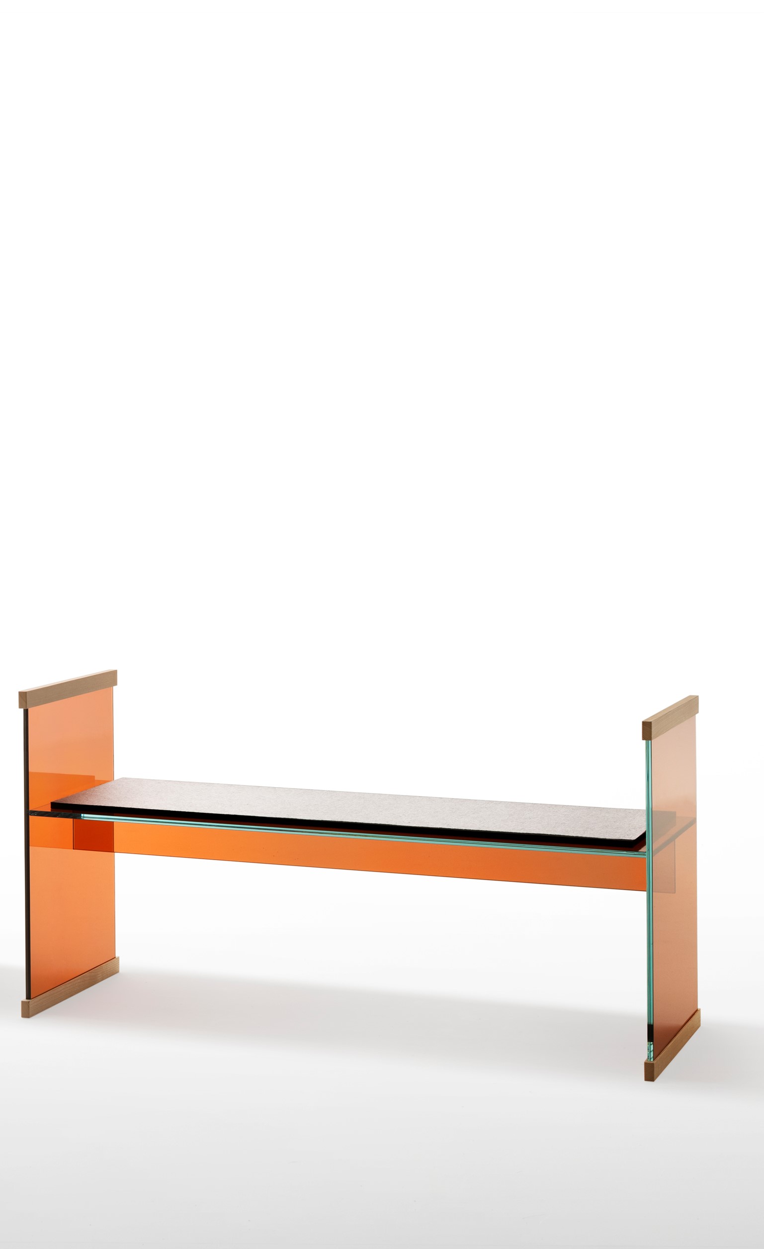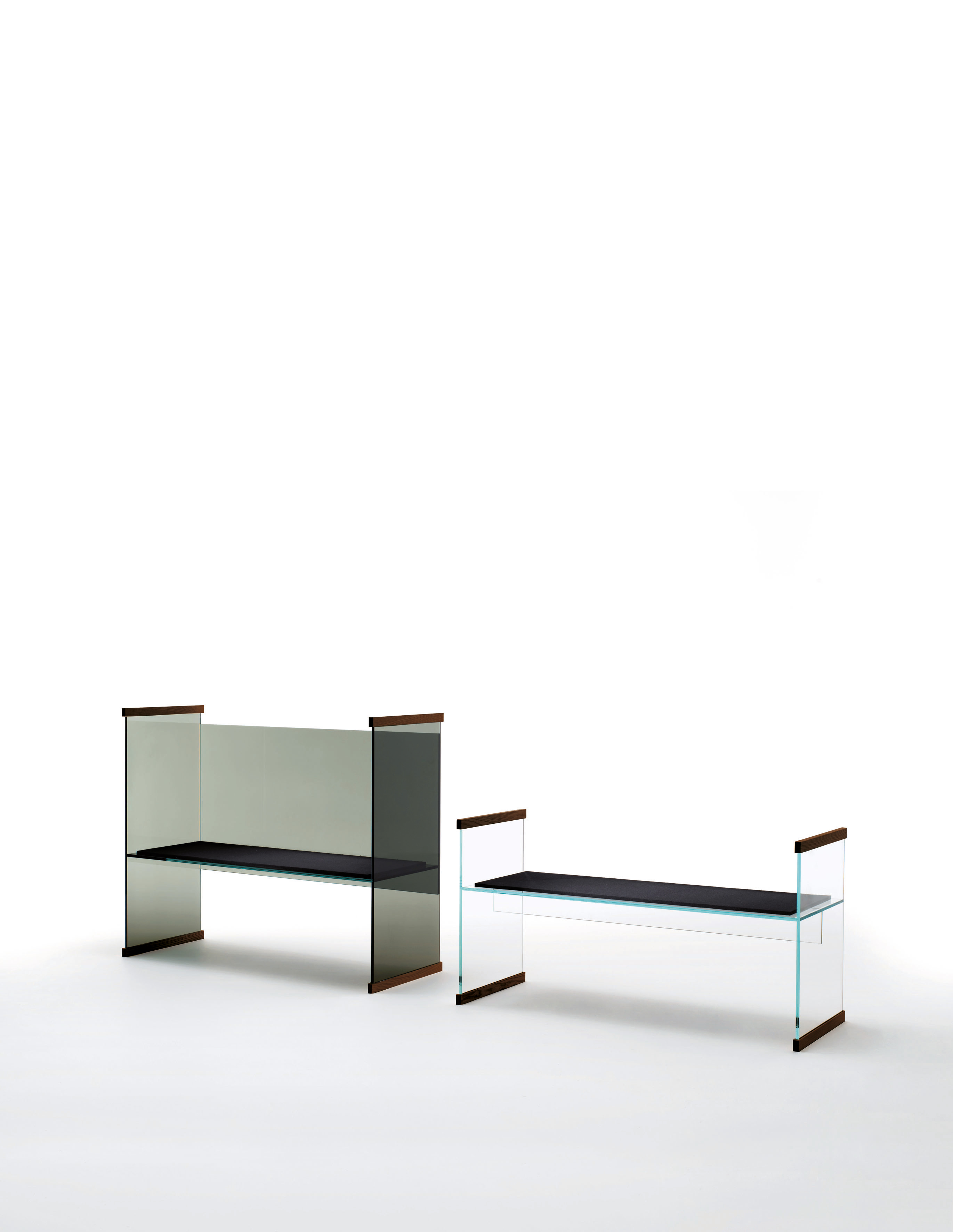 The collection includes a variety of furniture pieces made of thermo-welded, laminated, and transparent extra light glass, such as desks, benches, and small bookcases. Solid natural ash or dark brown oak elements are featured along the outer edges of the supporting sides of these pieces. A monochromatic variant is offered in transparent glass finishes like sienna red, lilac, clear grey, dark grey, and extra light. Furthermore, there are two combinations available for the transparent glass two-colour version: a) lilac back, extra light sides, top/seat, and sienna red back.The bench is only offered in the monochromatic version, and the seats have 12mm thick felt cushions in either mélange grey or black. Natural ash wood panels or dark brown oak are used to adorn the desks. For added functionality, the bookcase and desks come with cable outlets.