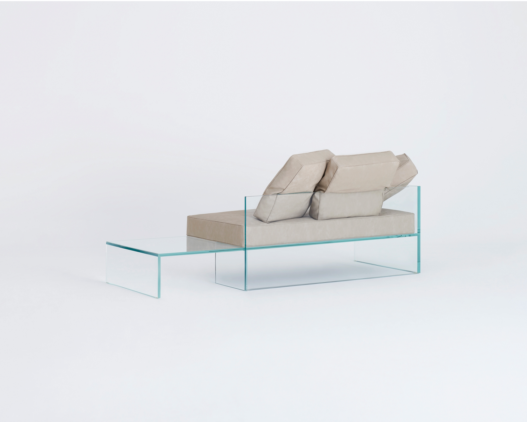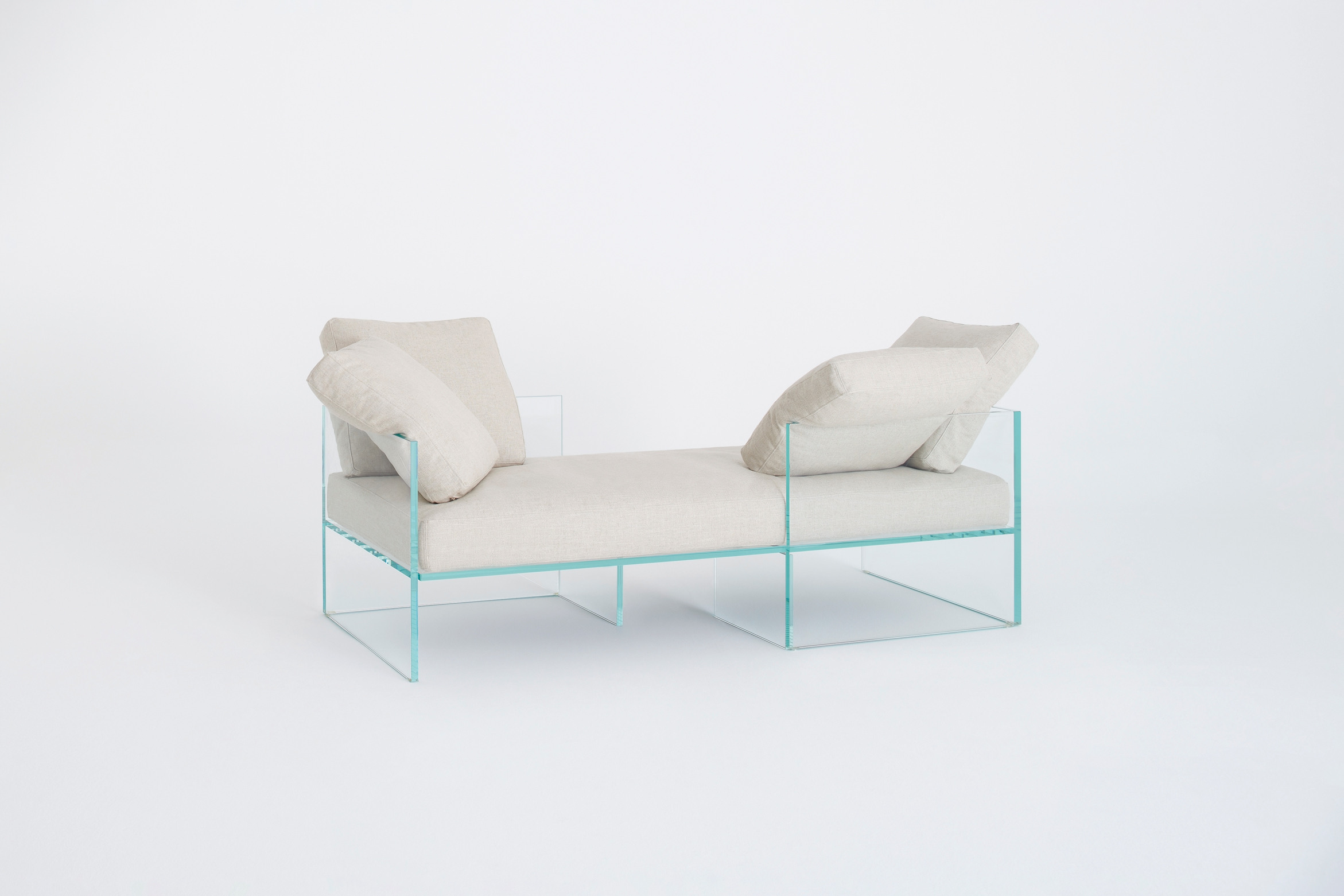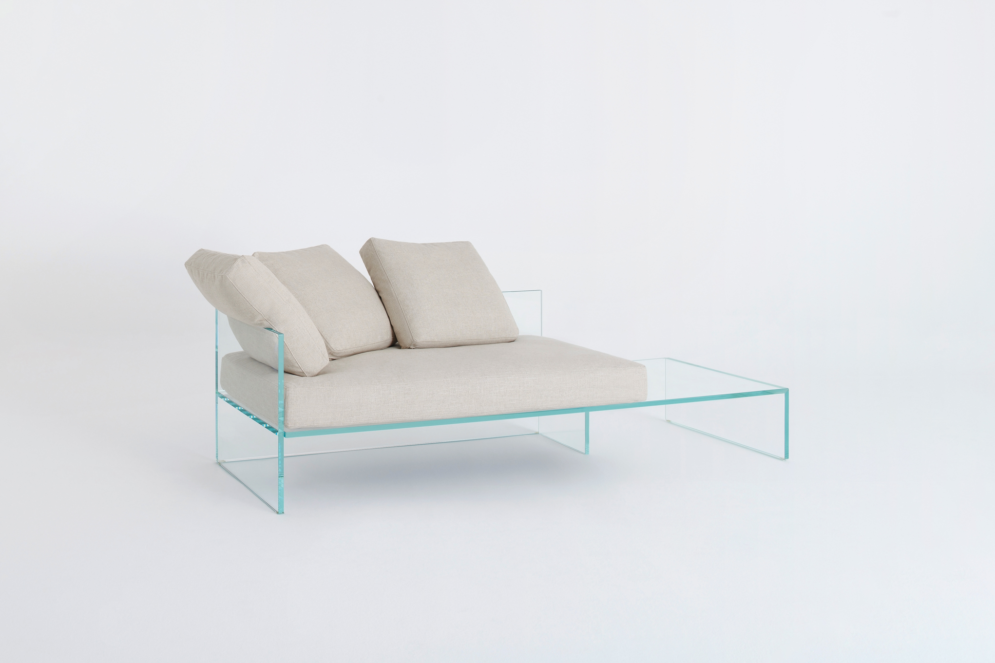 What a chic assortment! Light-coloured, sleek sofas with a structure composed of UV-bonded, tempered, and 19 mm thick transparent extra light glass. They look great with soft, detachable cushions made of eco-leather or a variety of other fabrics and colours. The padding is made from eco-friendly, hypoallergenic, cruelty-free material made from recycled plastics that are gathered from the oceans, and it has a texture similar to that of goose down. There are two versions of the collection available: one with twin facing seats and the other with an integrated side table (on the left or right).