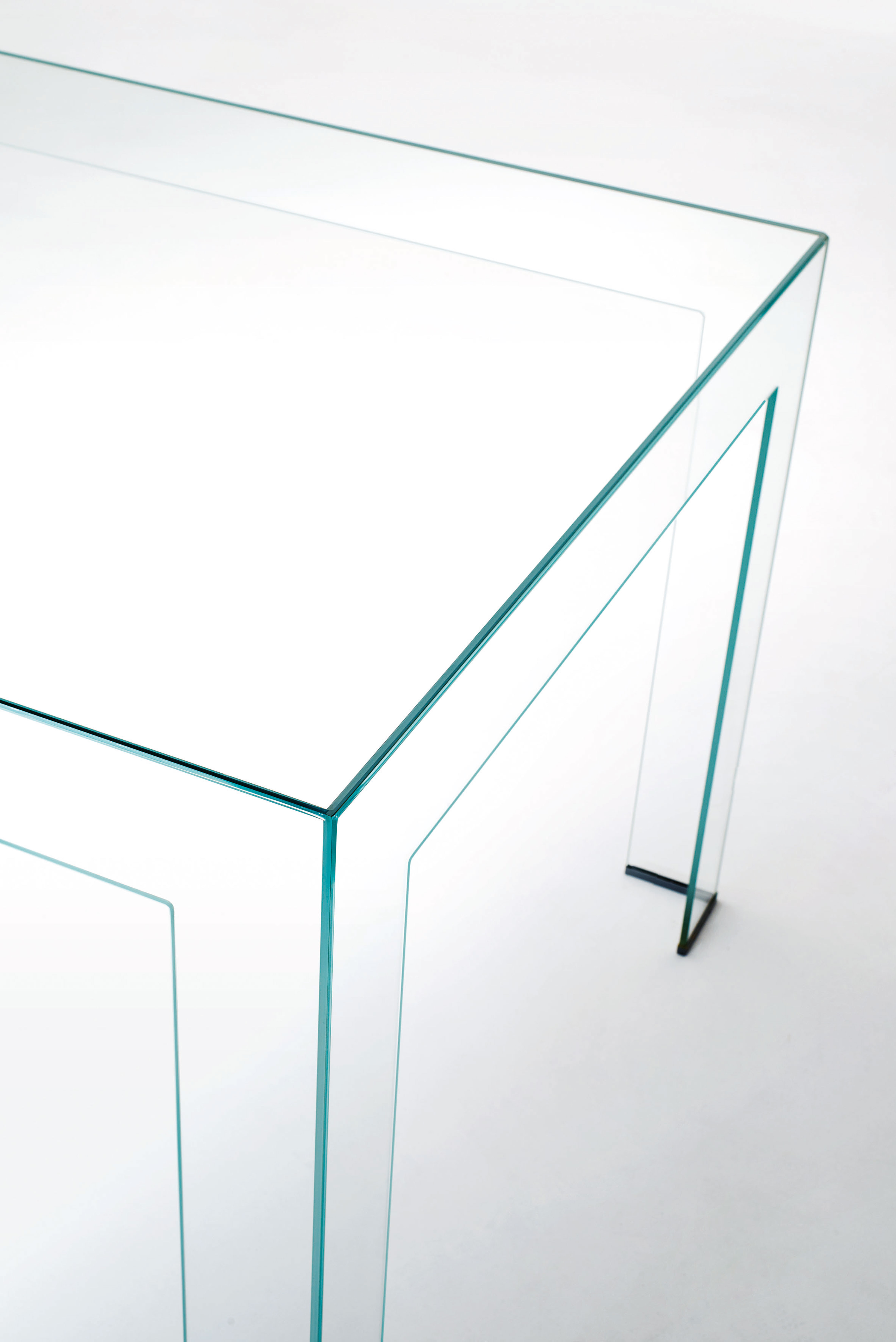 These tall tables are made from water jet-cut, 8 mm thick tempered glass plates with a 45° chamfered edge. They are available in glossy lacquered versions or extra light transparent glass, and they combine exquisite craftsmanship, subtle elegance, and formal purity.