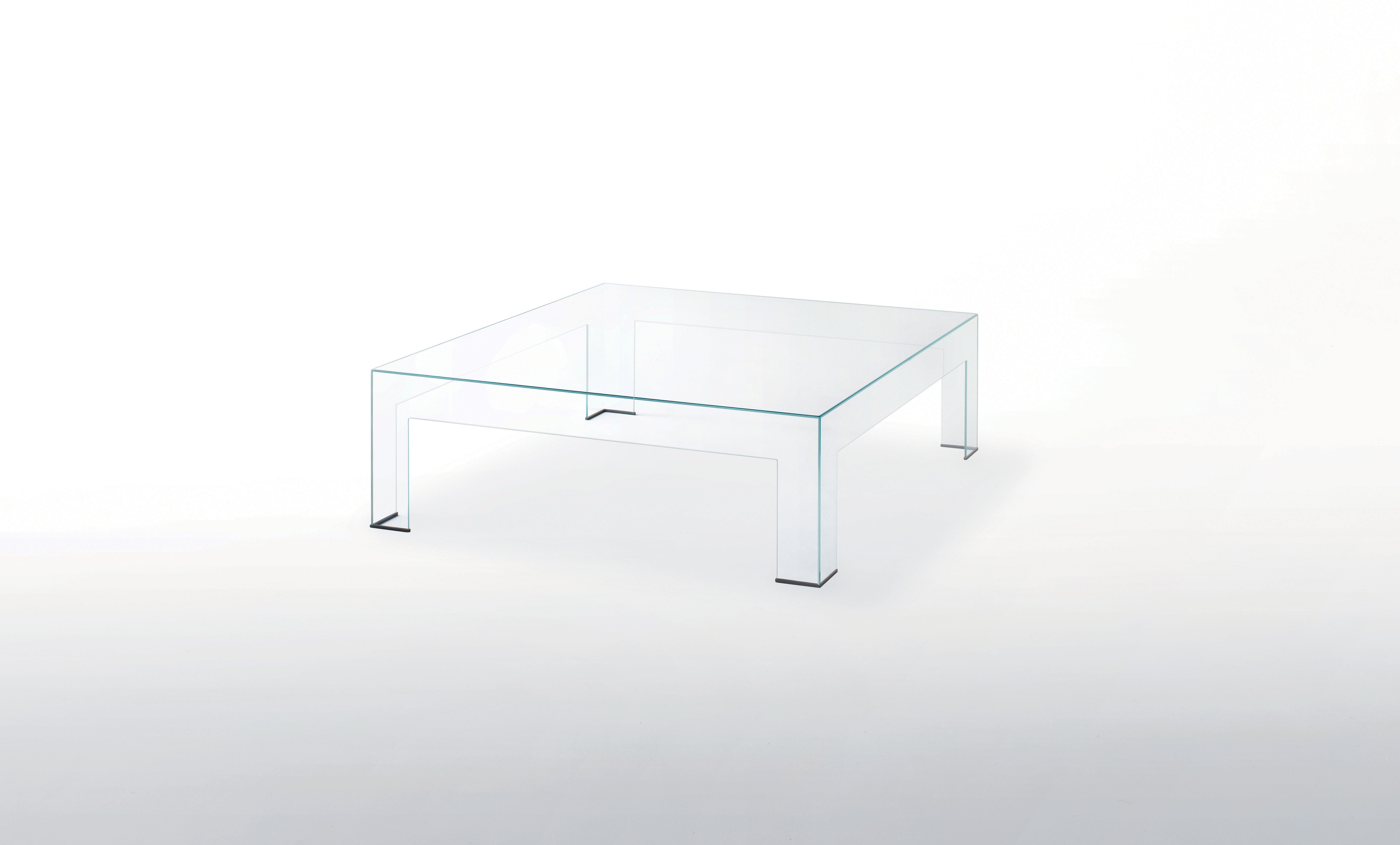 These low tables are made by bonding tempered glass plates that have been water jet-cut to 6 mm thick and have a 45° chamfered edge. The defining characteristics of these are their formal purity, simplicity, and sophisticated craftsmanship. They are available in extra light transparent glass or glossy lacquered versions.