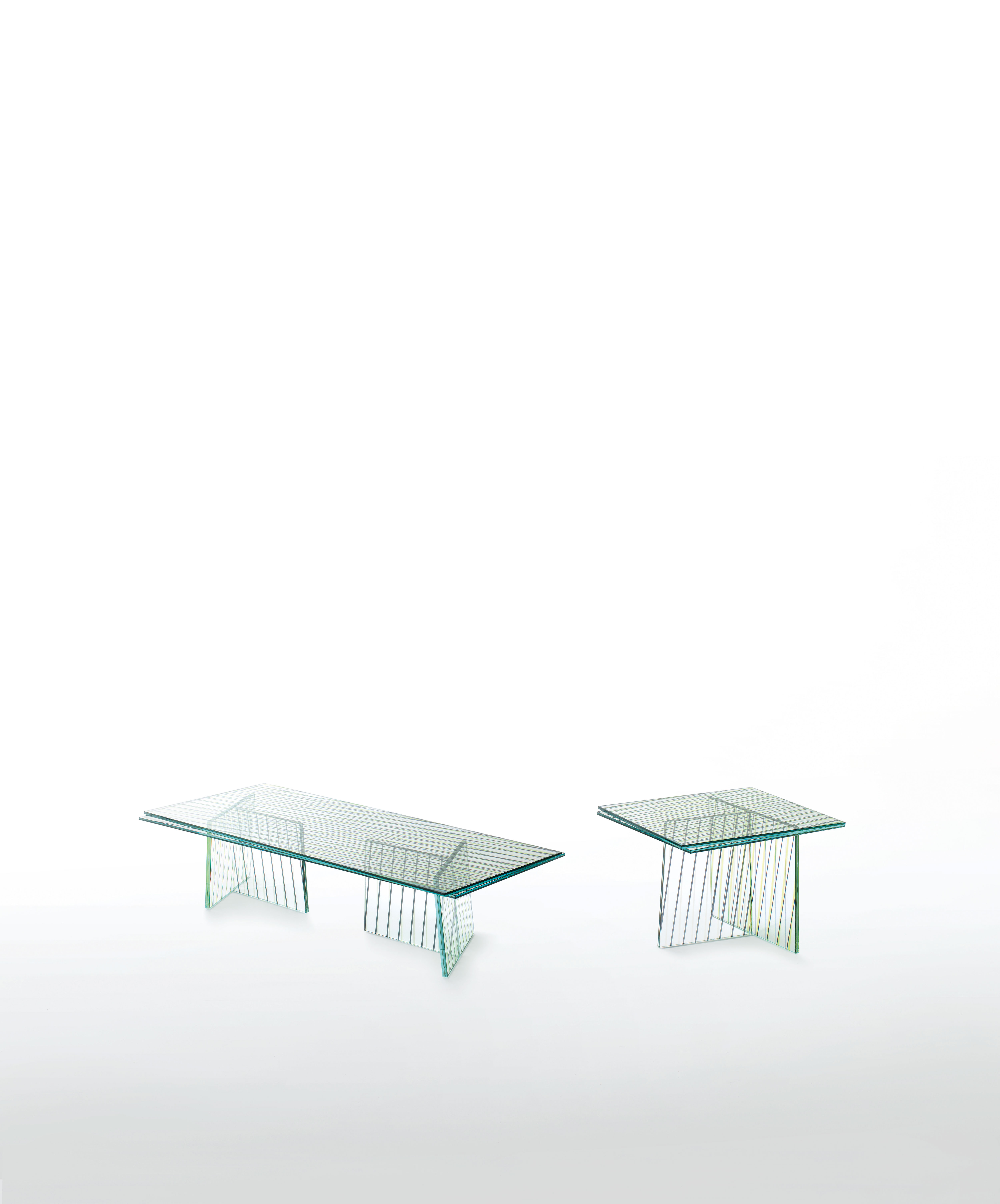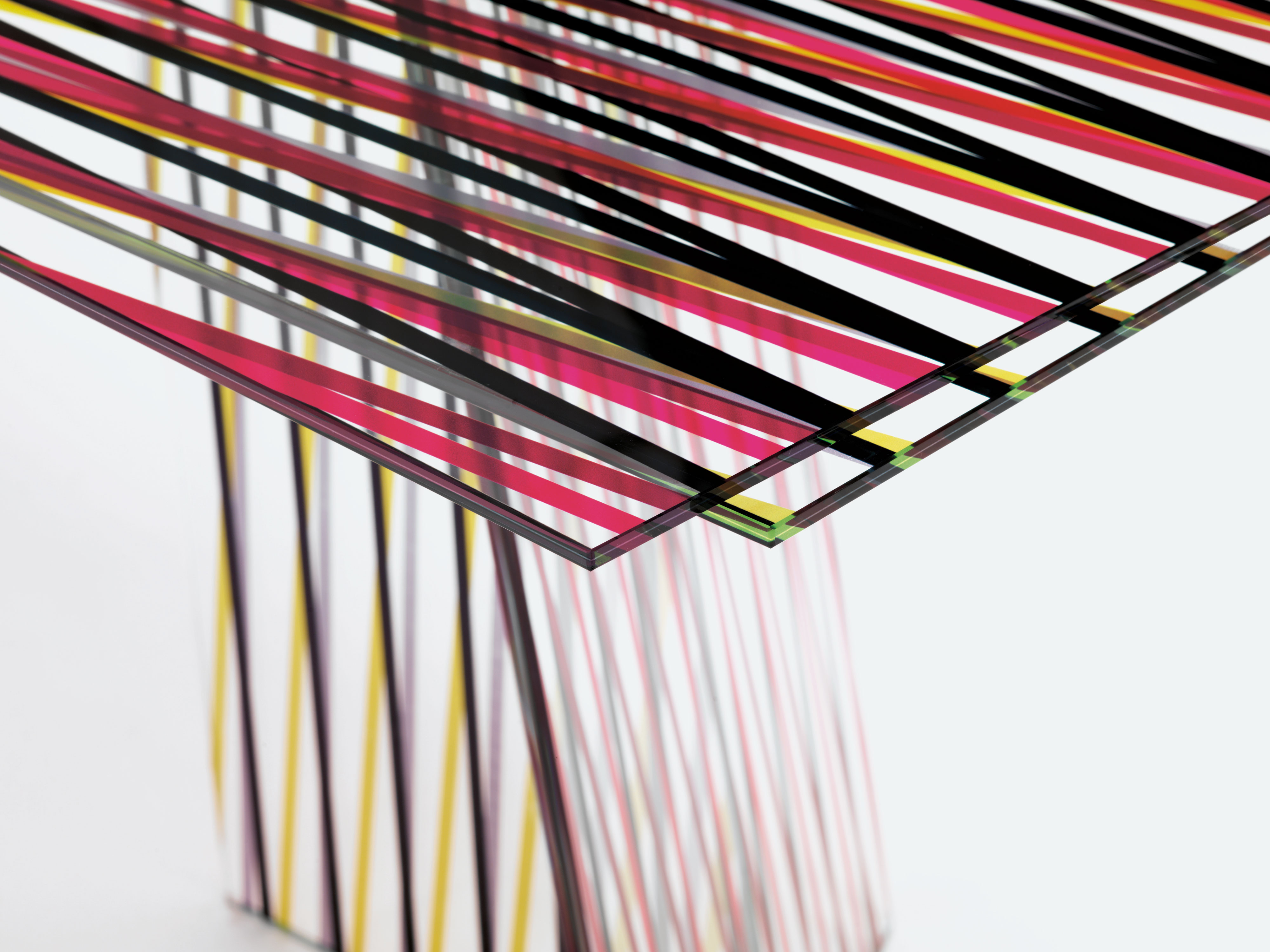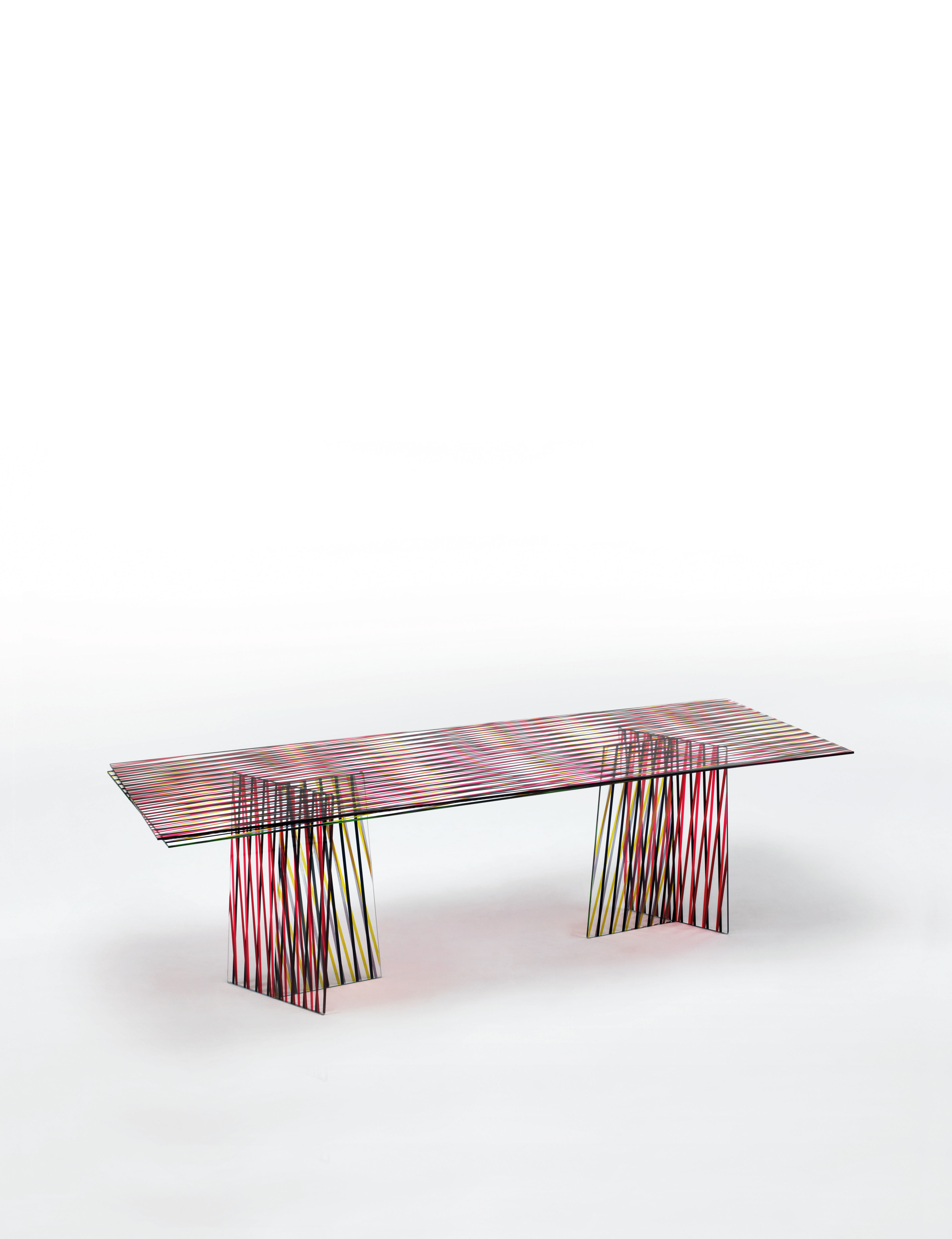 This range of high and low tables has a distinctive three-dimensional polychromatic decoration and is made of laminated transparent extra light glass. This elaborate decoration offers a dynamic visual experience that is constantly changing depending on the observer's point of view. It displays an enticing pattern of interwoven lines and colours. The haphazard assembly and overlapping of the crystal glass, achieved through a specialized laminating process, enhance the dynamic effect of the graphic. Like the tops, the bases are also asymmetrically shaped and composed of laminated transparent extra light glass. They are decorated and glued in a similar manner. Strong and visually appealing, the top and base have a single, cohesive design. The high and low tables come in two different decoration versions and a range of sizes.