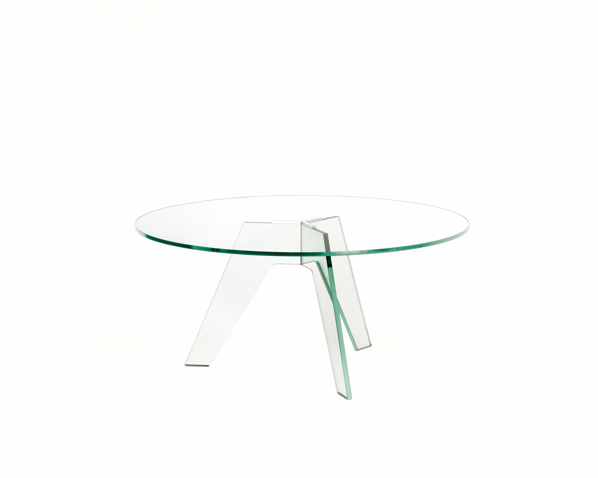 High table with 19 mm transparent glass top and 25 mm tempered transparent glass, UV bonded. Top and base are fixed to each other and are removable thanks to a sophisticated and elegant system of mirror polished stainless steel plates, perfectly finished in every detail. Discreet mirror polished stainless steel feet finish and embellish the table.