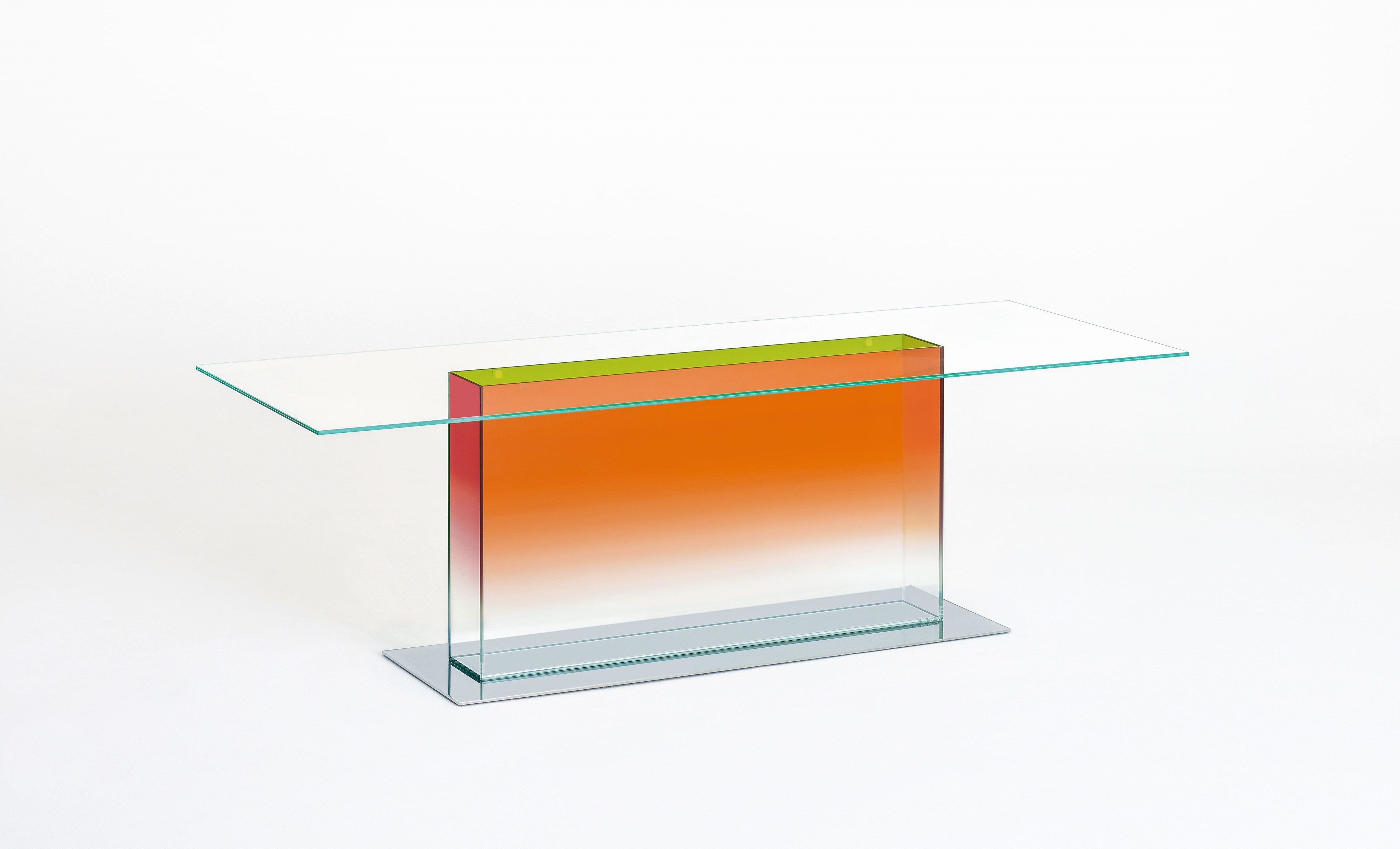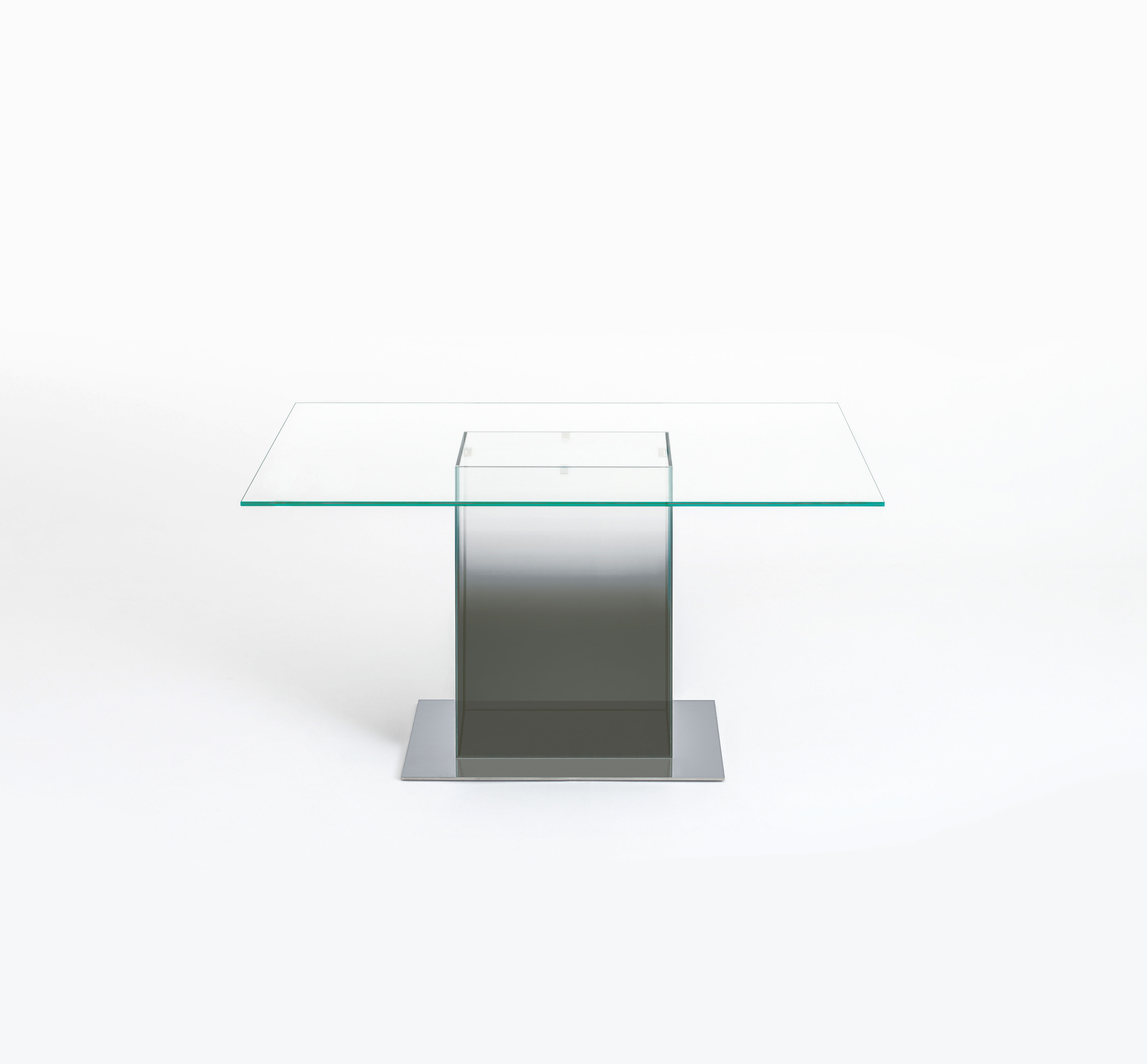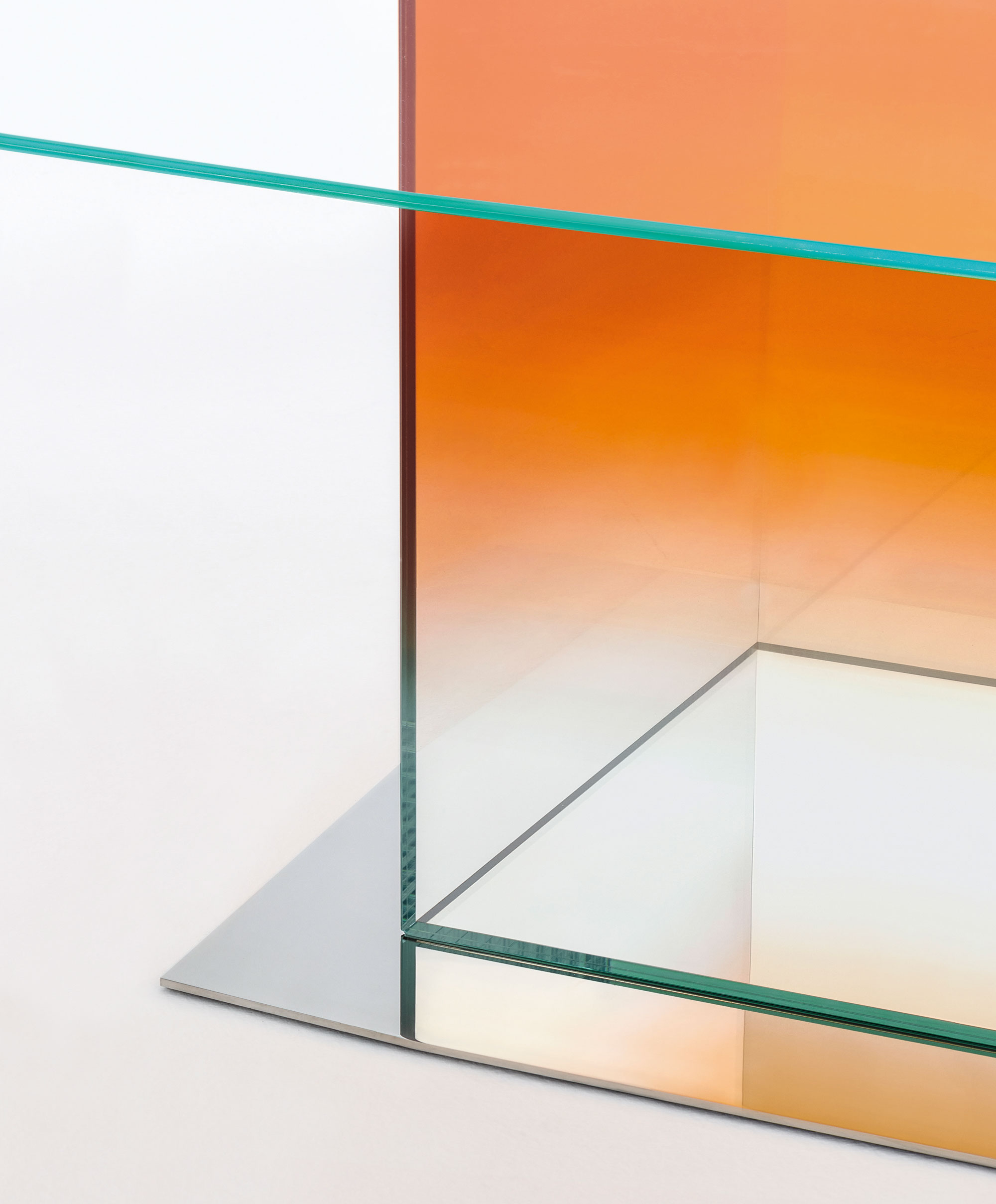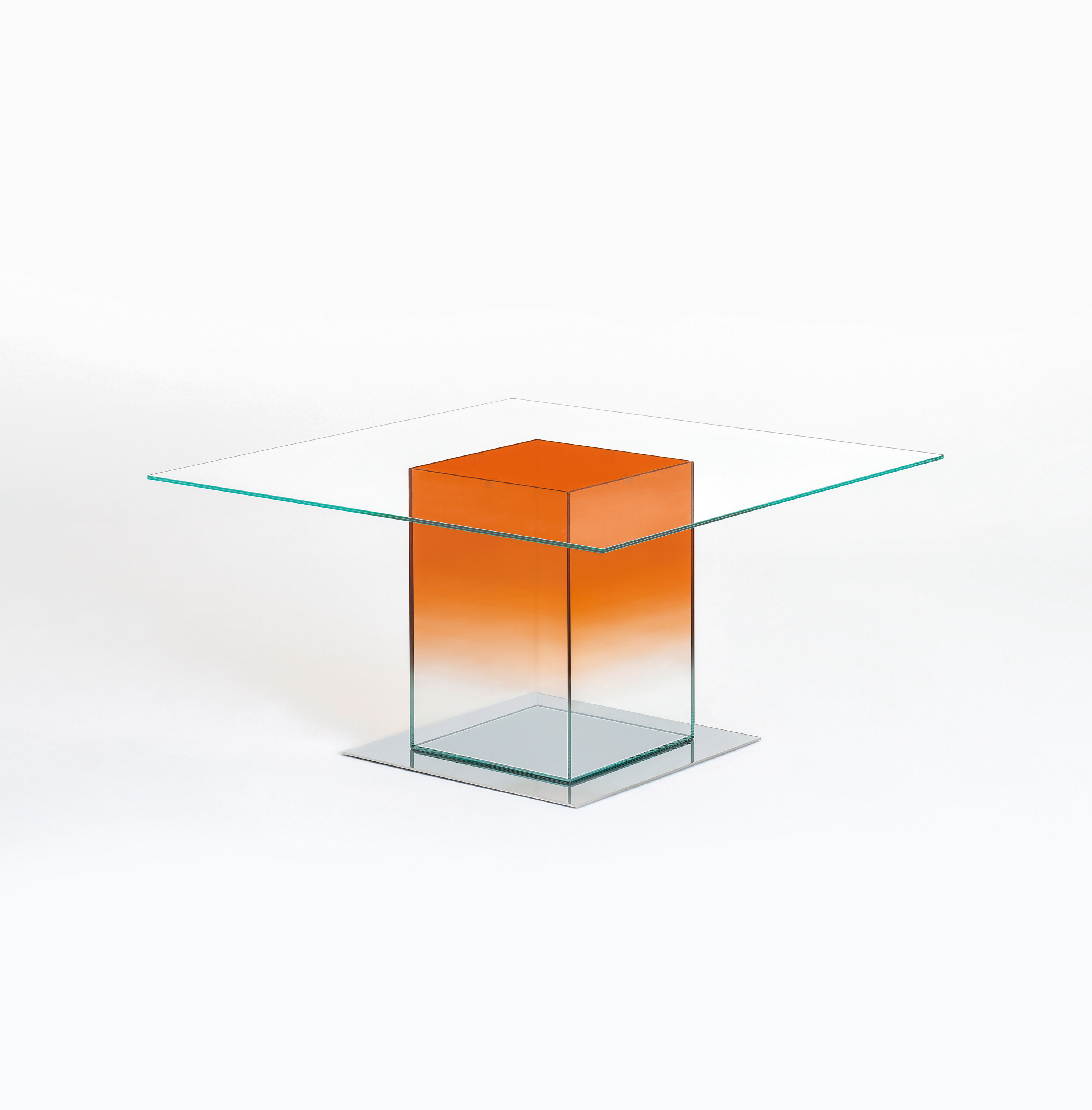 The 6+6 mm extra light glass on these square and rectangular high tables is laminated. Their bases are made of thick stainless-steel plates polished to a mirror finish, with coloured transparent glass volumes bonded at a 45-degree angle to produce a fading effect on top. Versions with descending or ascending gradations, such as orange or grey tones, or a multi-chromatic effect, wherein various coloured sides blend together when they overlap with the transparency of the glass, are also available. An intricate system of interlocking mirror-polished stainless-steel elements fixed to glass holds the top to the base together.
